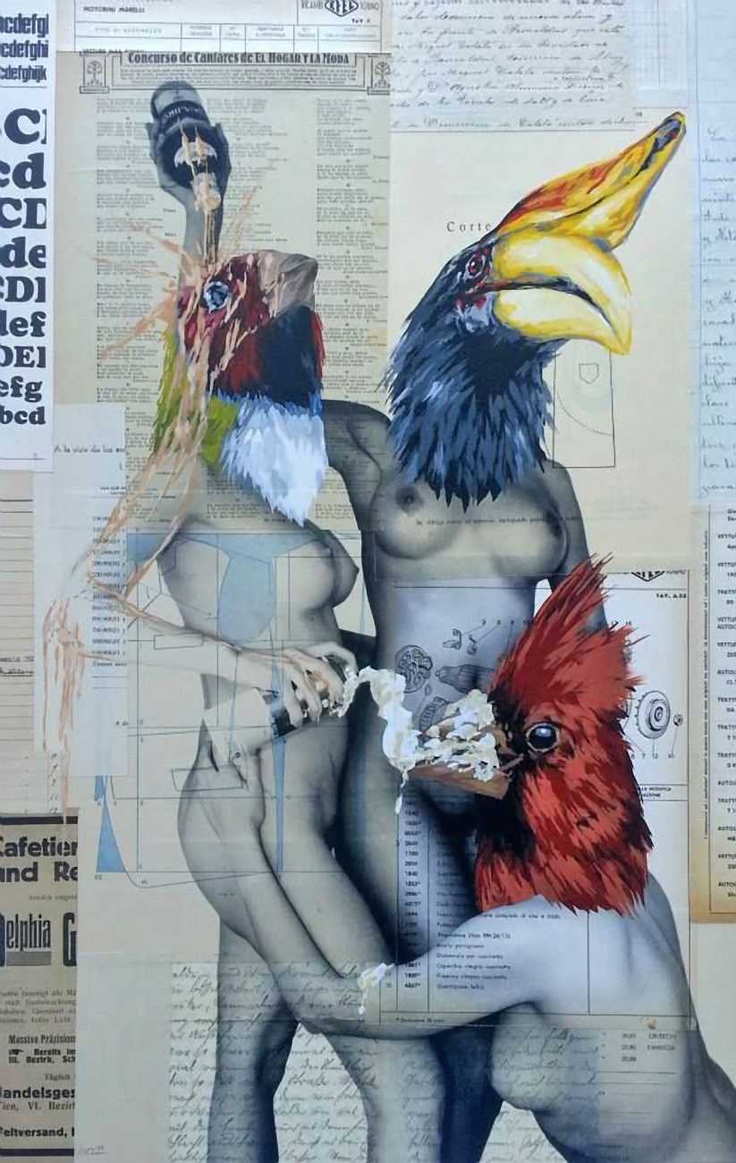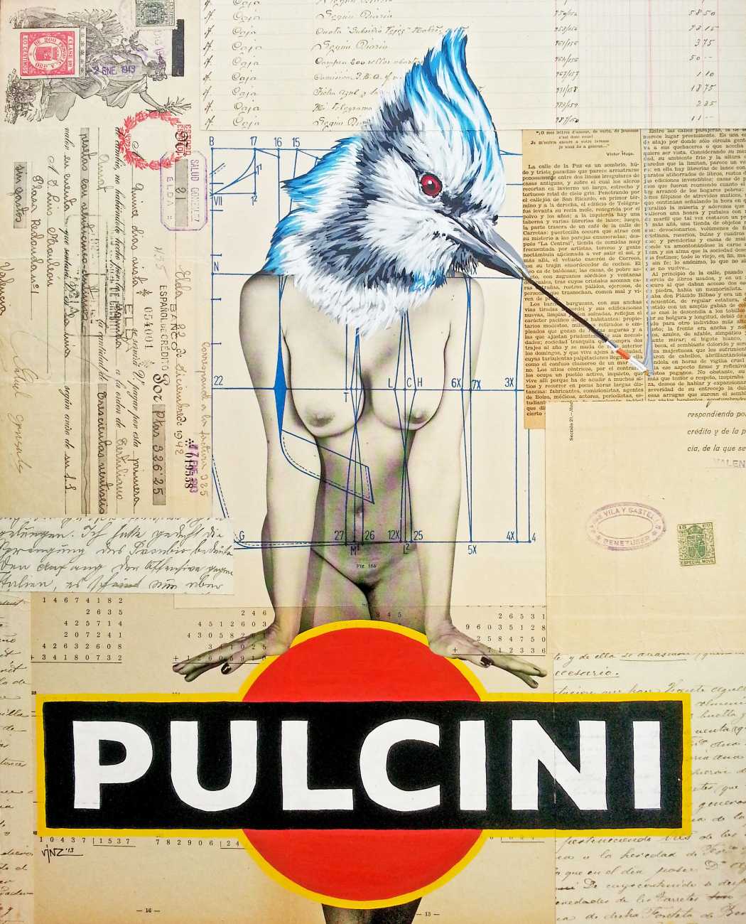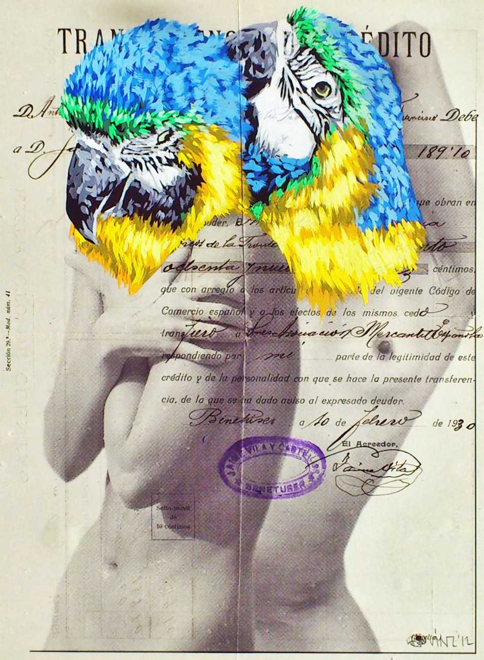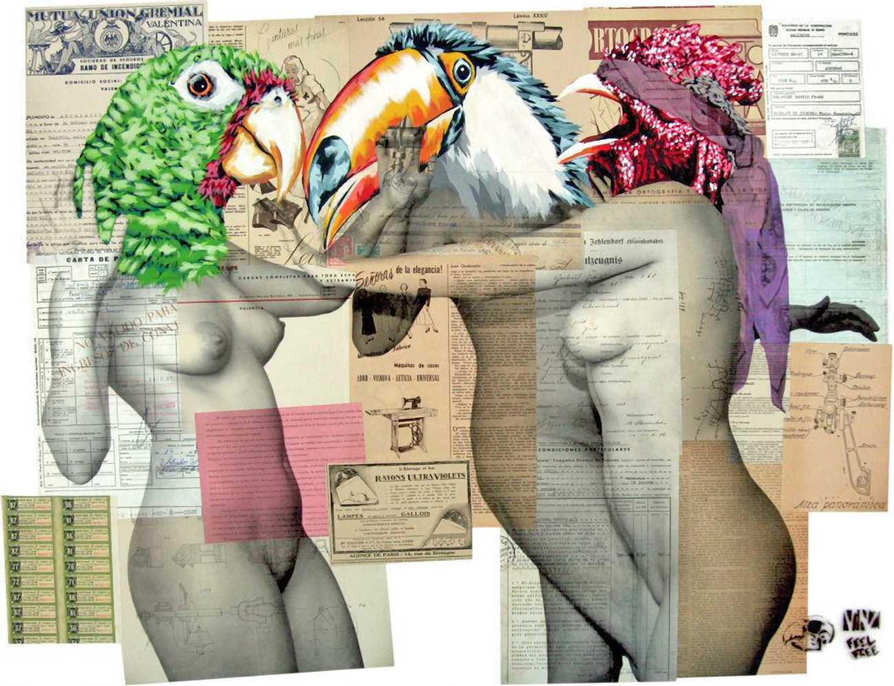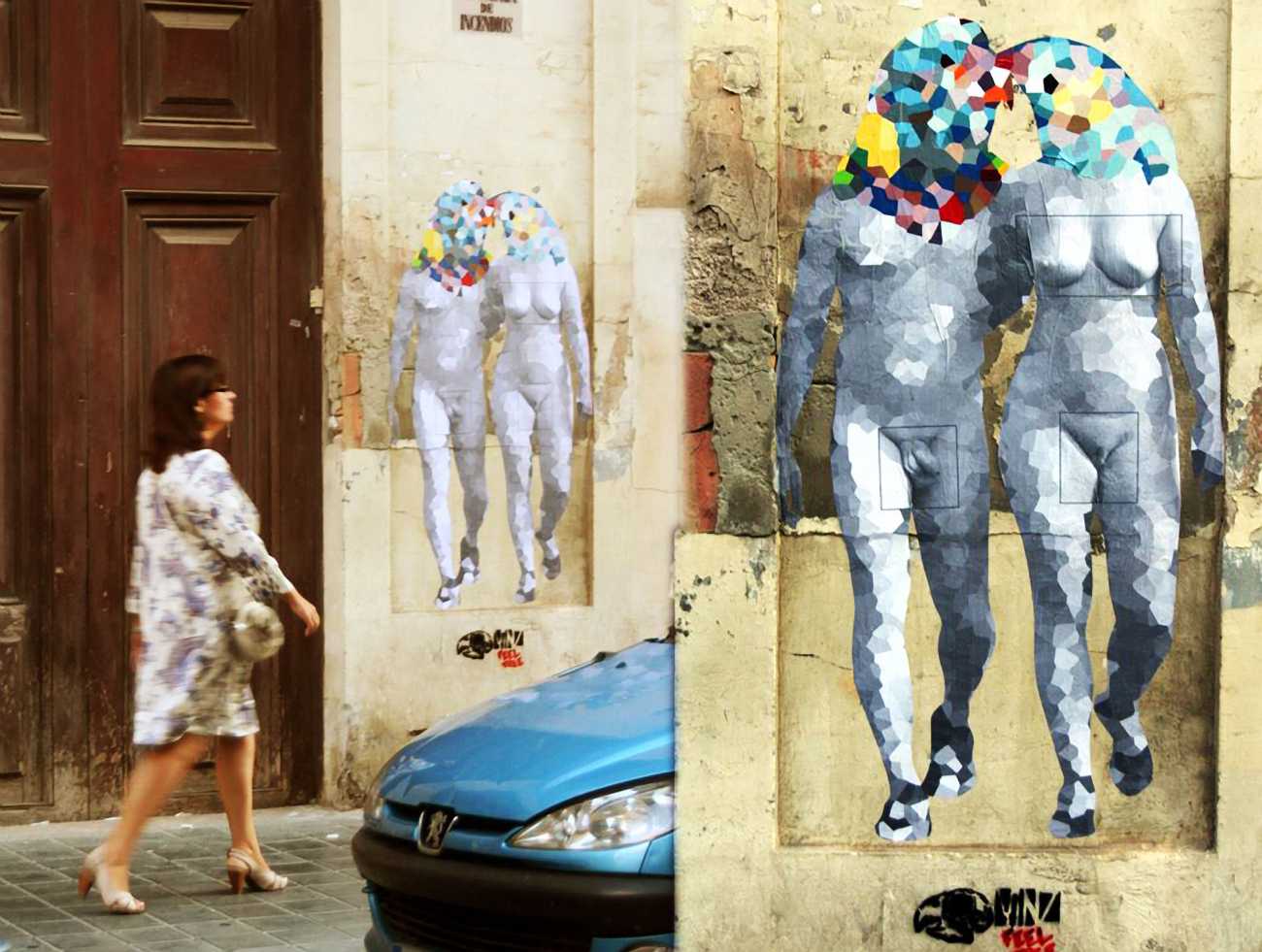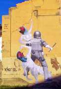 During the 5th Valencis Incubarte Festival in 2012 he created the wall art entitled No tú tú teme (Don't Be Afraid) in the neighbourhood of El Carmen de Valencia, showing three riot police officers deploying their batons against three women with naked bodies and birds’ heads. He created it partly as a tribute to the wives of miners from Asturias, León and Teruel who had begun a march towards Madrid in support of workers’ rights. When the mural was painted over, apparently by police officers, leaving the naked figures but eliminating the police figures, it generated a controversy in the media that reached the Congress of Deputies. In 2020 the complete restored work was acquired and incorporated into the Contemporary Art Collection of the Generalitat Valenciana. Since then murals by Vinz have been integrated into the French Institute of Valencia (La Marca €spaña, 2013) , the Circular Room of the Valencia City Council (Nosaltres el Poble, 2015), the Valencia Museum of Illustration and Modernity MUVIM (Gràcies!, 2020), and the Saló de Corts of the Palace of the Valencian Government in 2021.
