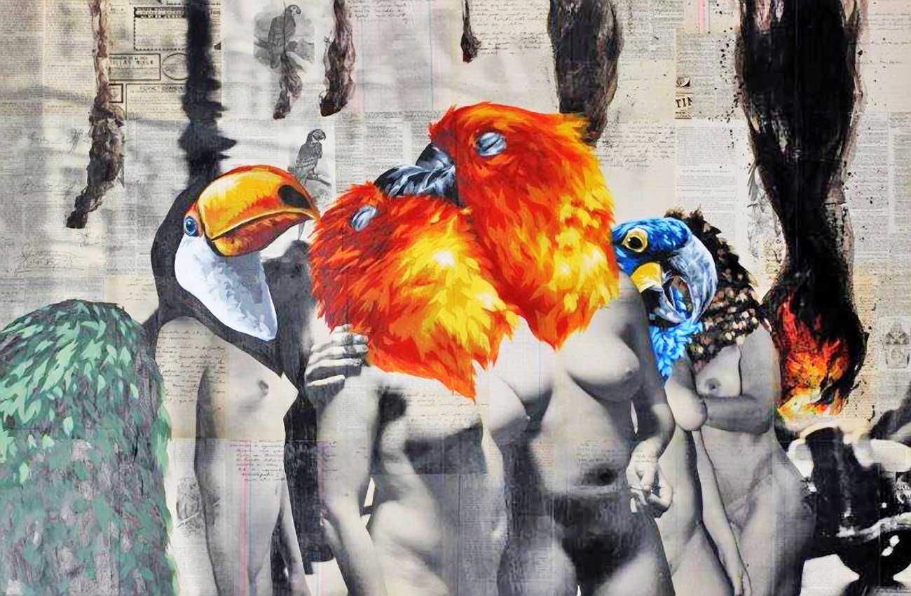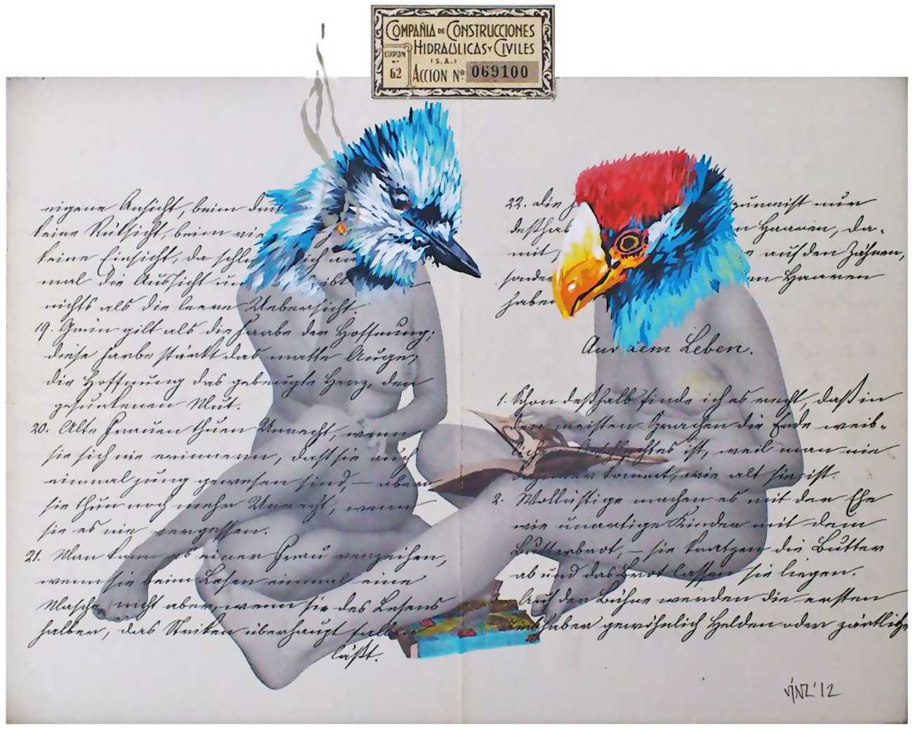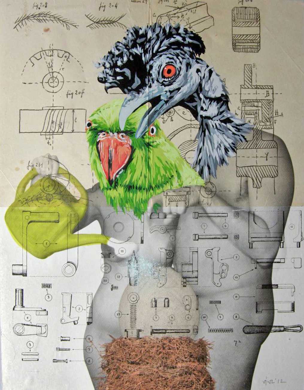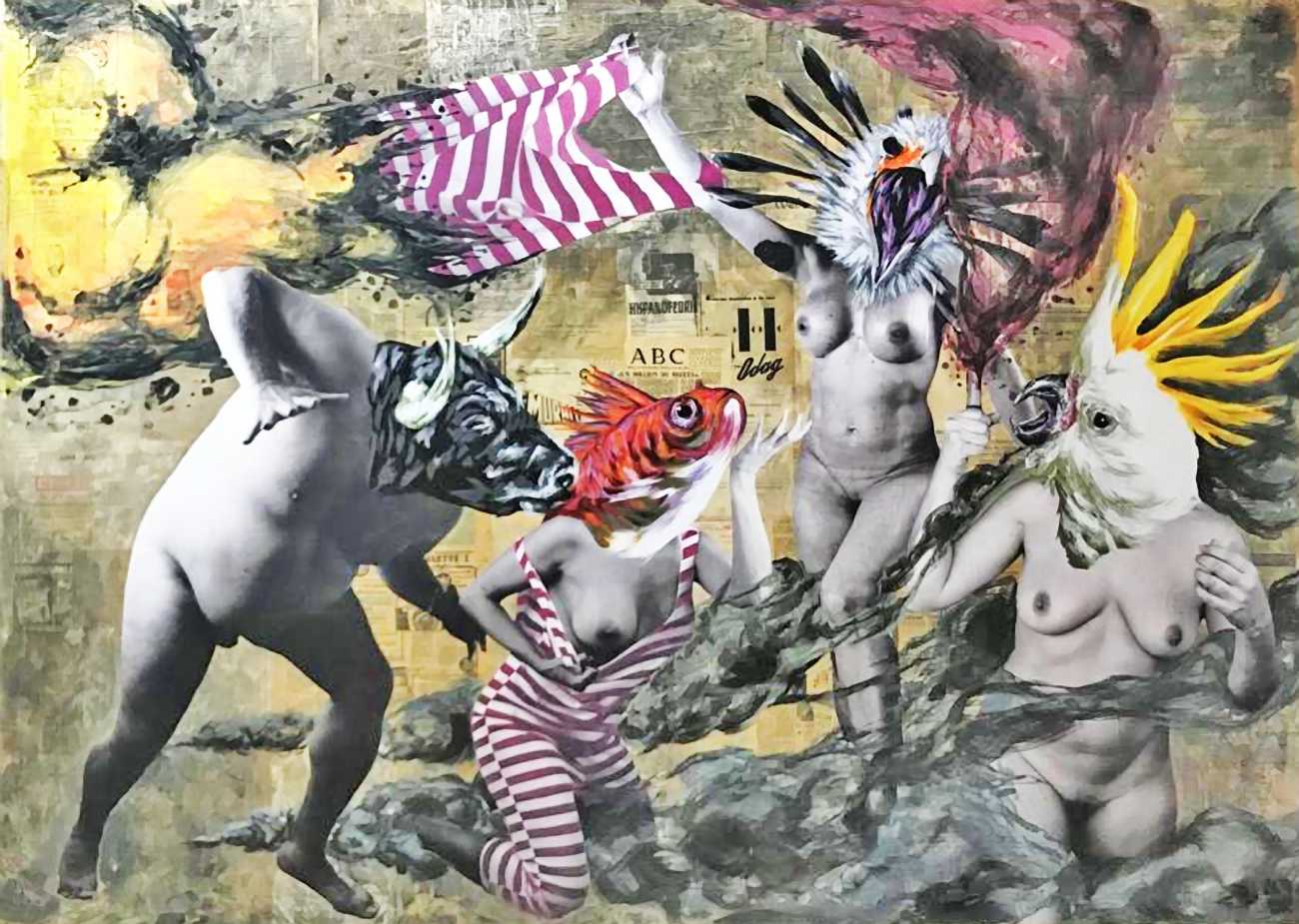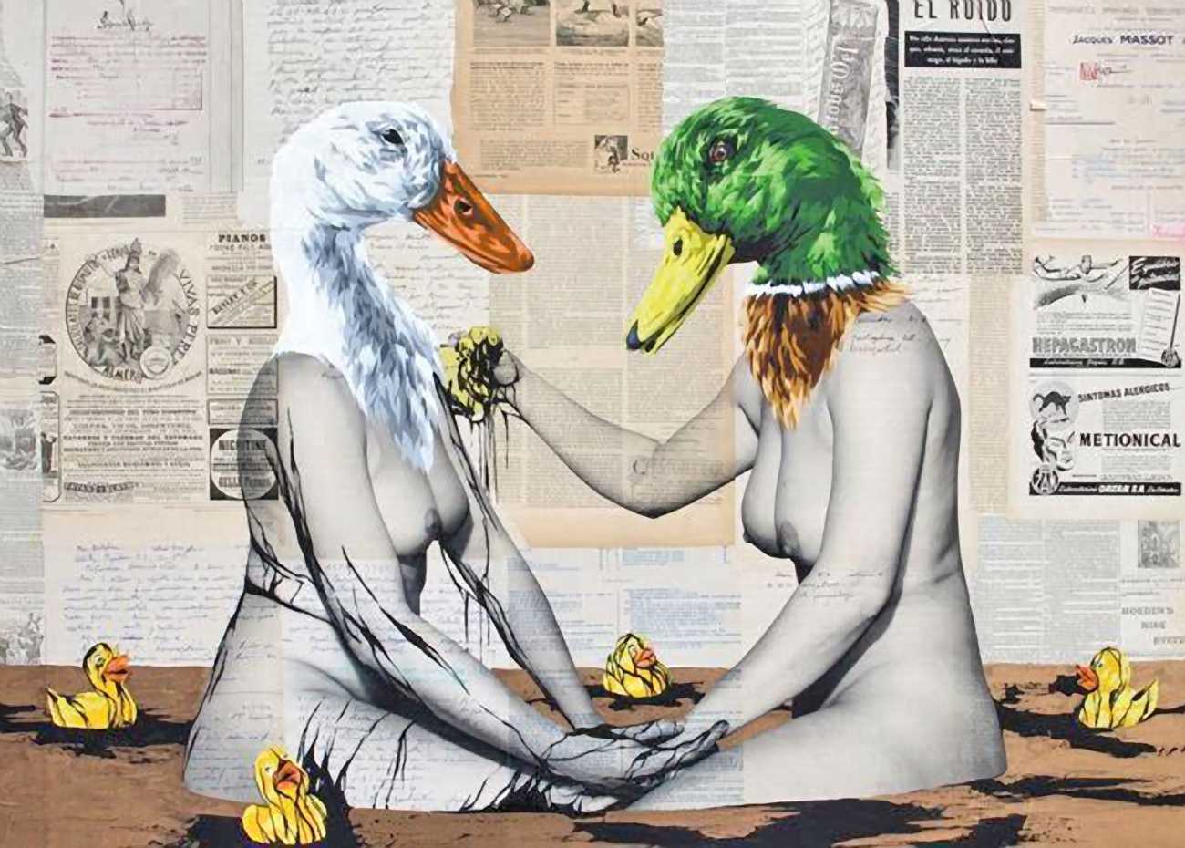 During the 5th Valencis Incubarte Festival in 2012 he created the wall art entitled No tú tú teme (Don't Be Afraid) in the neighbourhood of El Carmen de Valencia, showing three riot police officers deploying their batons against three women with naked bodies and birds’ heads. He created it partly as a tribute to the wives of miners from Asturias, León and Teruel who had begun a march towards Madrid in support of workers’ rights. When the mural was painted over, apparently by police officers, leaving the naked figures but eliminating the police figures, it generated a controversy in the media that reached the Congress of Deputies. In 2020 the complete restored work was acquired and incorporated into the Contemporary Art Collection of the Generalitat Valenciana. Since then murals by Vinz have been integrated into the French Institute of Valencia (La Marca €spaña, 2013) , the Circular Room of the Valencia City Council (Nosaltres el Poble, 2015), the Valencia Museum of Illustration and Modernity MUVIM (Gràcies!, 2020), and the Saló de Corts of the Palace of the Valencian Government in 2021.