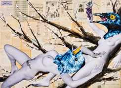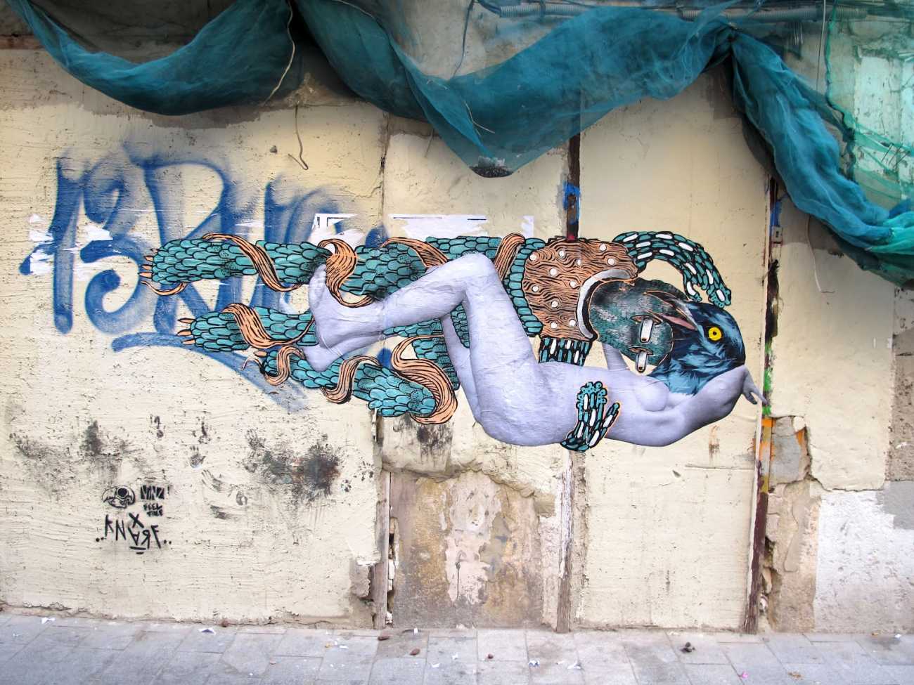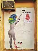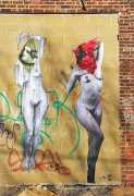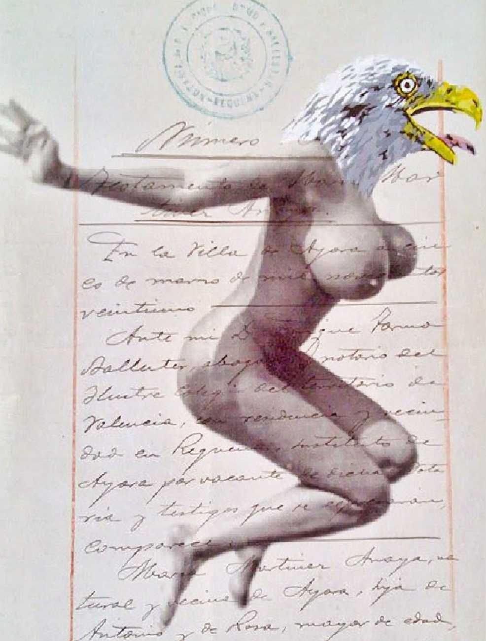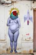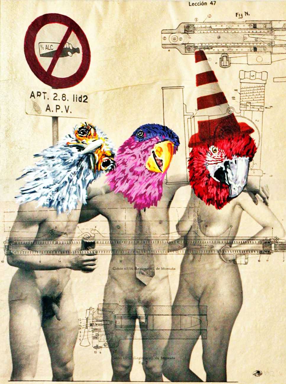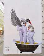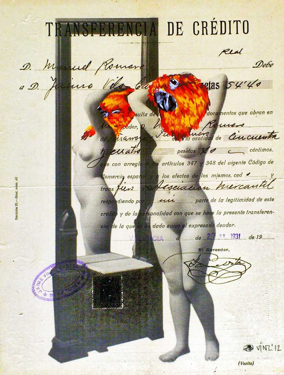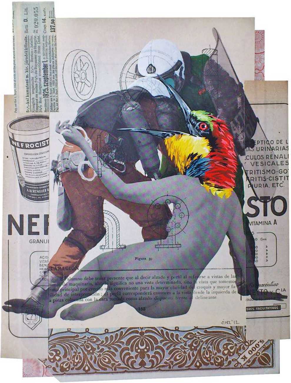 During the 5th Valencis Incubarte Festival in 2012 he created the wall art entitled No tú tú teme (Don't Be Afraid) in the neighbourhood of El Carmen de Valencia, showing three riot police officers deploying their batons against three women with naked bodies and birds’ heads. He created it partly as a tribute to the wives of miners from Asturias, León and Teruel who had begun a march towards Madrid in support of workers’ rights. When the mural was painted over, apparently by police officers, leaving the naked figures but eliminating the police figures, it generated a controversy in the media that reached the Congress of Deputies. In 2020 the complete restored work was acquired and incorporated into the Contemporary Art Collection of the Generalitat Valenciana. Since then murals by Vinz have been integrated into the French Institute of Valencia (La Marca €spaña, 2013) , the Circular Room of the Valencia City Council (Nosaltres el Poble, 2015), the Valencia Museum of Illustration and Modernity MUVIM (Gràcies!, 2020), and the Saló de Corts of the Palace of the Valencian Government in 2021.