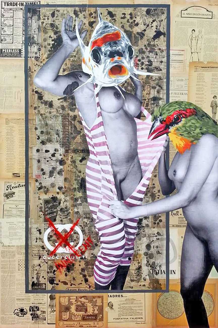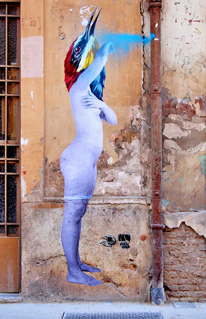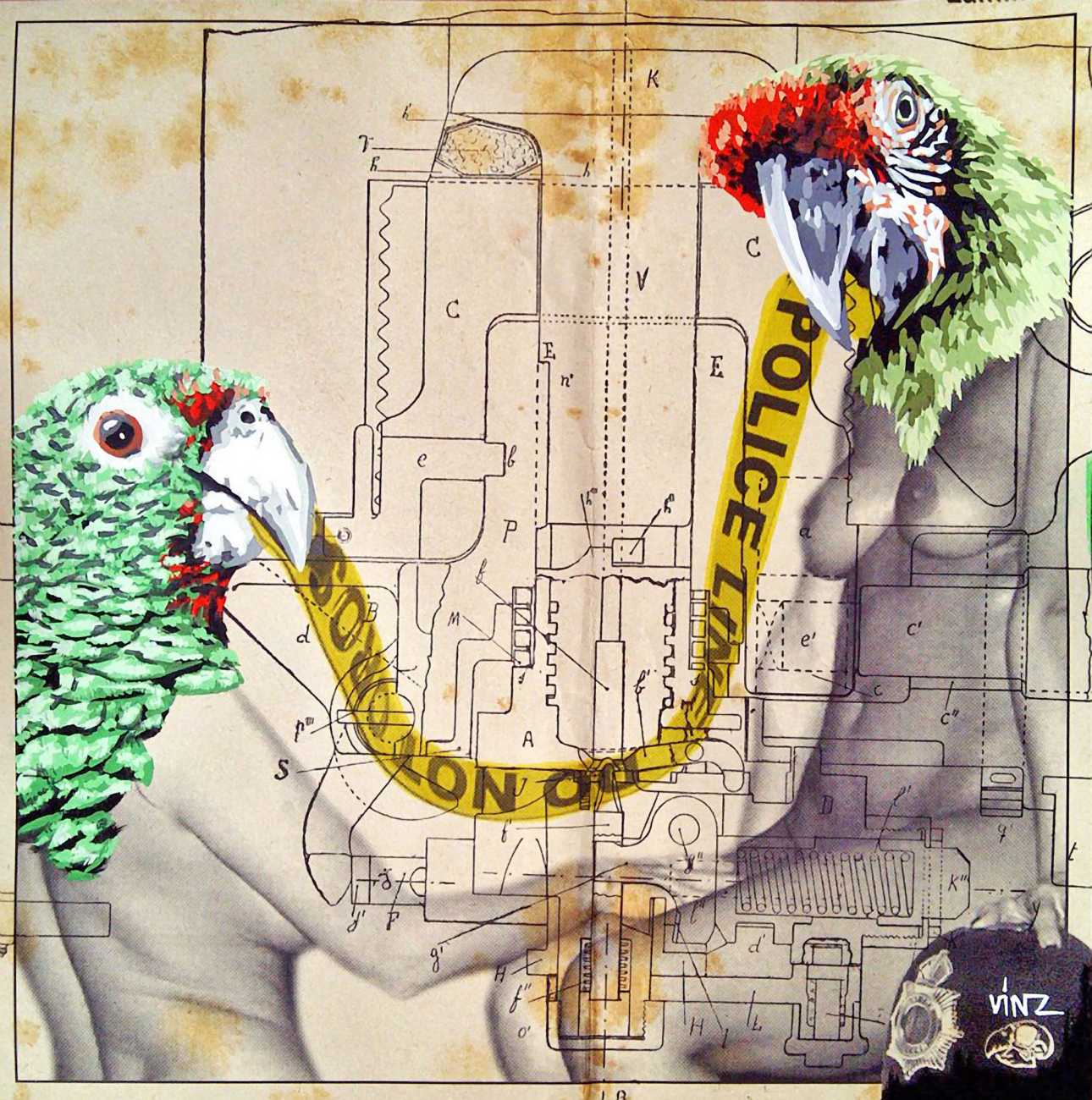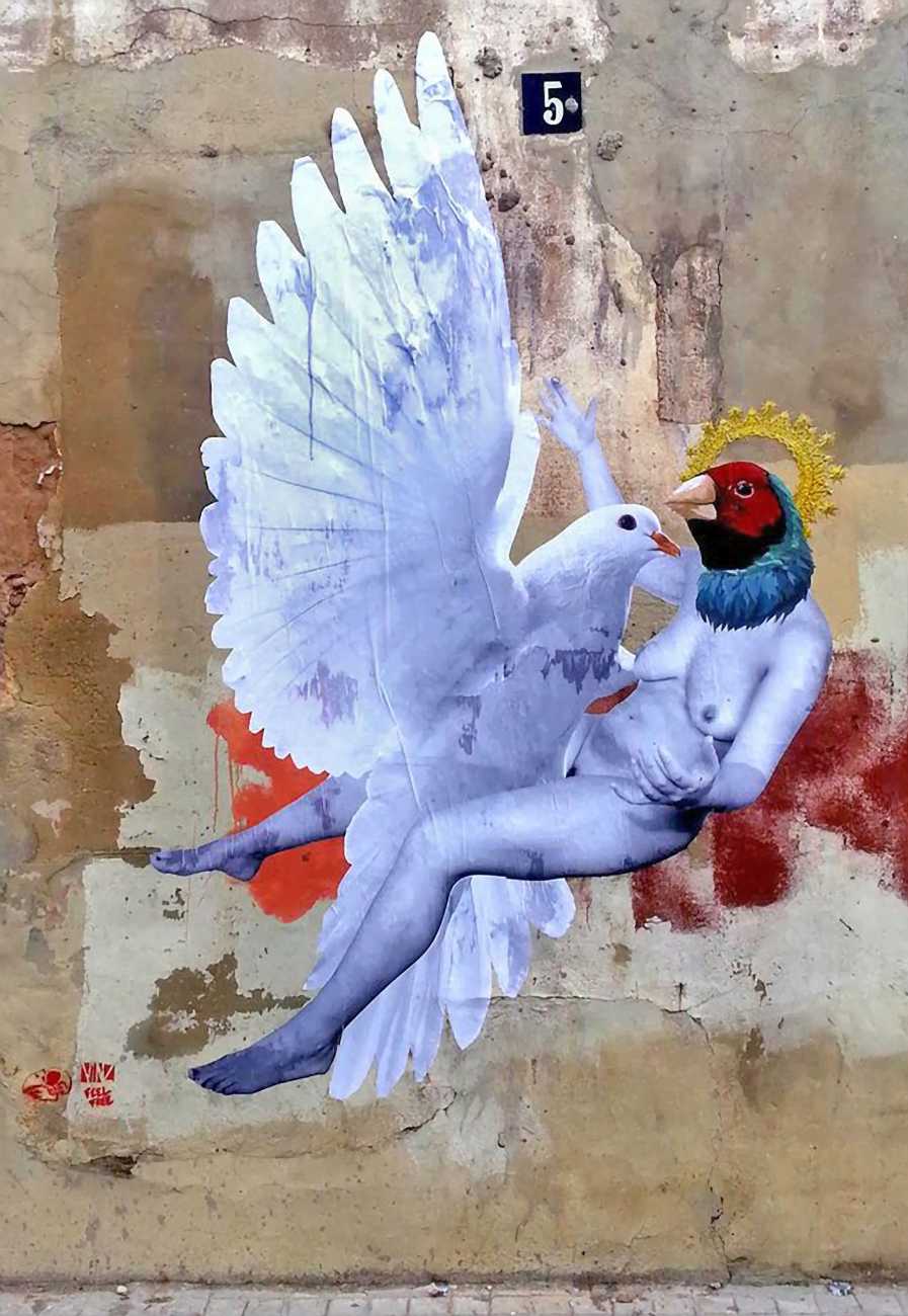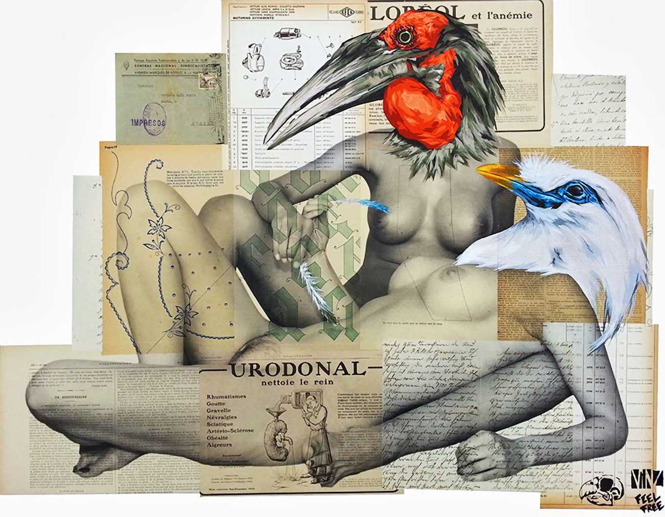 The artist who goes simply by the name of Vinz grew up, studied, and still works in the Spanish city of Valencia, one of the world’s hotspots of urban art. He graduated from the Faculty of Fine Arts of San Carlos Polytechnic University in 2003, and quickly gained a name for himself with large canvases combining collage, stencil work and painting. Influenced by street artists like Banksy and Miss Van, Vinz found a new arena for his work by starting to create large-scale outdoor works, to begin with in the streets of Valencia but more recently in other cities in Europe and North America.