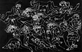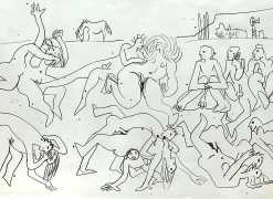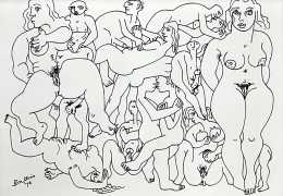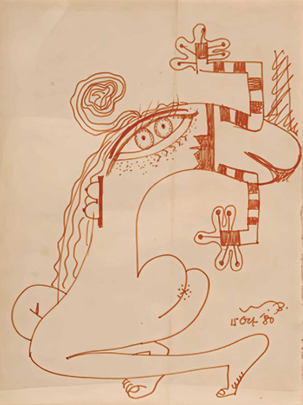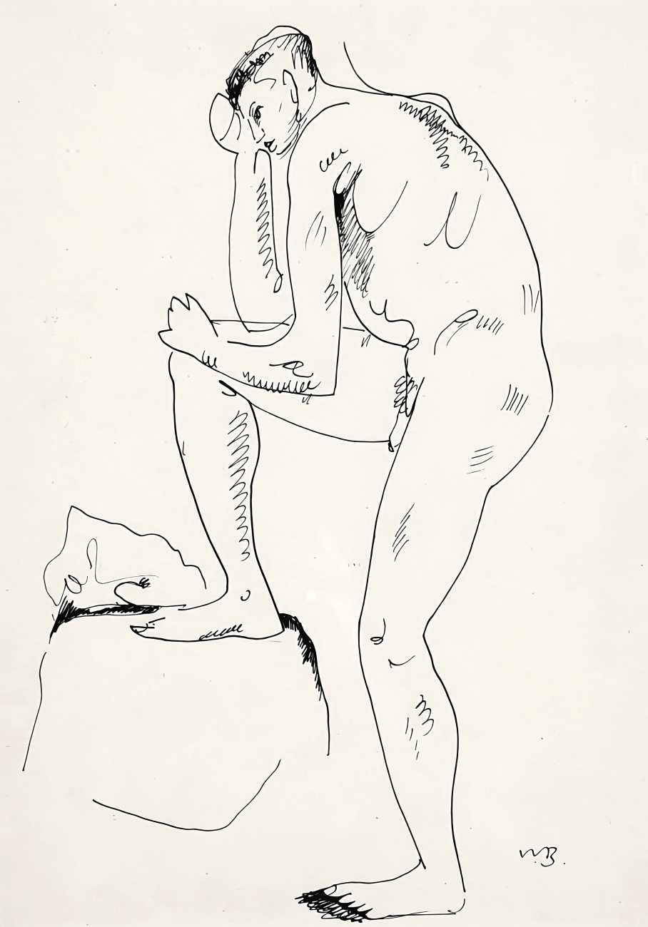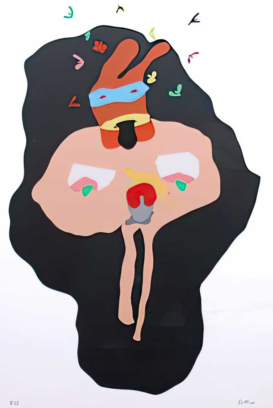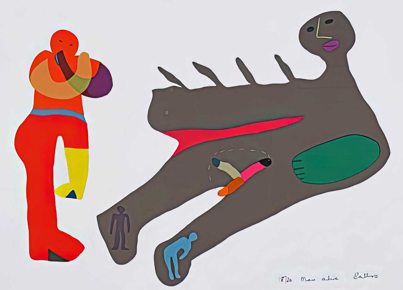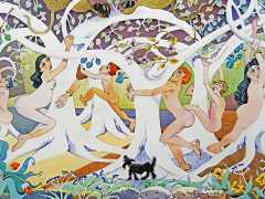 In 1938 he visited Europe for the first time and met the influential archaeologist, anthropologist, ethnologist and geologist Abbé Henri Breuil. He married Grace Anderson, a pioneering art educationalist, in 1940, and it was around this time that Battiss’ previously realistic style of painting began to take on a hieratic, symbolist character. While exhibiting a collection of South African art with the International Art Club in Italy in 1949, Battiss had his first meeting with Pablo Picasso and the futurist Gino Severini. Both artists made a strong impression on him, and the influence of their work can clearly be seen in his art.