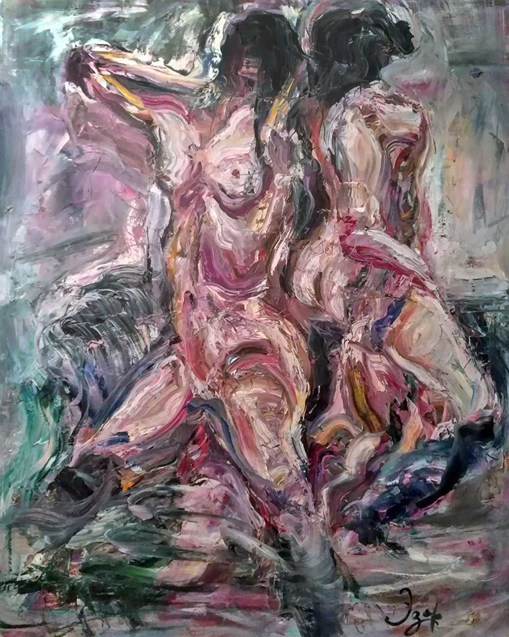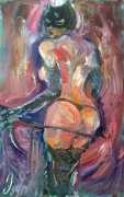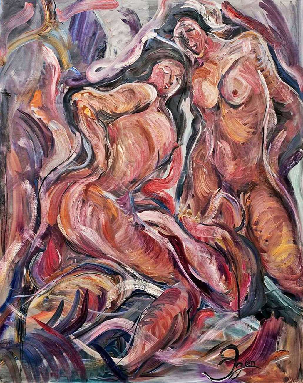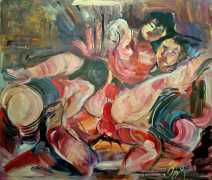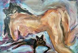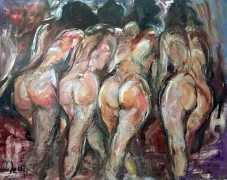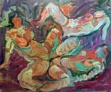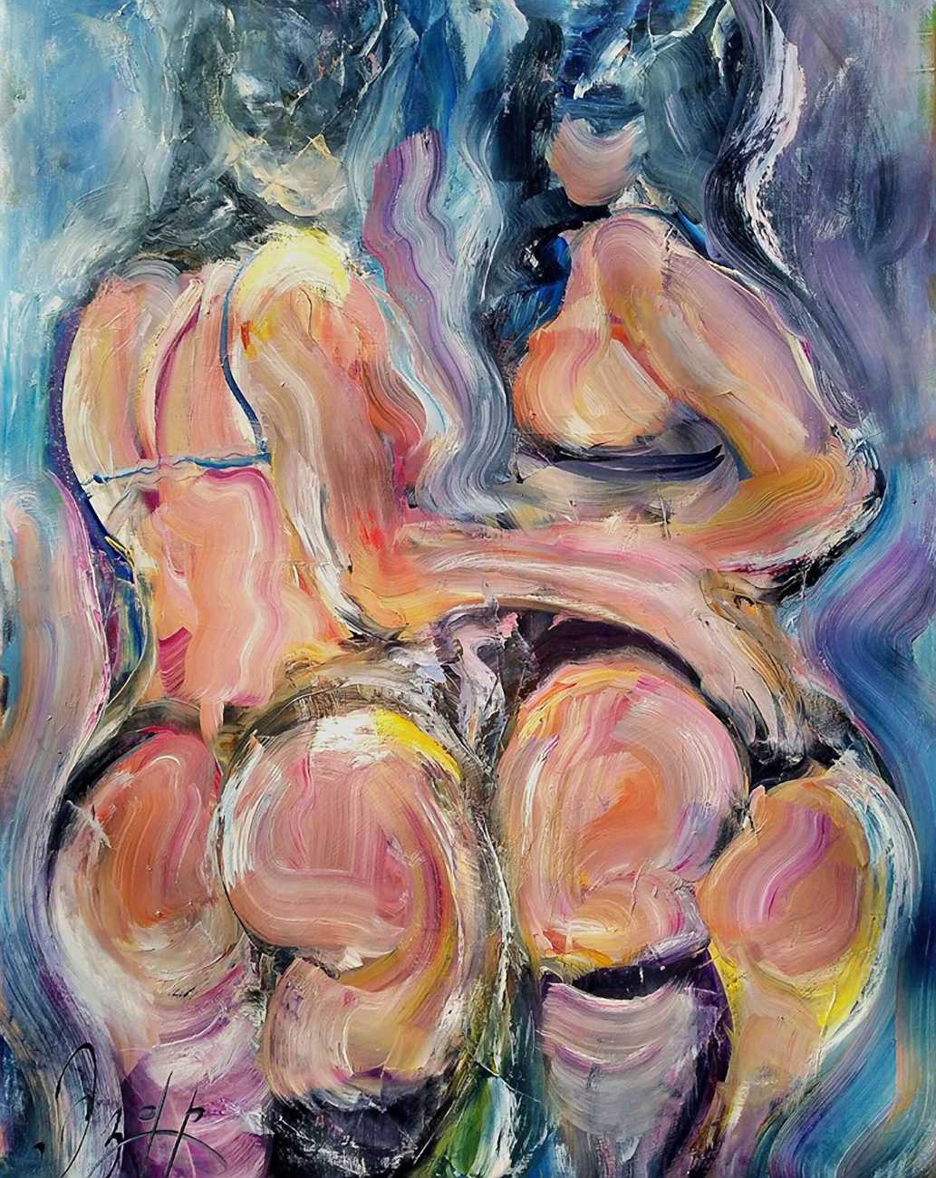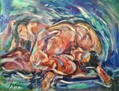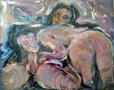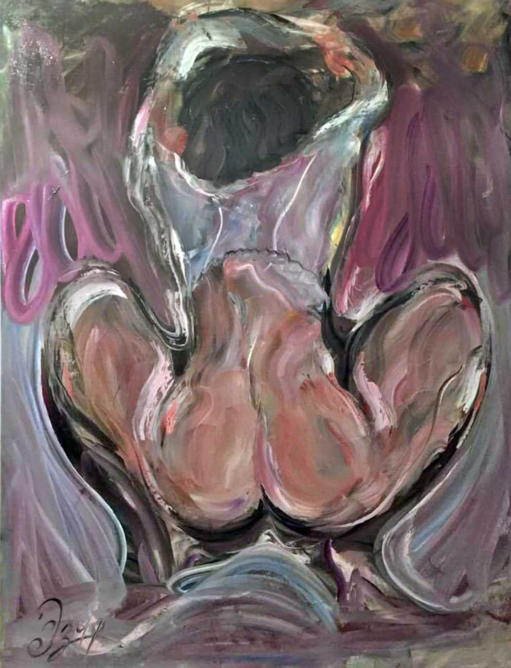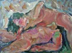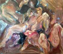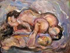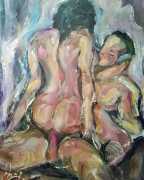 Her trademark style of erotic painting is to fill her canvases, often large ones, with bold, colourful, yet carefully worked paint, mirroring the joyful energetic power of satisfying intimacy.