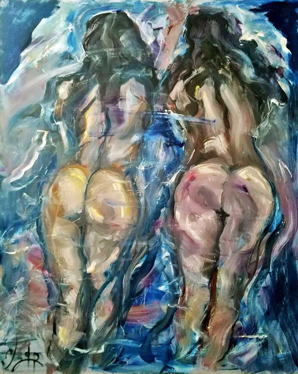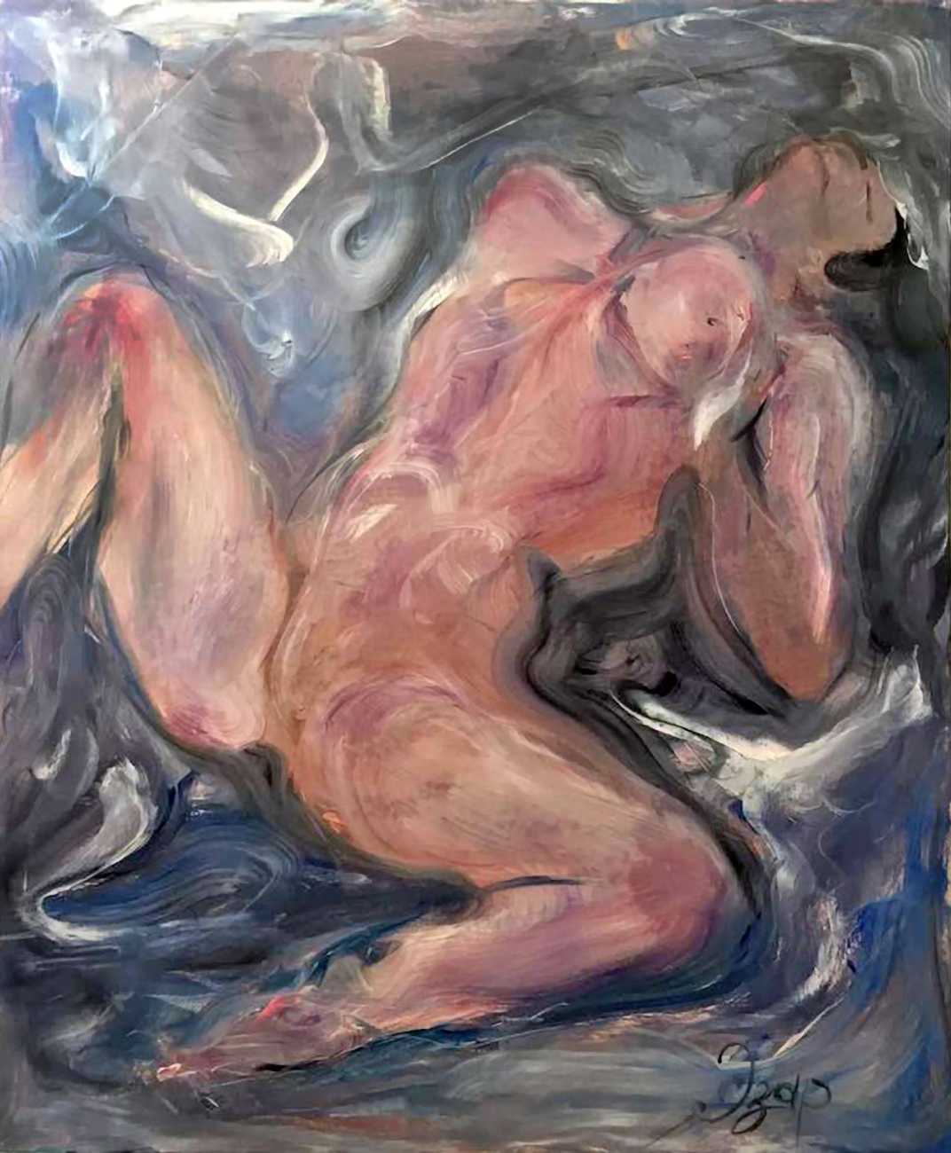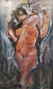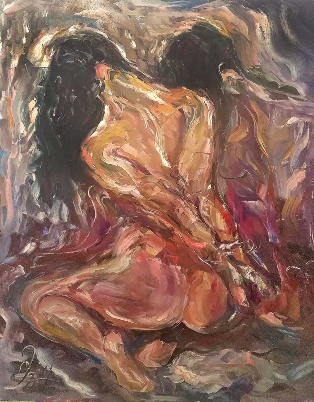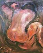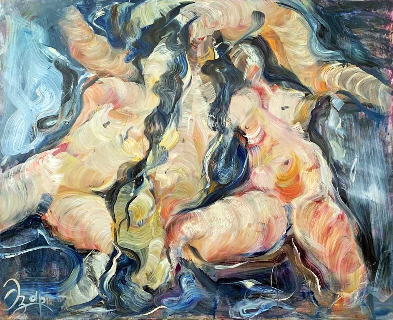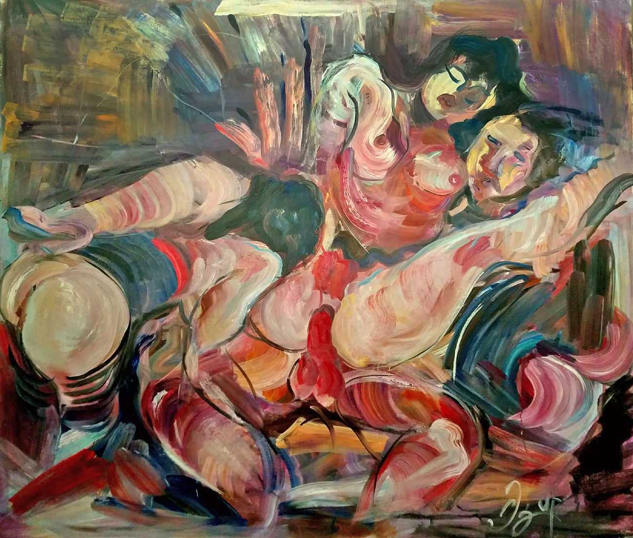 Her trademark style of erotic painting is to fill her canvases, often large ones, with bold, colourful, yet carefully worked paint, mirroring the joyful energetic power of satisfying intimacy.
