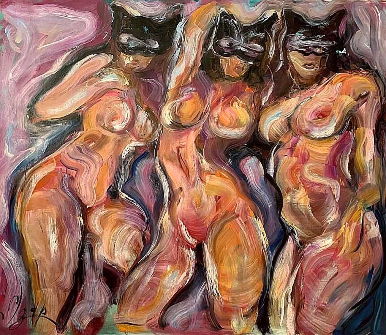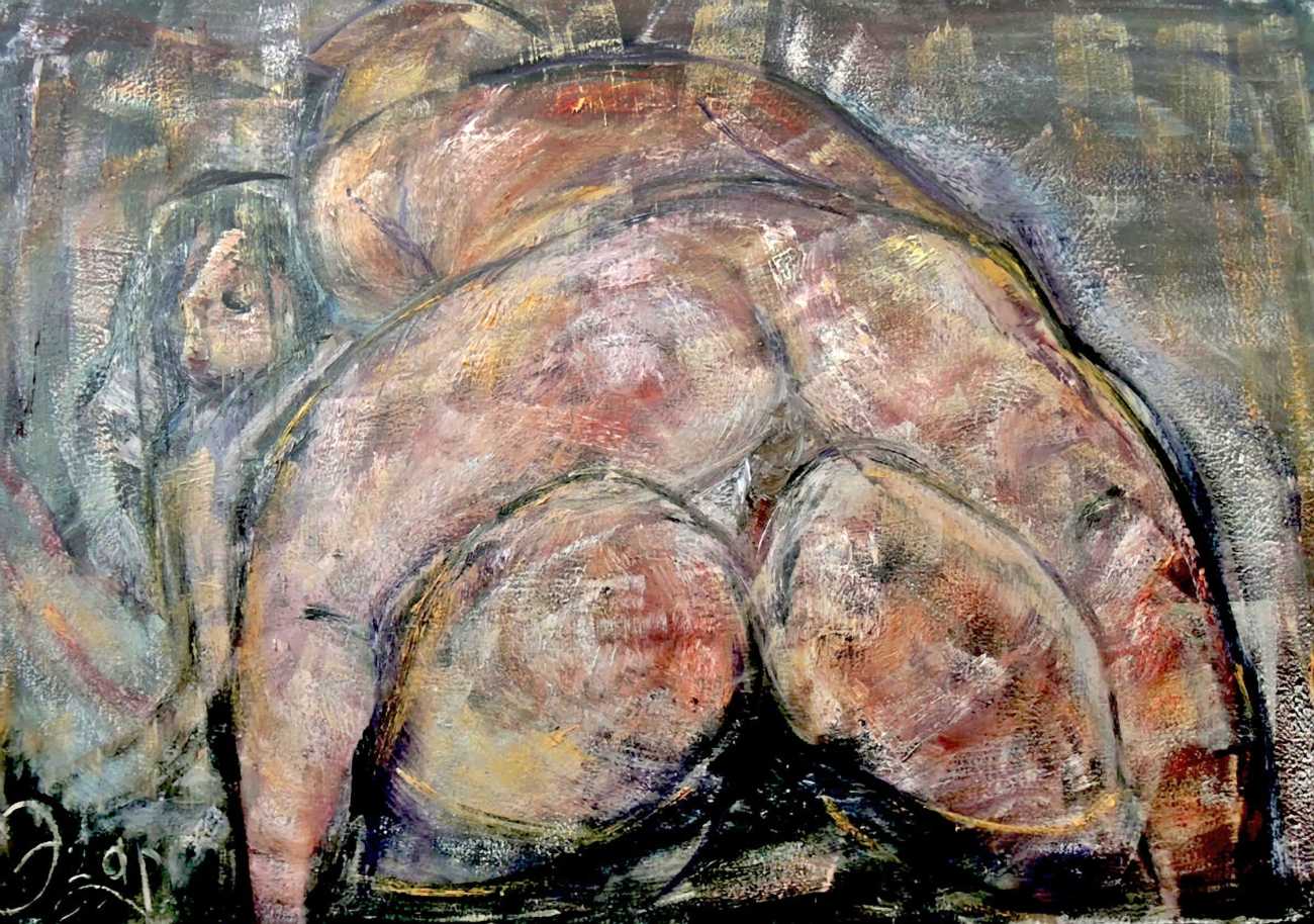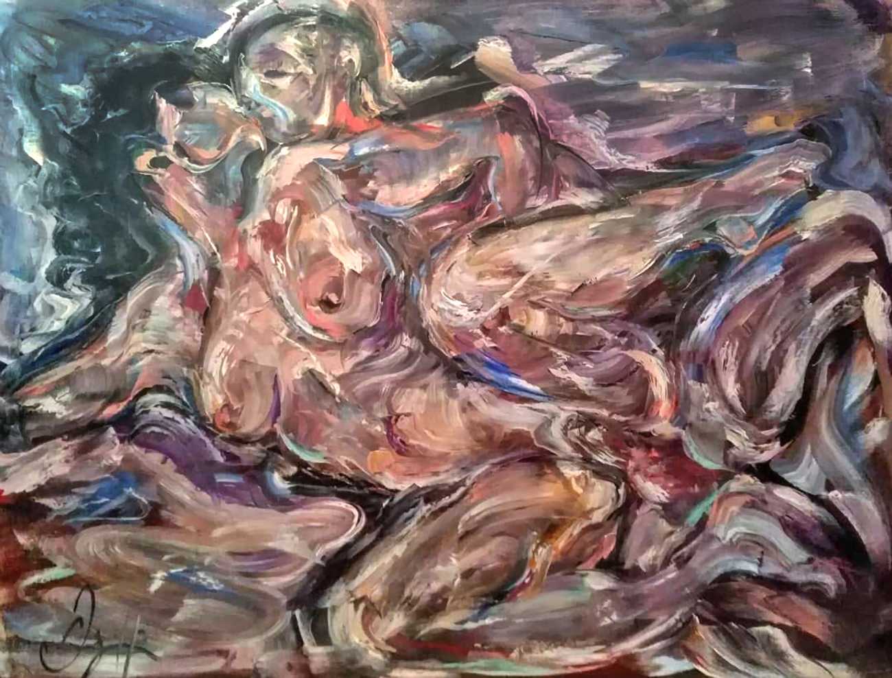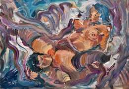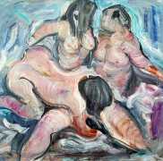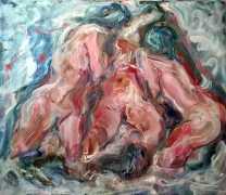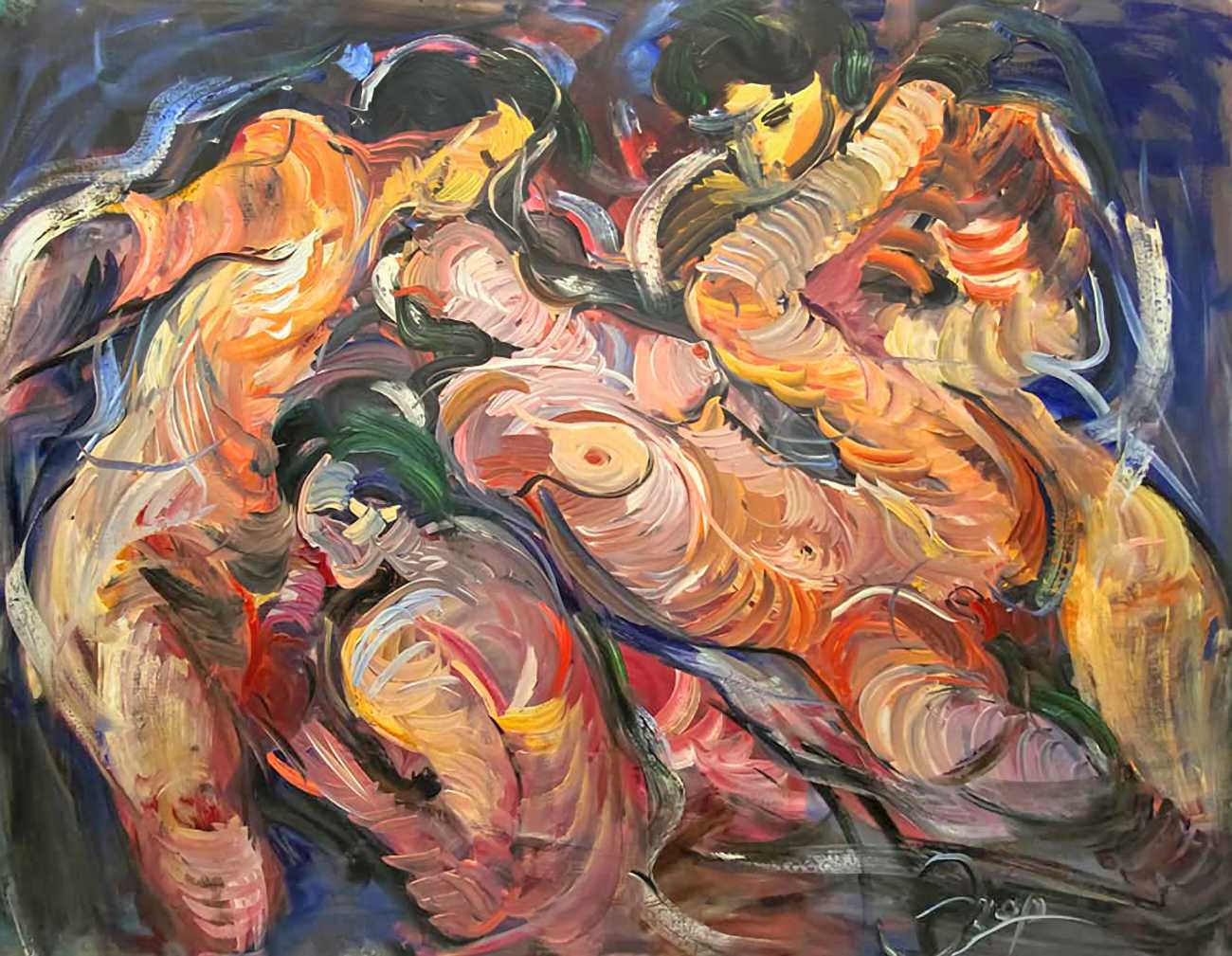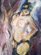 Her trademark style of erotic painting is to fill her canvases, often large ones, with bold, colourful, yet carefully worked paint, mirroring the joyful energetic power of satisfying intimacy.