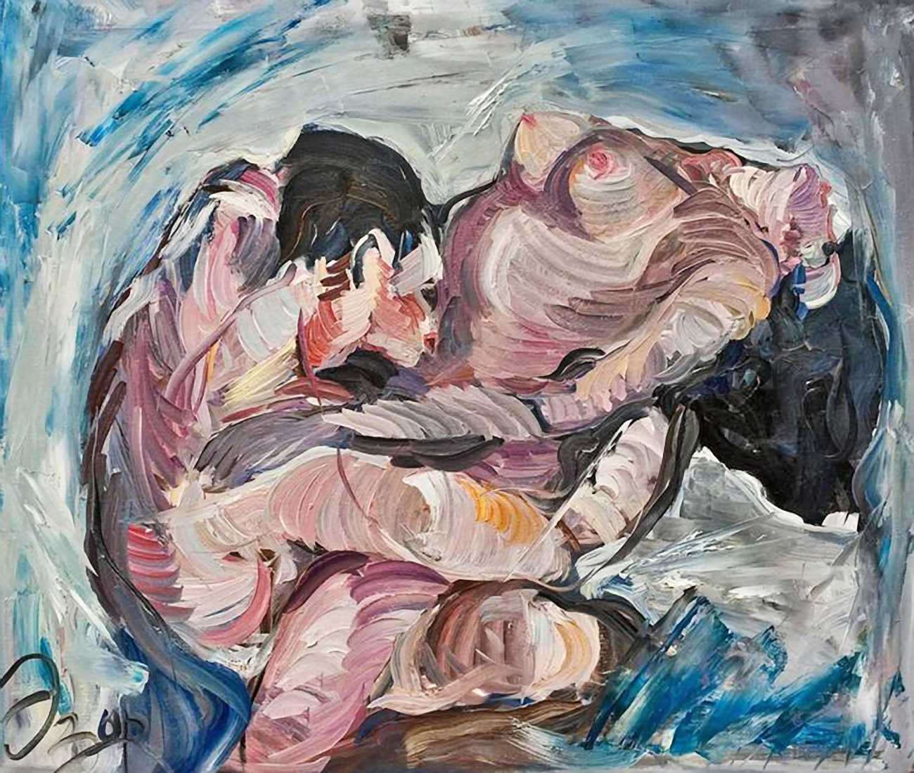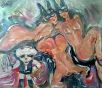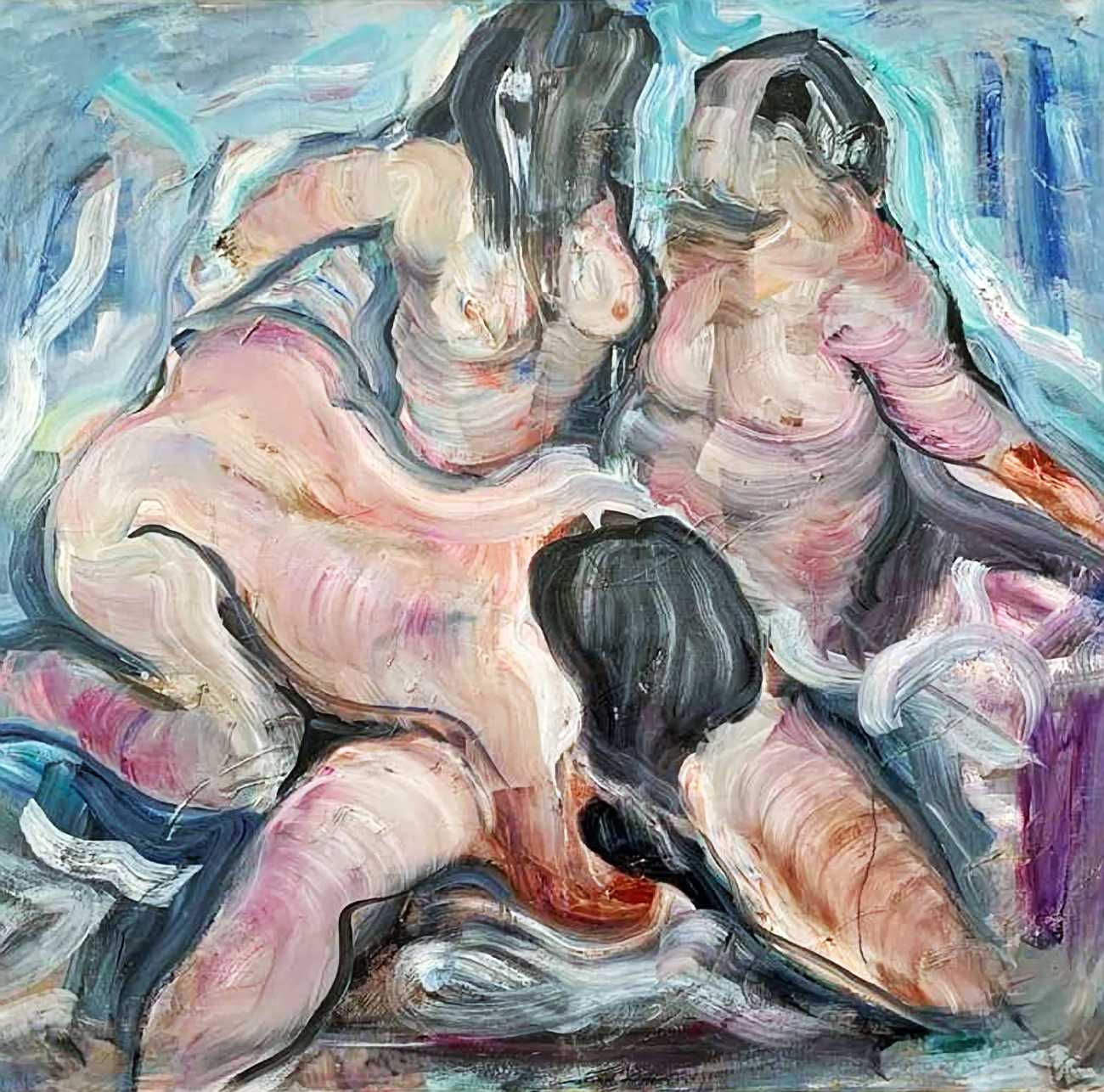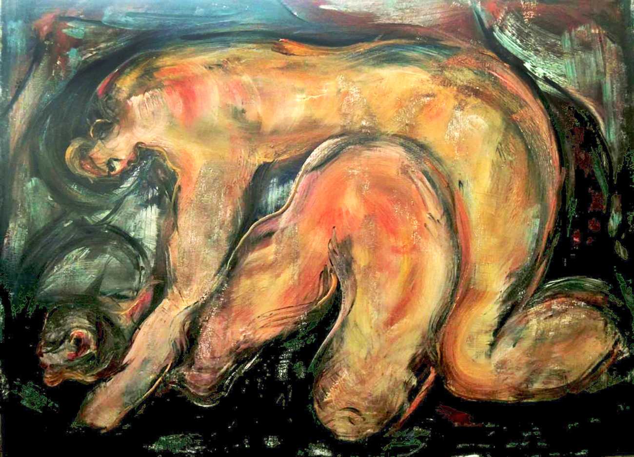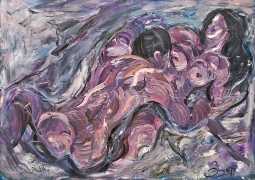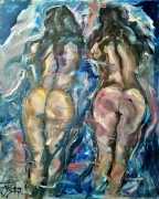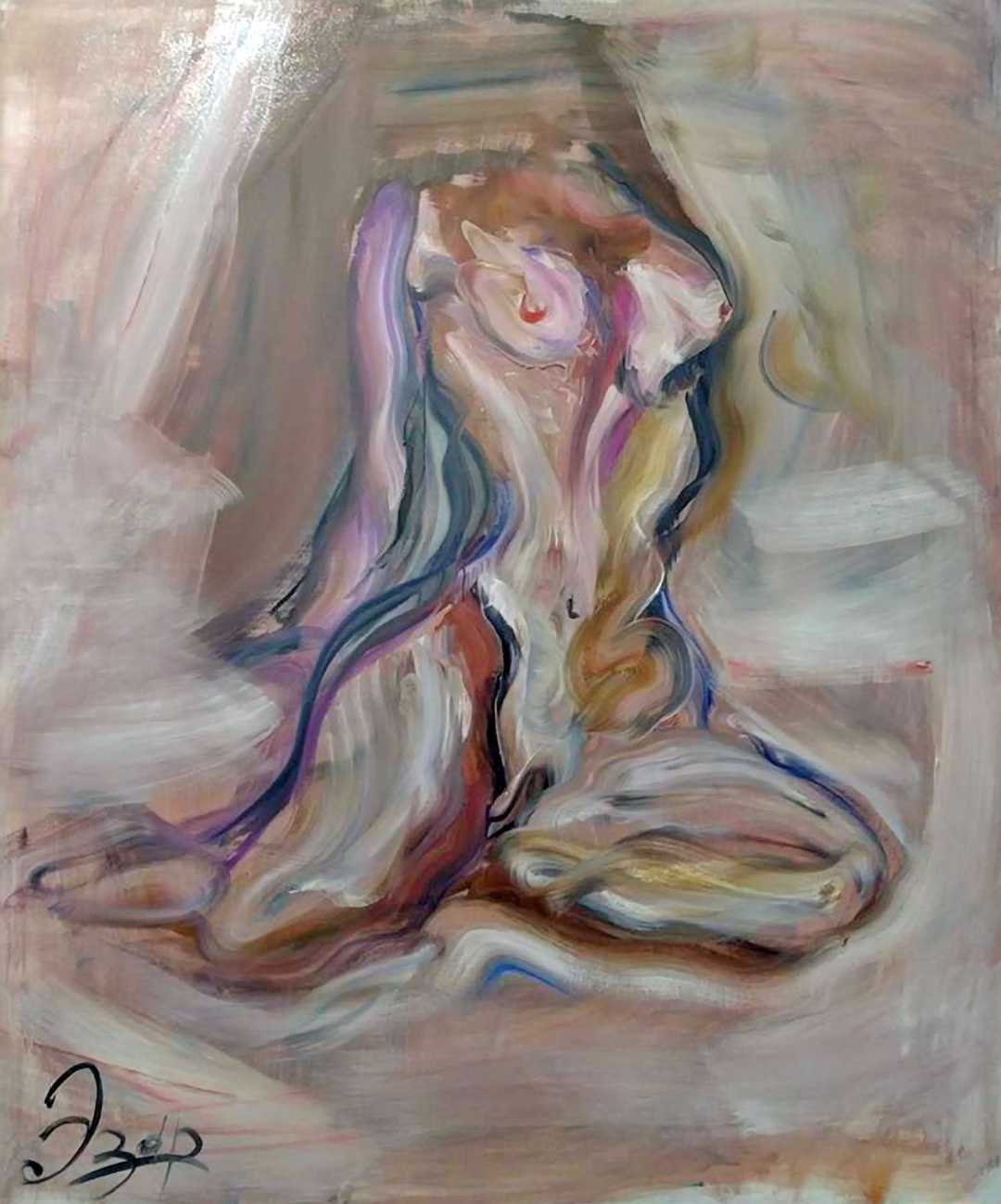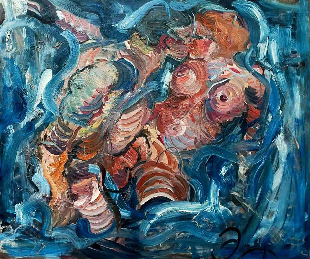 Her trademark style of erotic painting is to fill her canvases, often large ones, with bold, colourful, yet carefully worked paint, mirroring the joyful energetic power of satisfying intimacy.