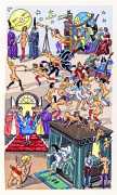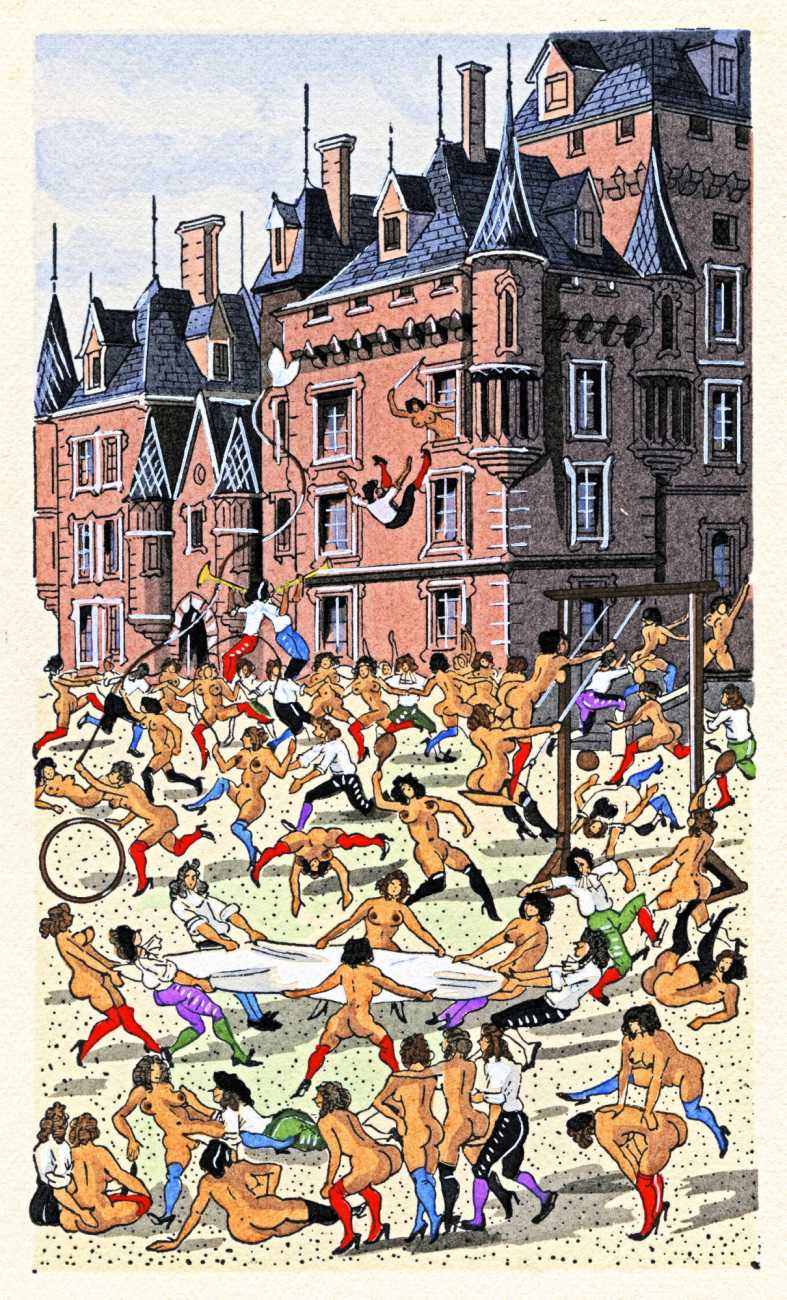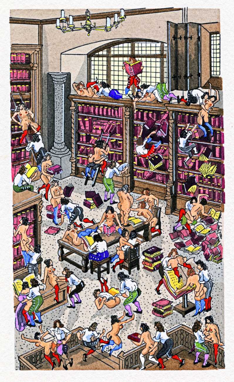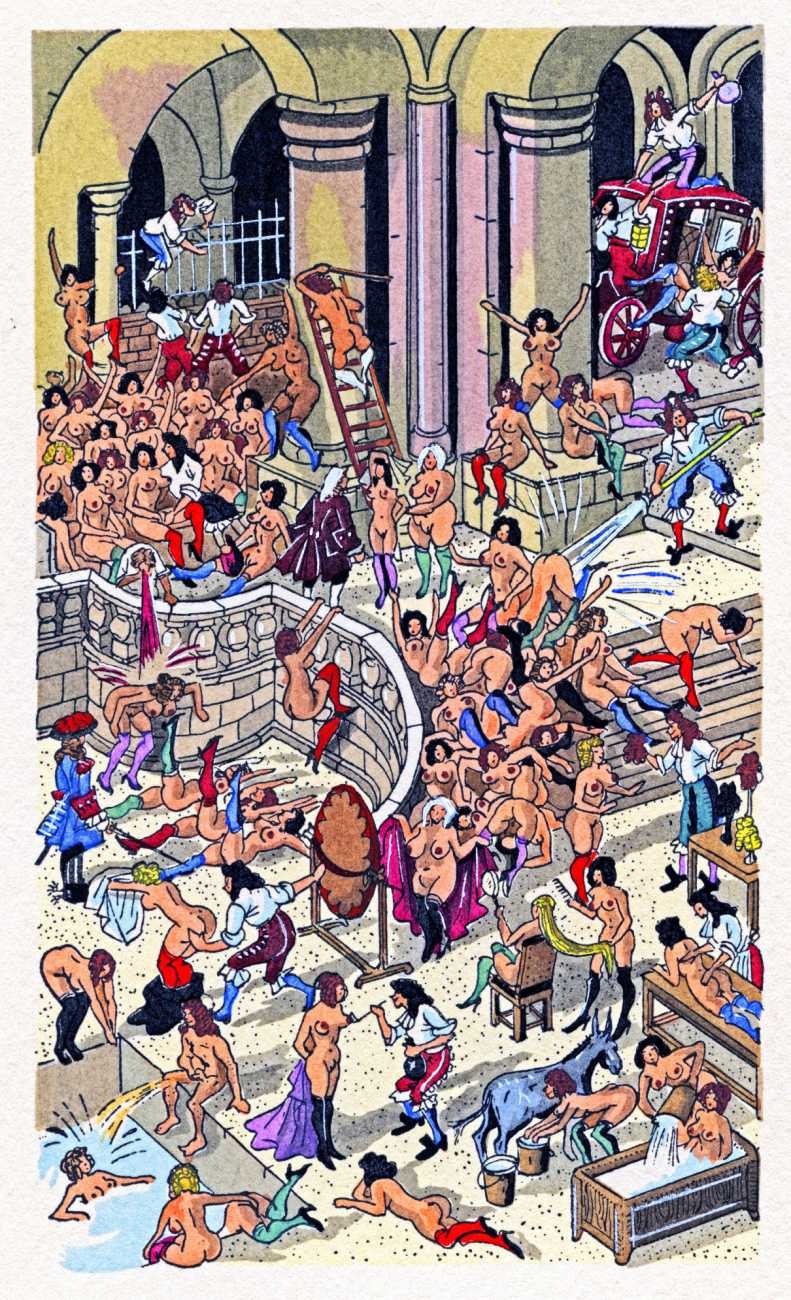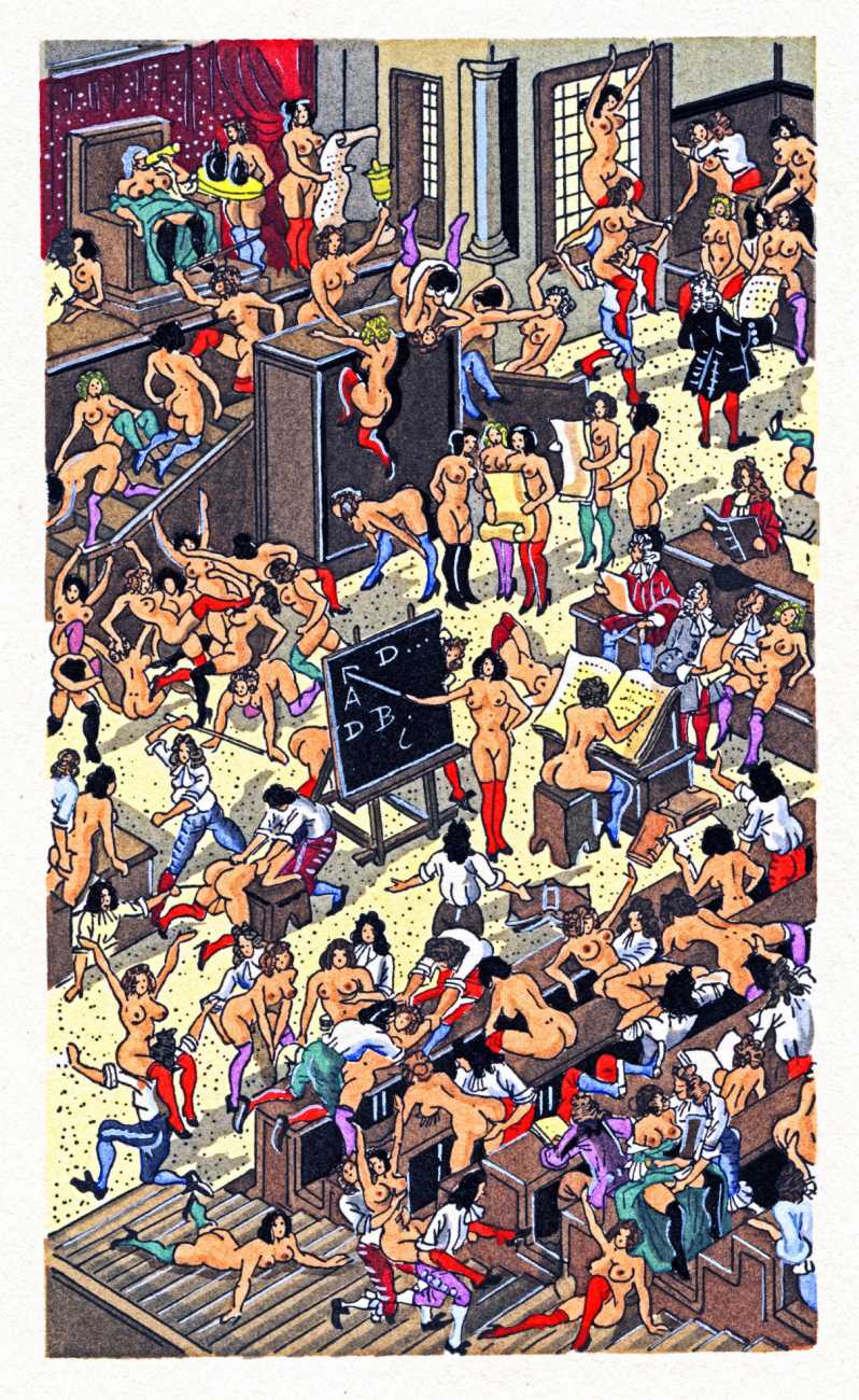 Jean Gradassi’s trademark crowd scenes are perfectly suited to the different aspects of the libertine school of interests and university of love, with sex and sexual innuendo taking place everywhere from the gardens to the library. Worth exploring in detail, his illustrations are a veritable Where’s Wally of the seventeenth-century erotic imagination.