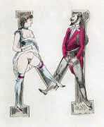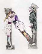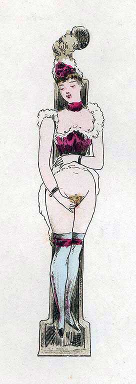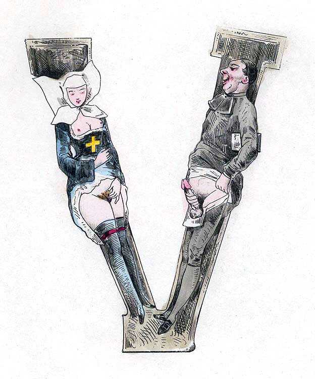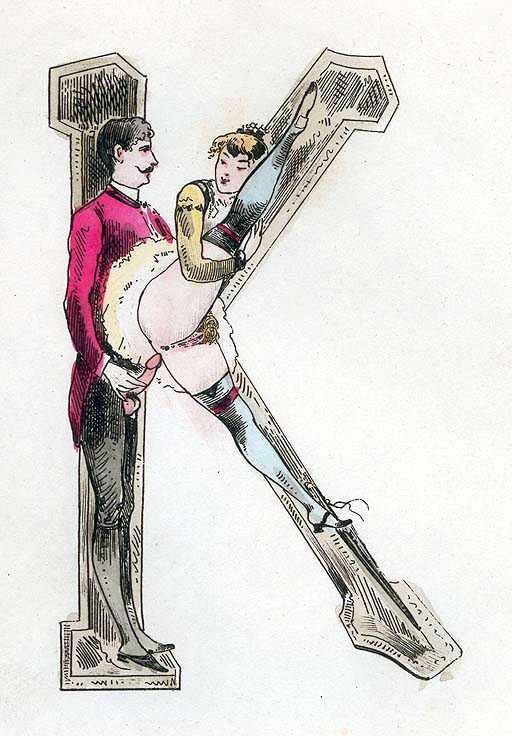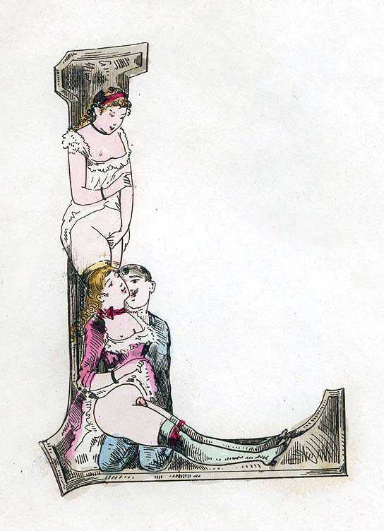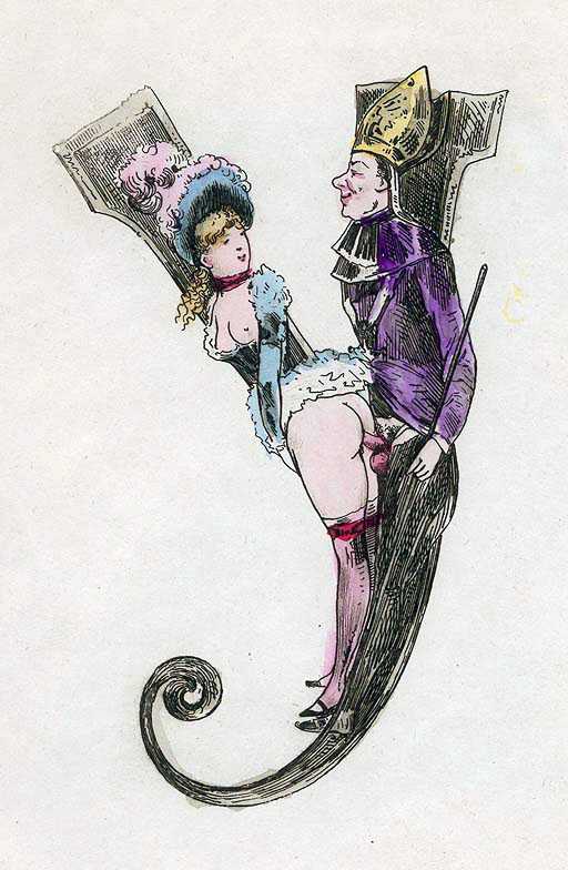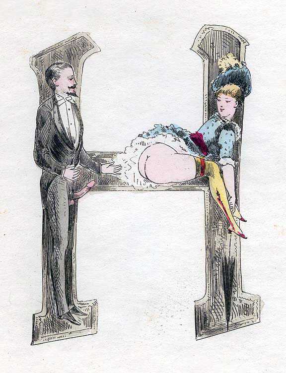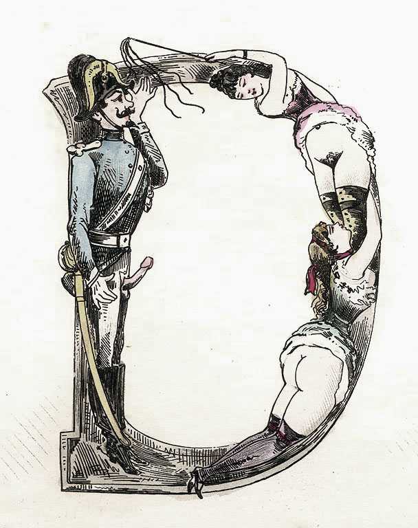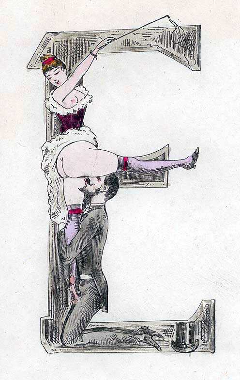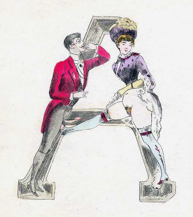 It’s rather a pity that Apoux’s claim to fame lies almost entirely with his Alphabet pornographique, published some time around 1880, even though it is one of the best of many attempts at the theme. Printed in black and white, each set was hand-coloured as required, which means that no two of the few surviving alphabets are quite the same.