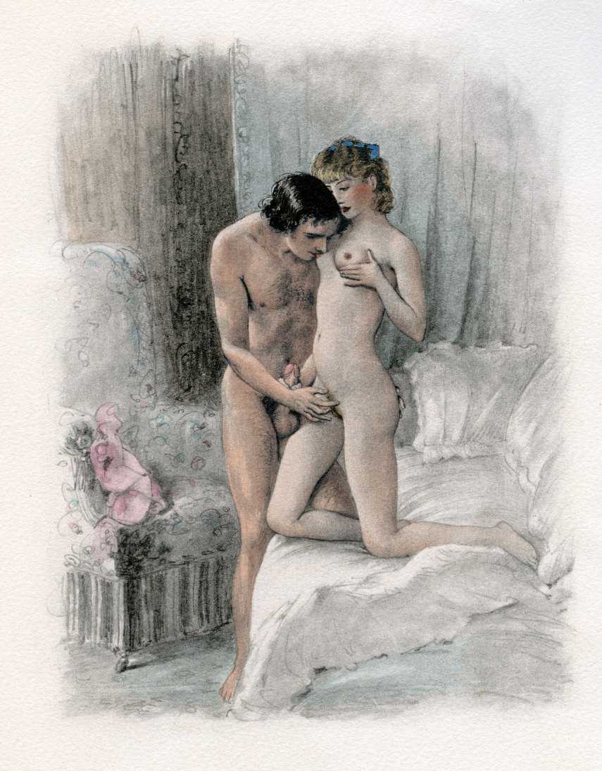 Bécat’s twelve coloured drypoints are skilled, imaginative and witty, especially the frontispiece with Verlaine himself overseeing a range of sexual liaisons; he would certainly have approved of the acknowledgement. Paul-Émile also contributed four line drawings as endpieces.