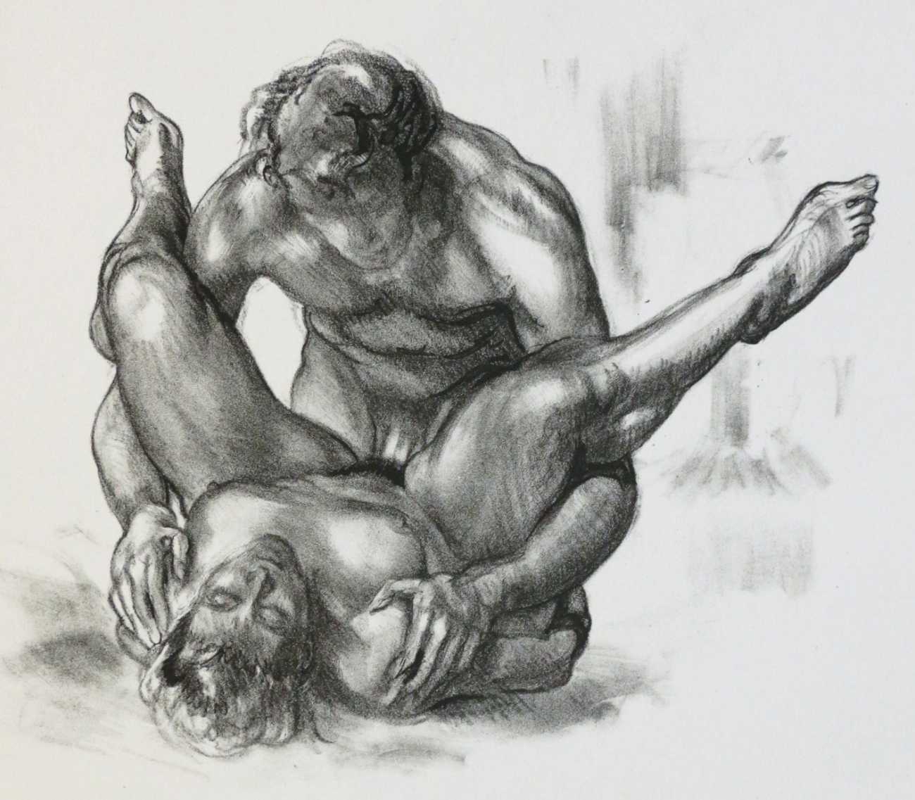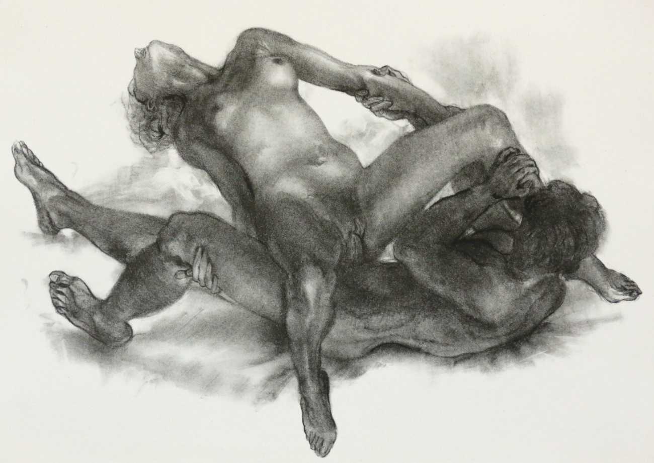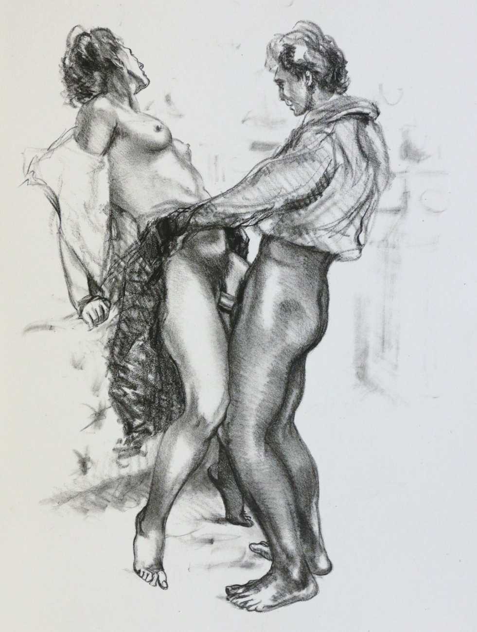 Dantan used a free interpretation of the chapter, given below in his French and in English translation, as a vehicle for a loose set of prints contained in an unprinted box, or étui. The drawings show two lovers in a wide range of sexual encounters, and display both real skill in figure drawing and an honest portrayal of shared physical passion.