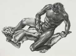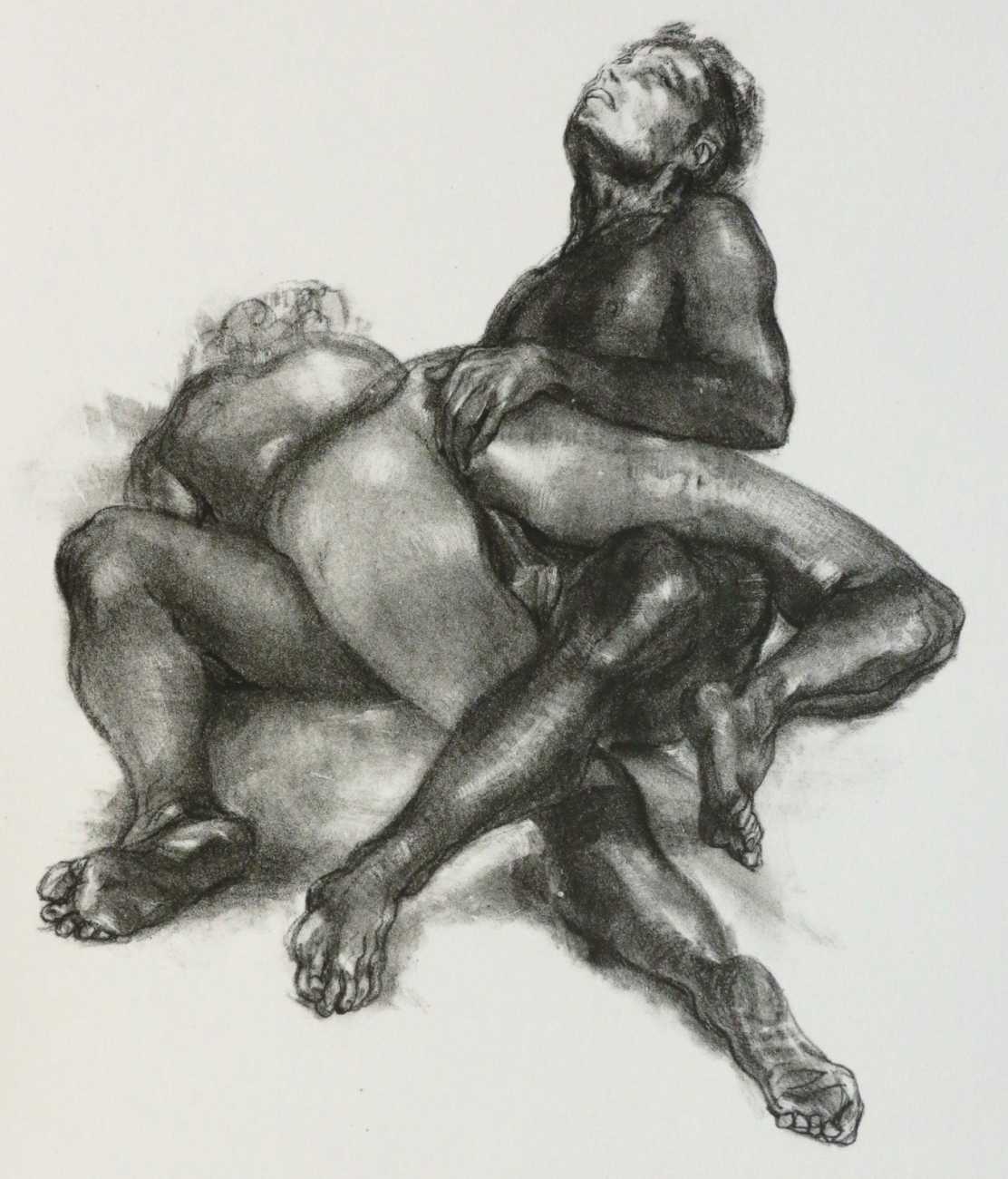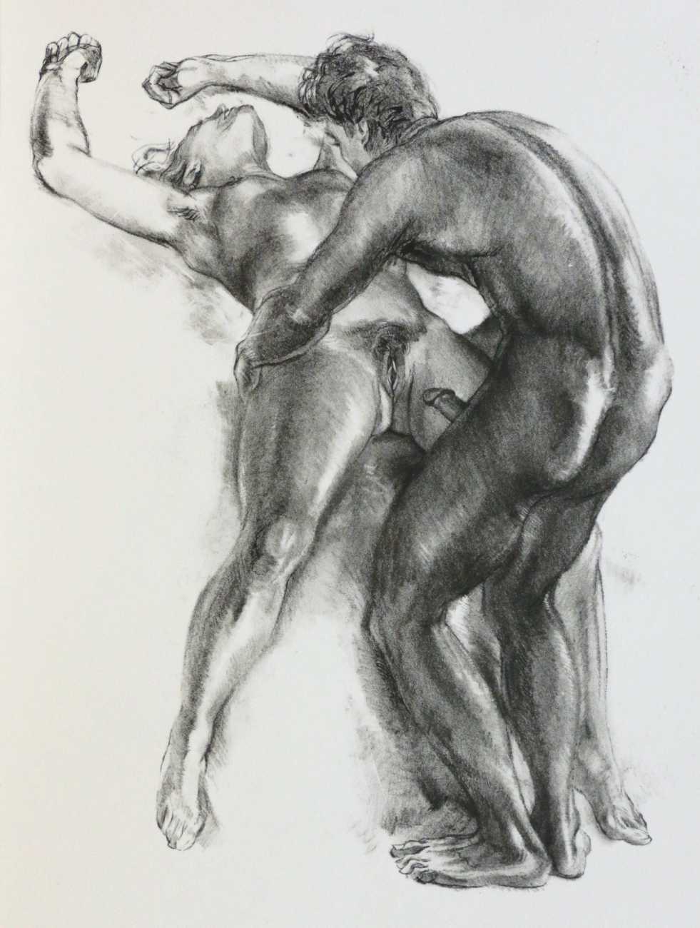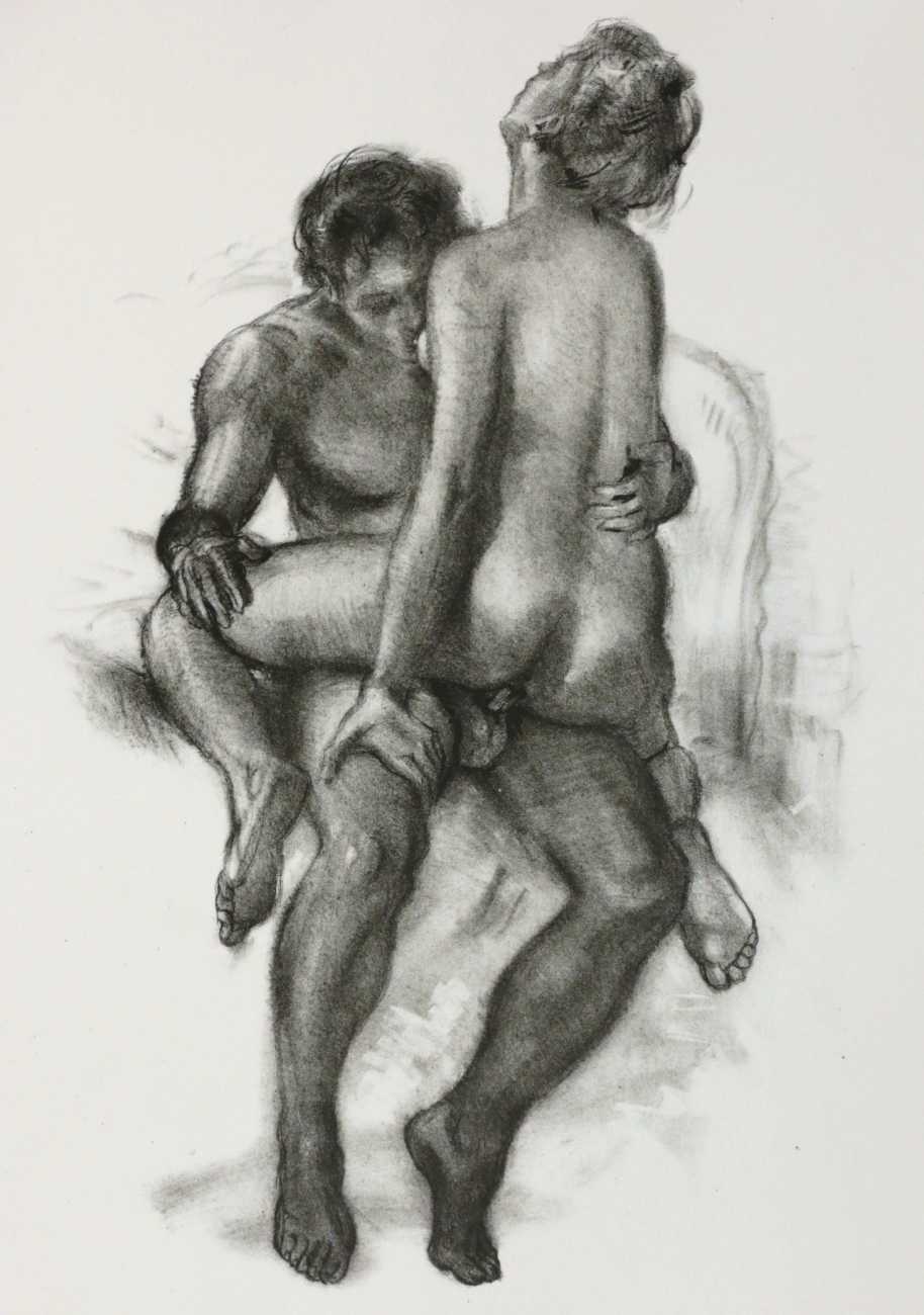 Dantan used a free interpretation of the chapter, given below in his French and in English translation, as a vehicle for a loose set of prints contained in an unprinted box, or étui. The drawings show two lovers in a wide range of sexual encounters, and display both real skill in figure drawing and an honest portrayal of shared physical passion.