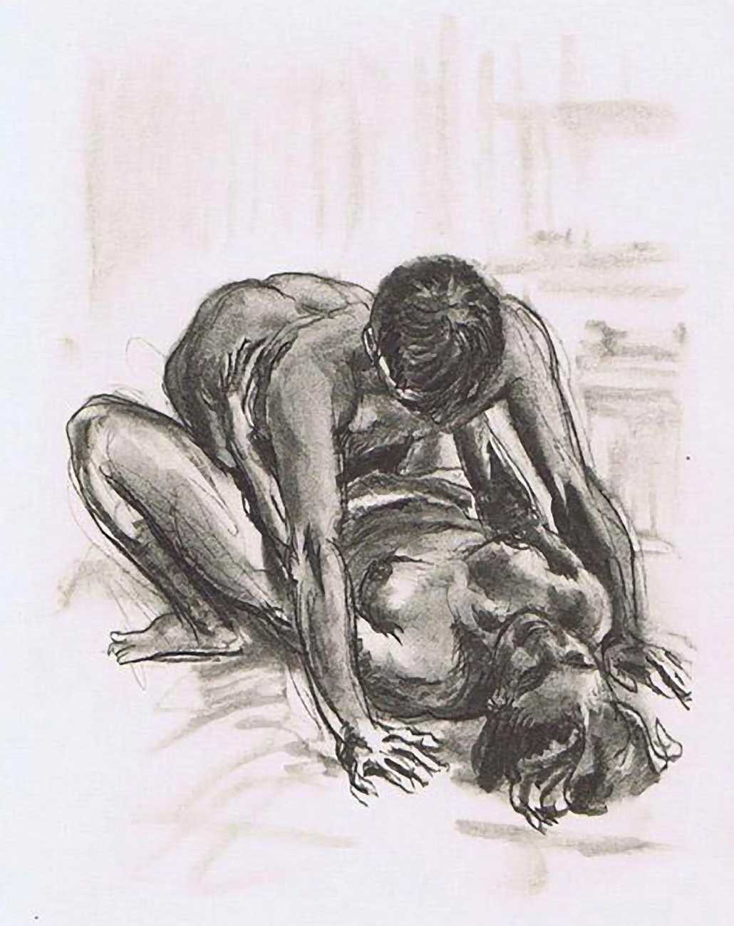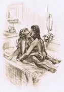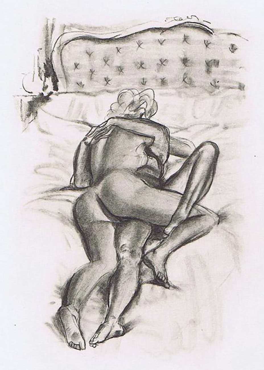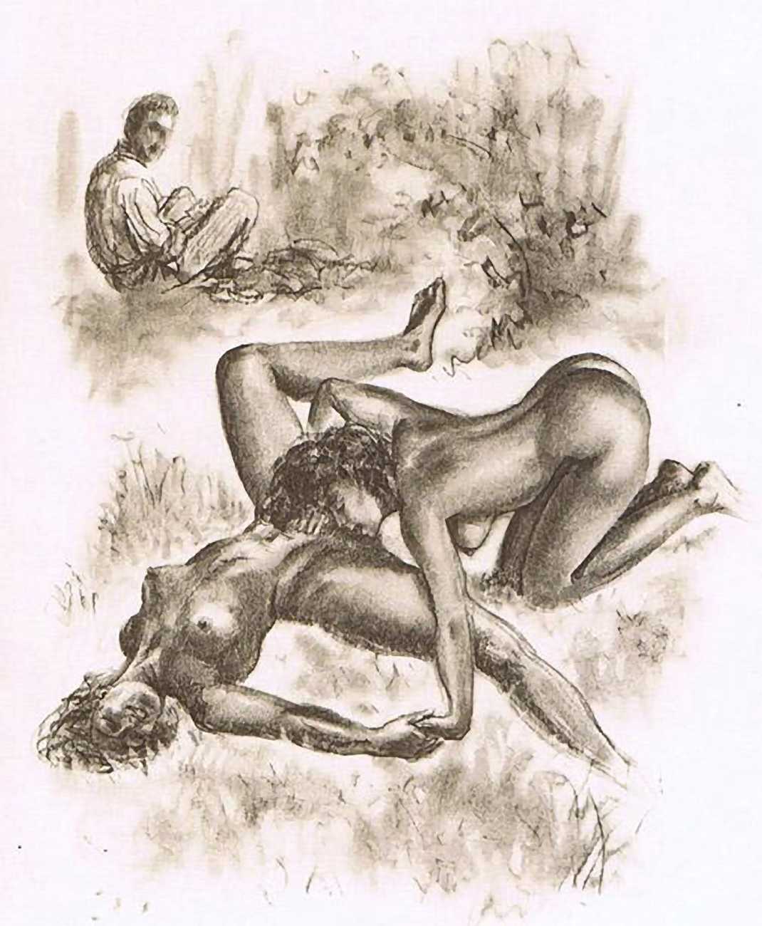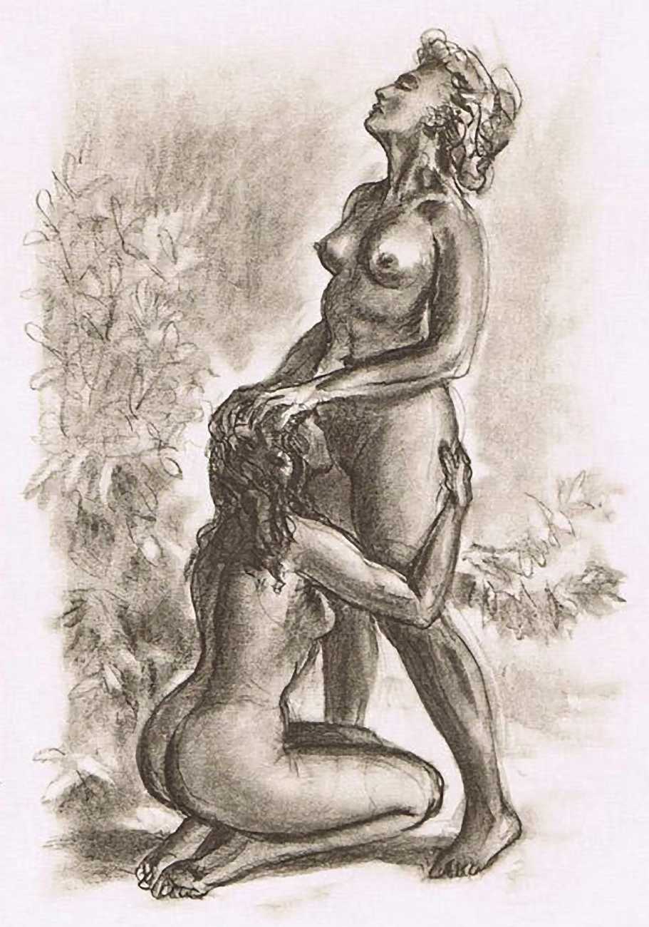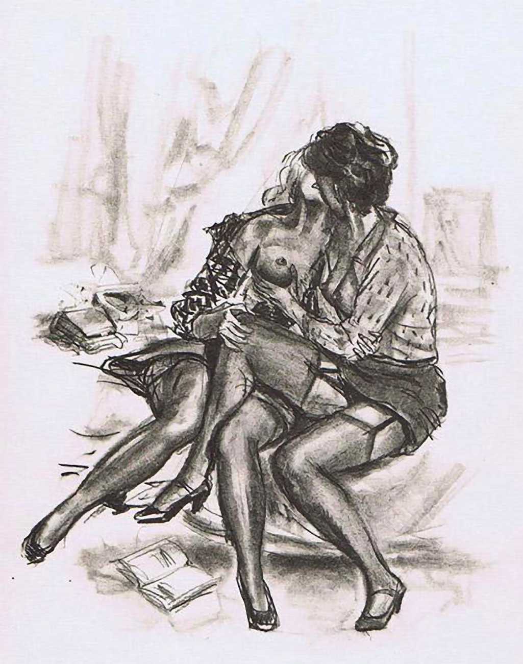 Not long after the publication of Cantique des cantiques, Fernand Dantan collected a further series of erotic drawings, this time mostly depicting lesbian and group scenes, and produced them as a sort of postscript or afterthought. This collection has no formal title, so we have called it Plaisirs érotiques (Erotic Pleasures). It too was housed in an unprinted étui, and was probably produced in just 100 copies. Many of the sets of both collections have since been dispersed, so complete sets are now very scarce.