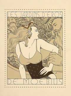 Eight years after Stardom published X Libris, a second small portfolio of cards appeared entitled Les jardins d’Eros (The Gardens of Eros). Les Jardins d’Eros explores the erotic through surreal dreamscapes, each black and white plate elegantly and meticulously drawn with exotic characters and scenarios in detailed sensual surroundings.