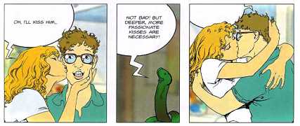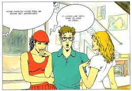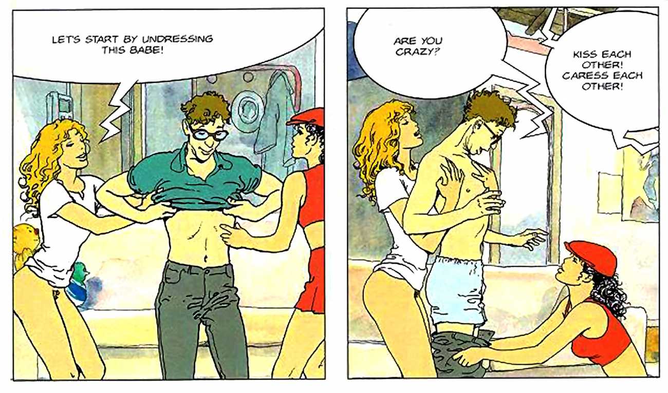Many commentators and critics have noted that while Milo Manara is the master of the erotic comic, he very rarely includes actual shared sex in his storylines. Nudity, arousal, humiliation, exploration, fantasy all abound, but his characters rarely interact sexually, and he almost never depicts penetrative sex. He is not very keen on drawing male genitalia at all, much preferring the clean lines of breasts, female buttocks and vulvas. Maybe he just isn’t very interested in the physical aspects of male sexuality, or maybe he is more concerned with male psychology and men’s all-too-often confused emotional response to the erotic. He clearly has, or at least represents for his readership, a very male gaze, a specifically heterosexual man’s world-view.