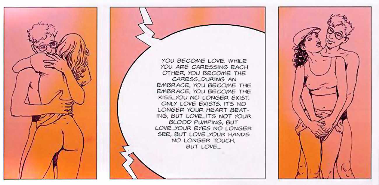 This section of his interpretation of Kamasutra includes one of the only erect human penises to be found in Manara’s output, this one even being held by a lover. It also demonstrates how inventive Manara can be with elements like colour, the depth of colour cleverly matching the pitch of the passion.