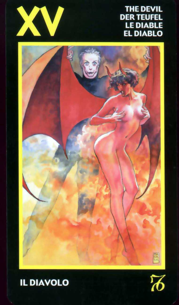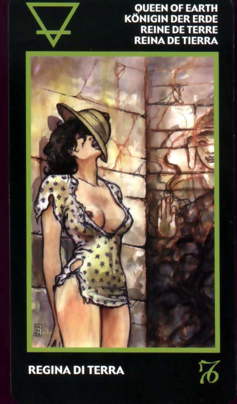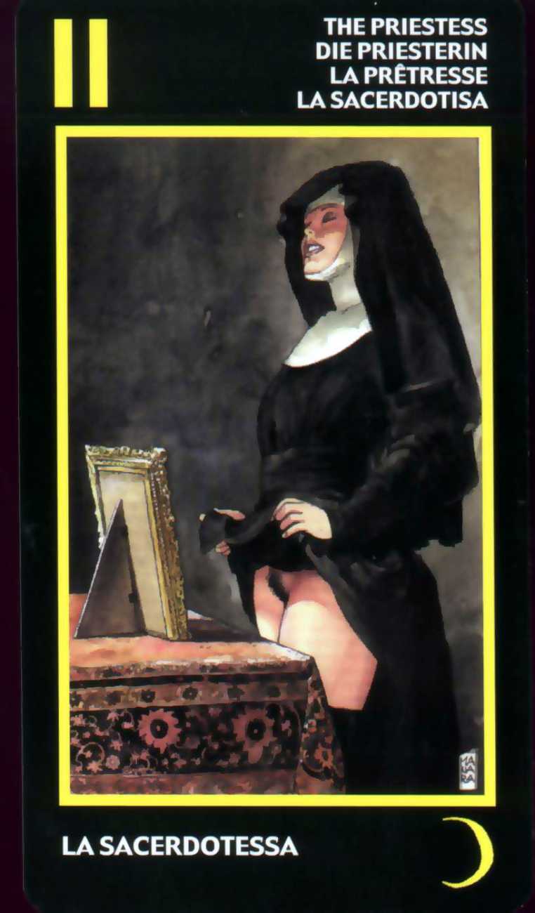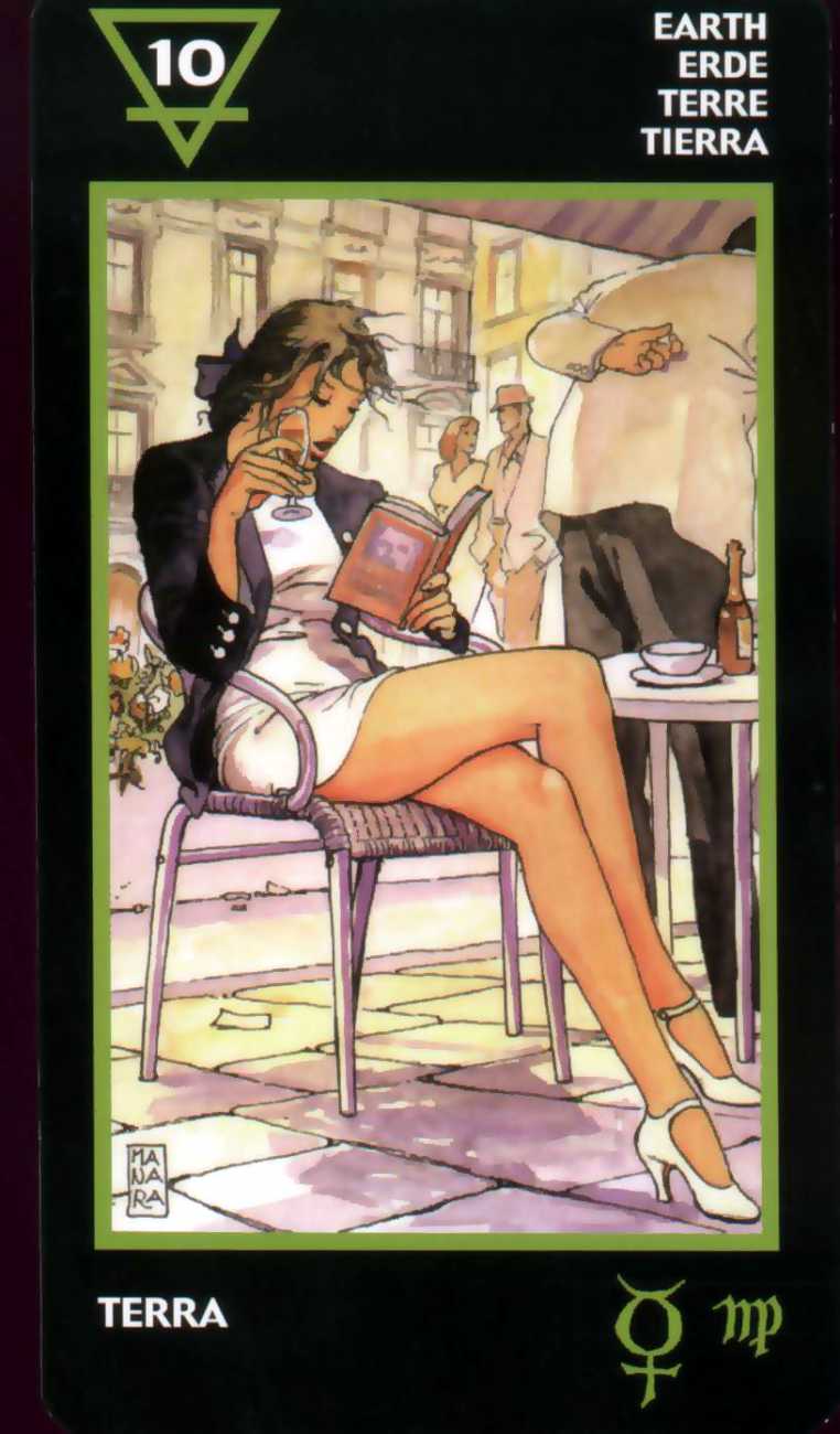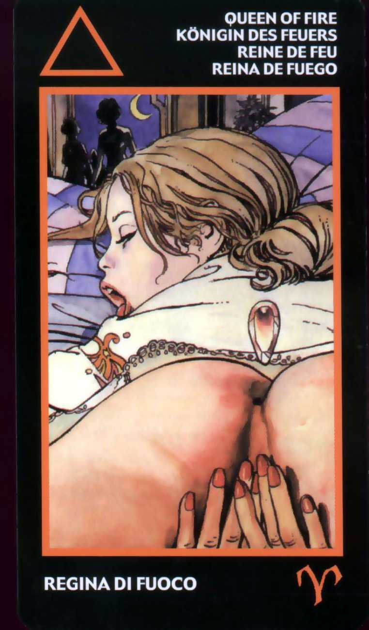 Here is what Lo Scarabeo, the publisher of the Manara Erotic Tarot, says about this 78-card pack, which reproduces rather randomly-selected Manara images to accompany each card: ‘The acknowledged master of erotic drawing, Milo Manara transports us into a dreamlike yet carnal dimension that sings praises to life itself. In the reconstruction of dreams, stories, desires, nightmares and daily life events, Manara takes us into his well-known sensual universe, above all through his homage to the female body, symbol of the universe. The cards also contain planetary and zodiac symbols as well as those of the four elements, useful for discovering astrological answers.’