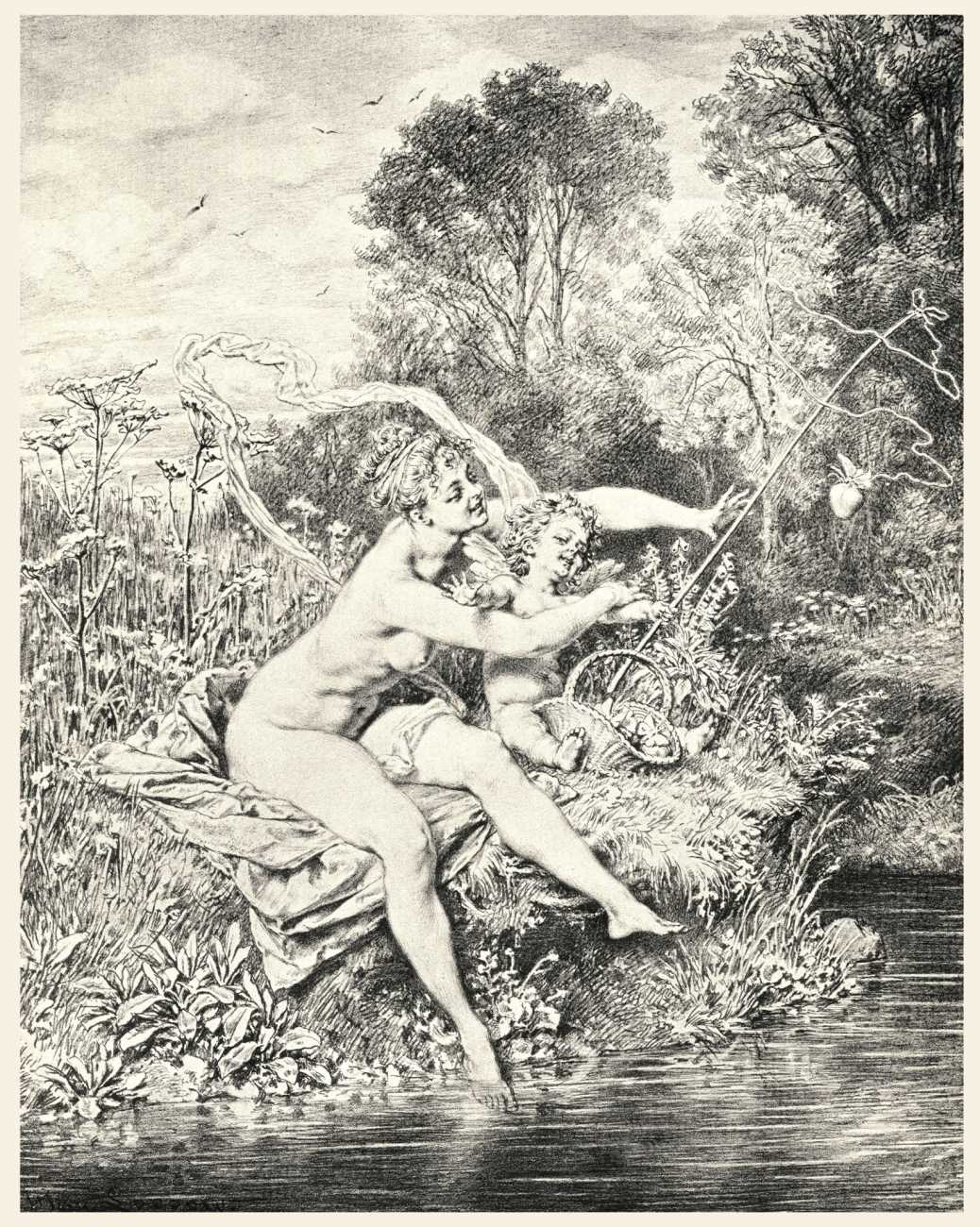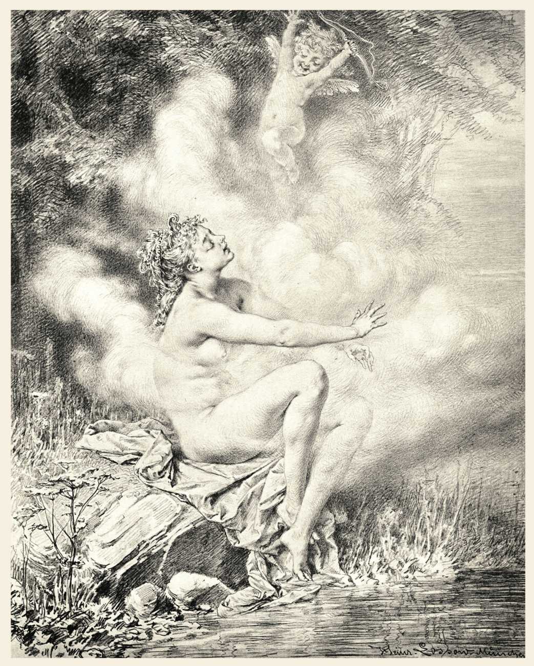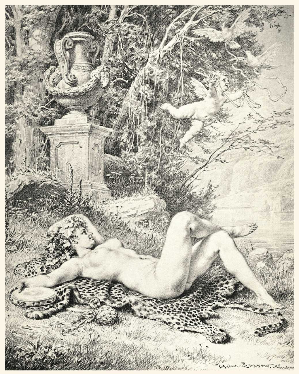 In 1881 the very respectable Munich publisher Adolf Ackermann commissioned Heinrich Lossow to produce a series of engravings featuring tasteful female nudes with appropriate attendant cupids, with the title Götterdekameron (God’s Decameron), thus neatly referencing both Boccaccio and Wagner. Subtitled Ein Mythologischer Bilderscherz con Amore gezeichnet (A Mythological Satire Drawn with Love), the twelve detailed engravings show Lossow at the height of his skill.
