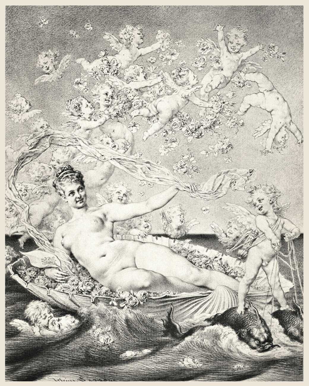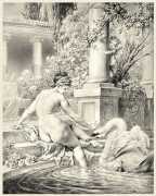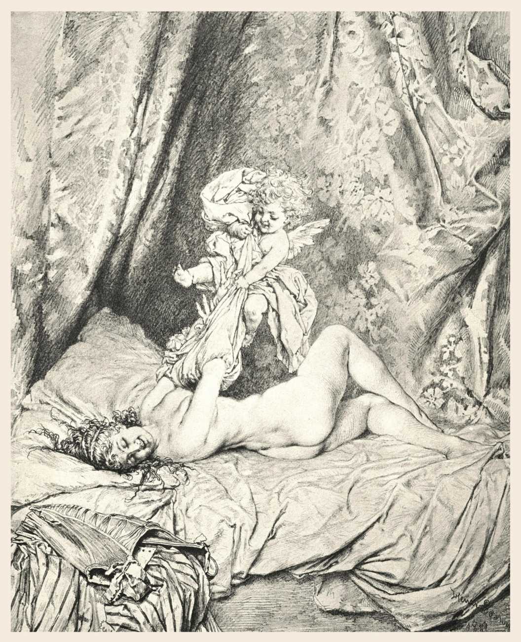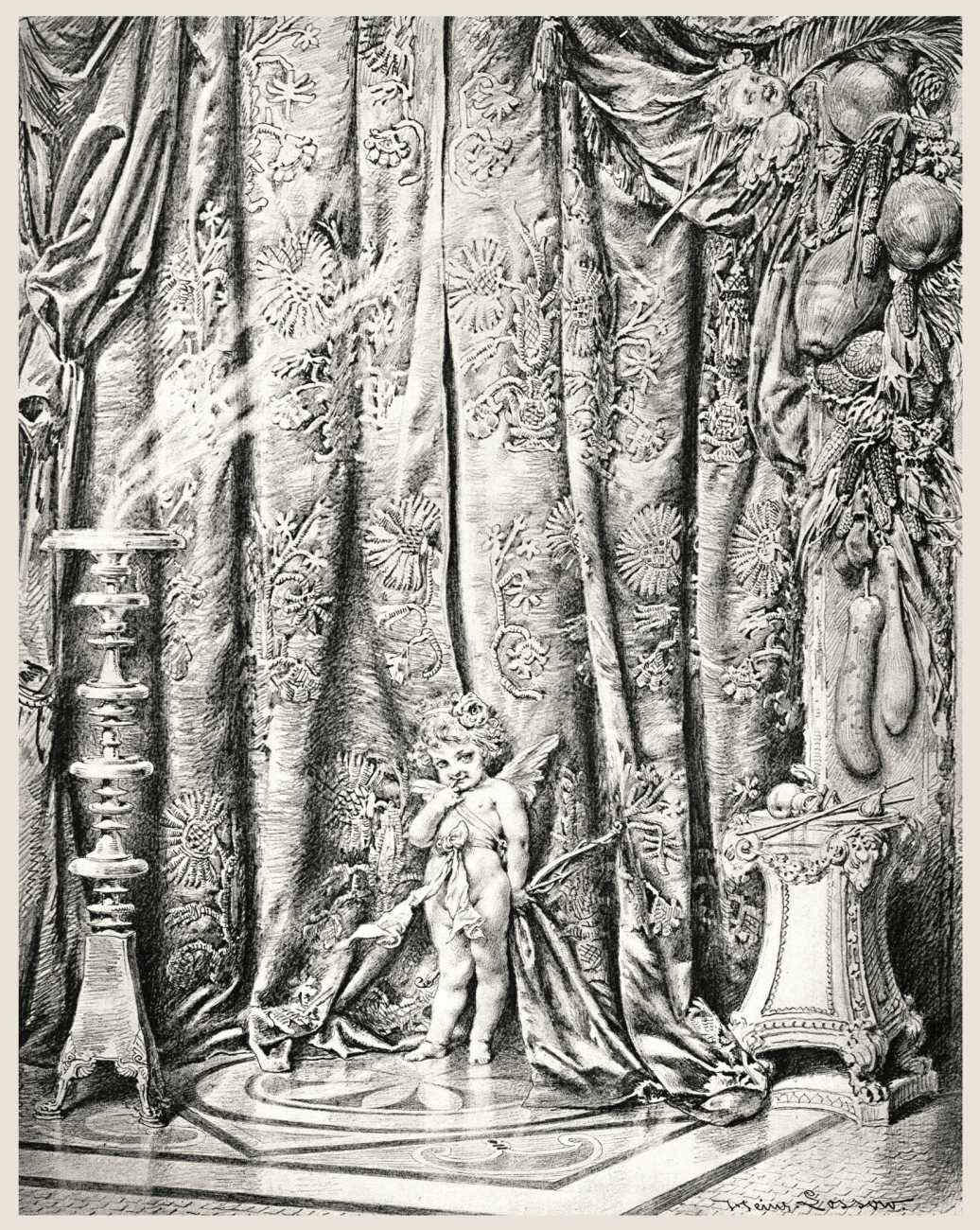 In 1881 the very respectable Munich publisher Adolf Ackermann commissioned Heinrich Lossow to produce a series of engravings featuring tasteful female nudes with appropriate attendant cupids, with the title Götterdekameron (God’s Decameron), thus neatly referencing both Boccaccio and Wagner. Subtitled Ein Mythologischer Bilderscherz con Amore gezeichnet (A Mythological Satire Drawn with Love), the twelve detailed engravings show Lossow at the height of his skill.