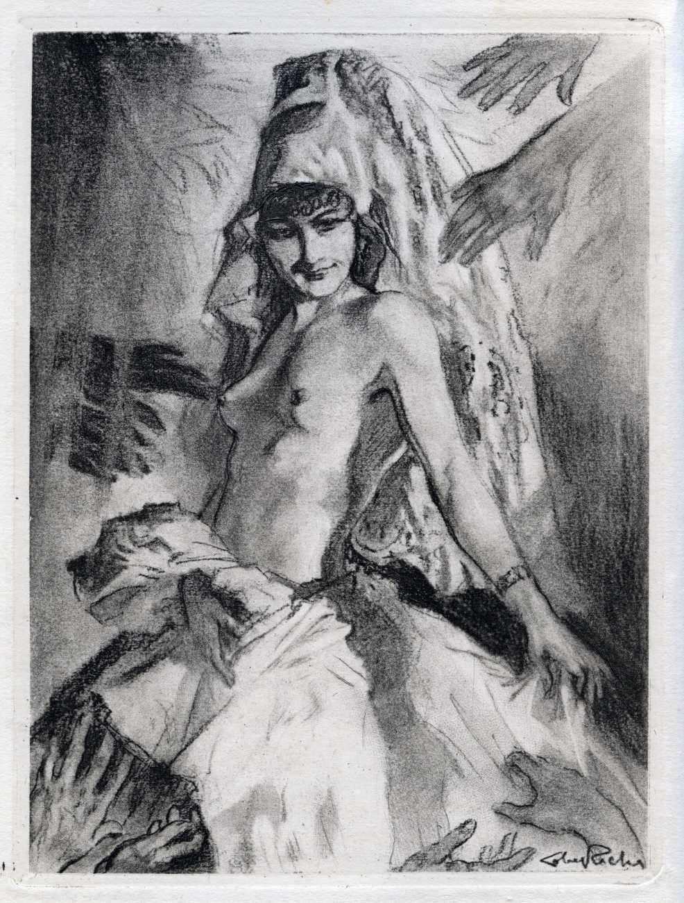Following the success of Salammbô and Bilitis, Rombaldi commissioned Lobel-Riche to illustrate a new edition of Les diaboliques (The She-devils), a collection of stories written by Barbey d’Aurevilly and first published in 1874. Each of the six stories features a woman who commits an act of violence or revenge, and is considered d’Aurevilly’s masterpiece. The deeds committed by the characters in the stories are induced not only by their extreme passion but also by their boredom. Some of the characters spend hours playing whist, while others take delight in wearing fine clothes. All of the female characters are strong and independent, and also very good at concealing their passions.