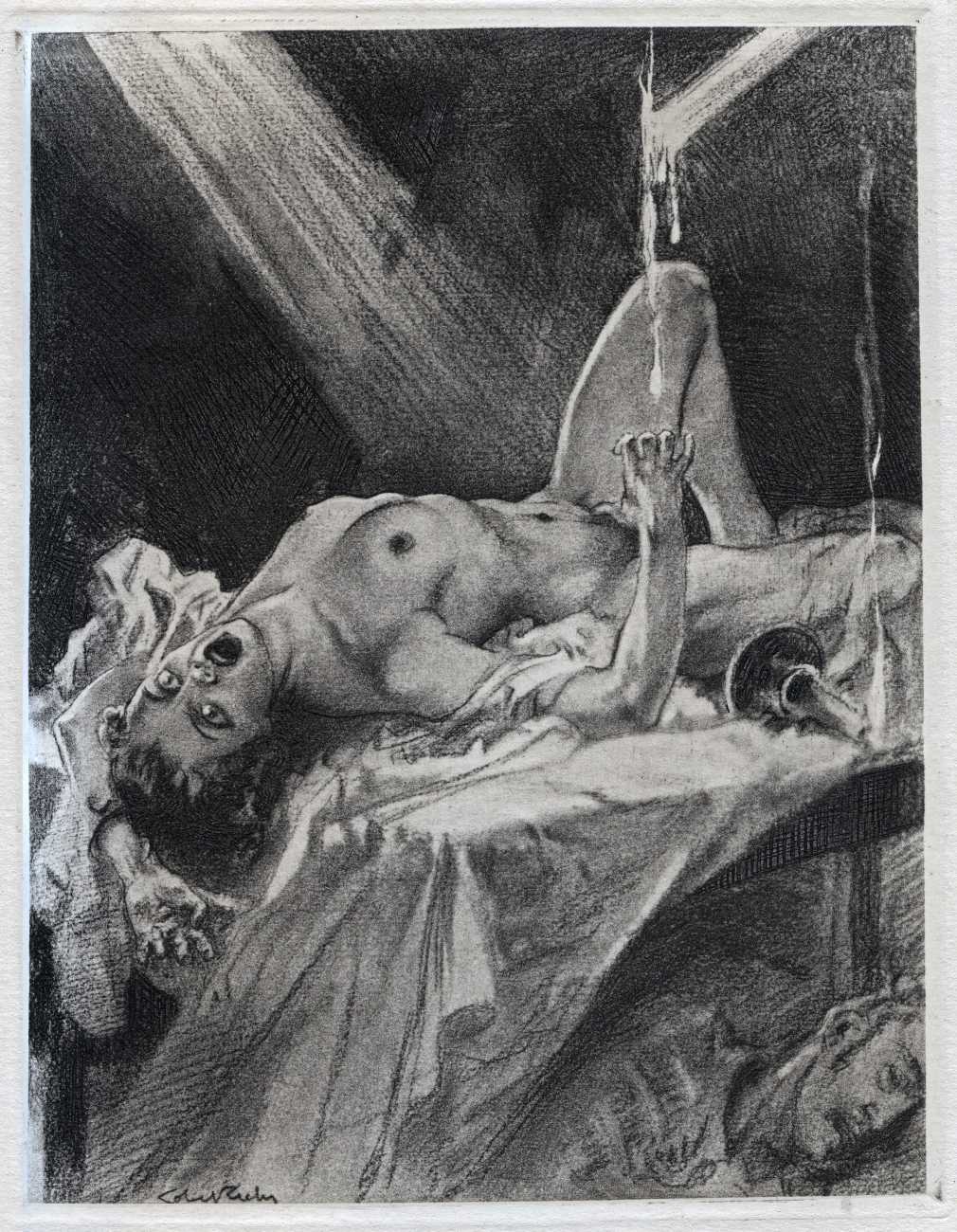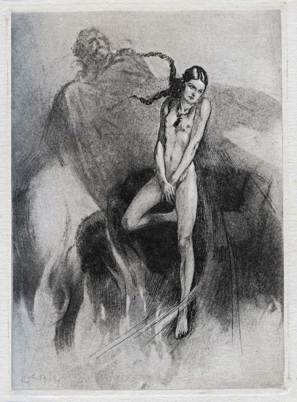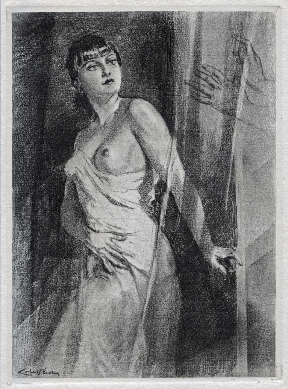 The cruel imagination of d’Aurevilly clearly appealed to Alméry. As Henri Babou writes in the introduction to his 1929 study of Lobel-Riche, ‘d’Aurevilly’s harsh, colourful, proud style well matches the artist’s imagination. Unlike tamer illustrators, he produces a vision which further increases the mystery of souls. Far from being concerned by their strangeness, he explores it and seeks to make the heroines of these unusual stories plausible. Of their demonic souls he shows us their all-too-human aspects’.