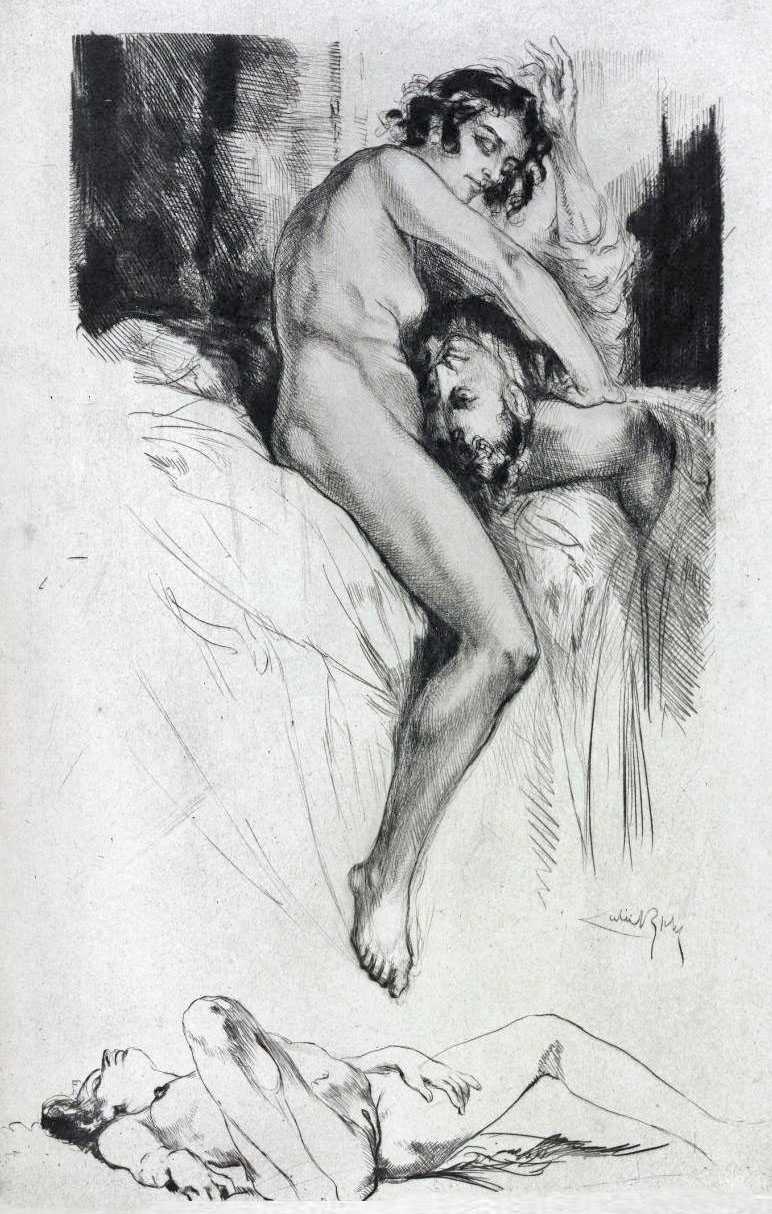 The French poet Maurice Rollinat (1846–1903) grew up in a literary family. His father was a friend of George Sand, whose influence is very marked in young Rollinat’s first volume, Dans les brandes (In the Embers, 1877), and to whom it was dedicated. After its publication, he abandoned realism and worked in a very different manner. He joined a literary circle that called themselves Les Hydropathes, founded by Émile Goudeau, an anti-clerical group with ties to the decadent literary movement. Under their influence he wrote the poems that made his reputation. In Les névroses (The Neuroses), he showed himself as a disciple of Charles Baudelaire, exploring the physical horrors of pain and death. This volume, Les luxures (The Luxuries) is the best-known section of Les névroses.