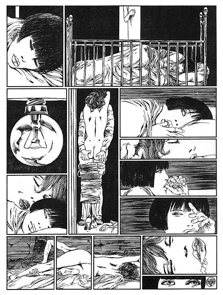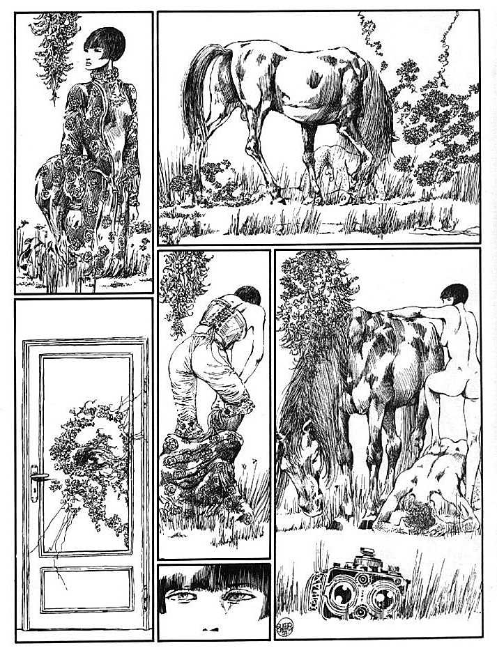 Lanterna Magica (The Magic Lantern) is unique among Crepax’s output for having no text at all. We know that the main character is Valentina (in the original English-language series published by Eurotica it has the subtitle Valentina 2), with her distinctive black bob and demure demeanour, the very essence of Milanese sophistication. It is also made clear that below the surface burns a passionate young woman eager to inhabit another world, a world where she can explore her dark attraction to that which most frightens her.