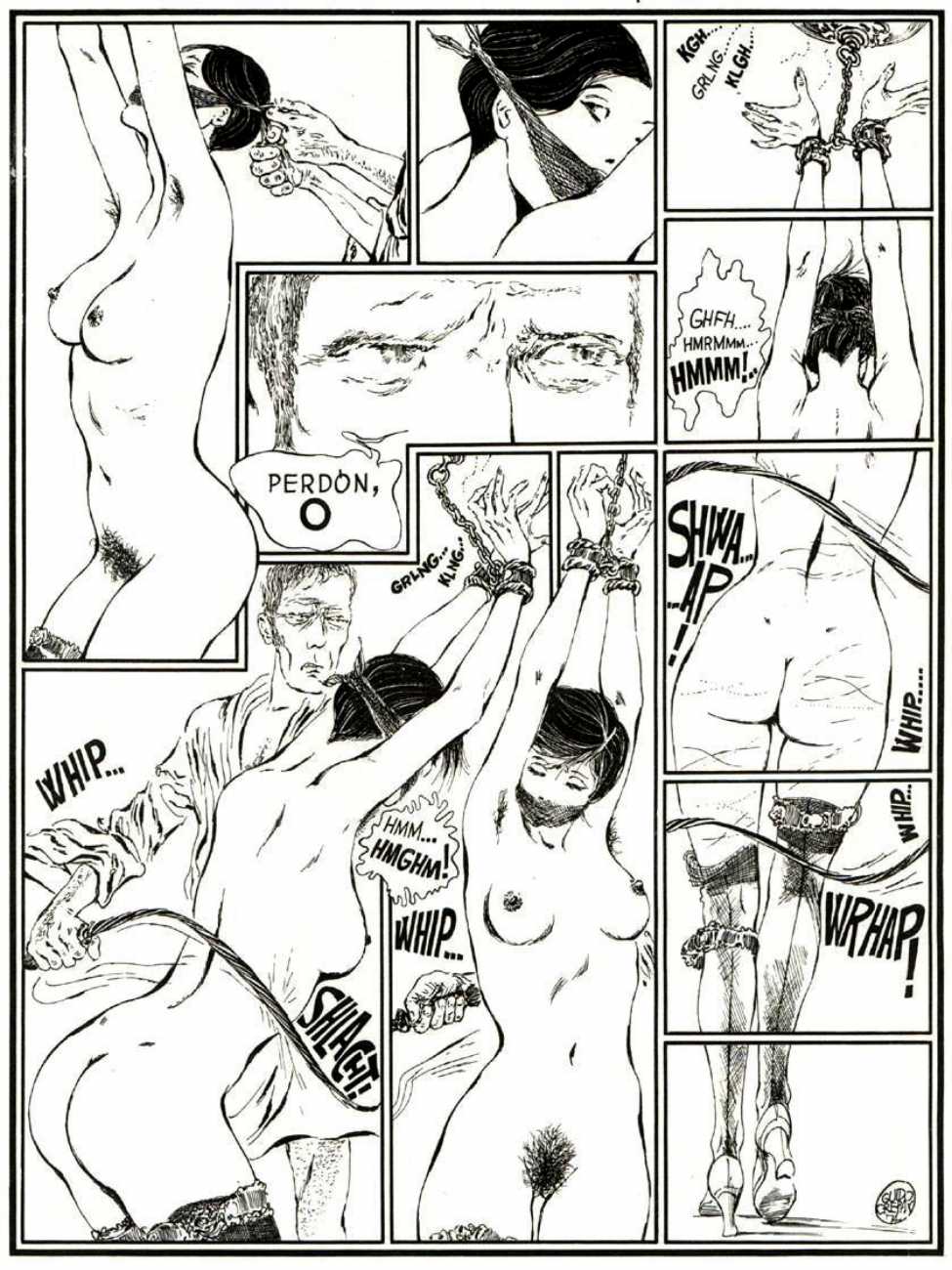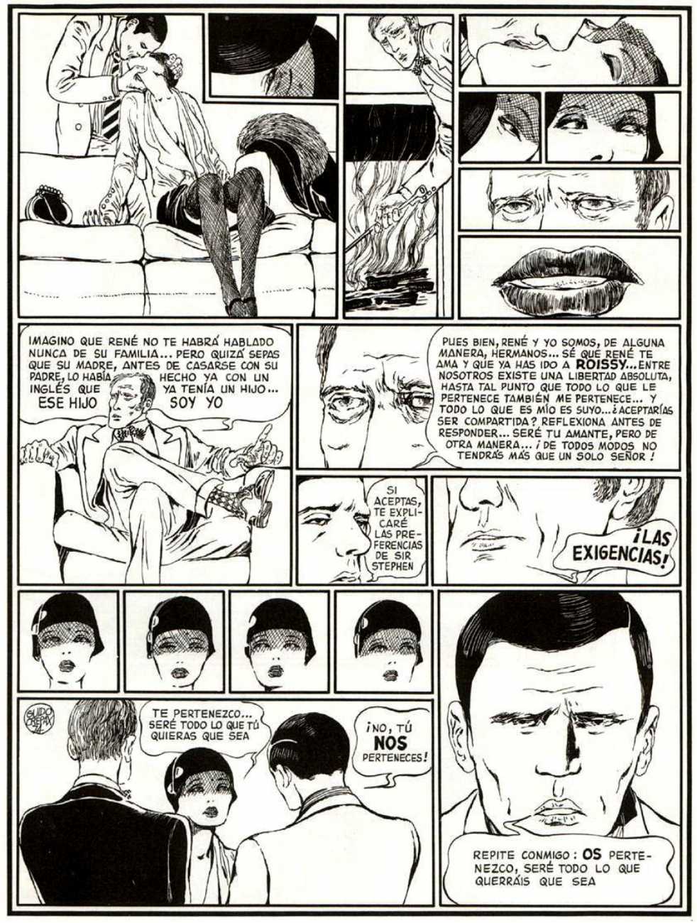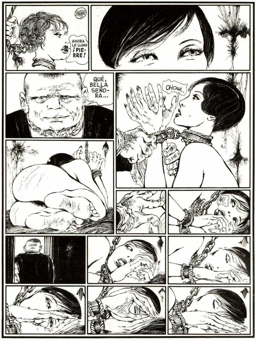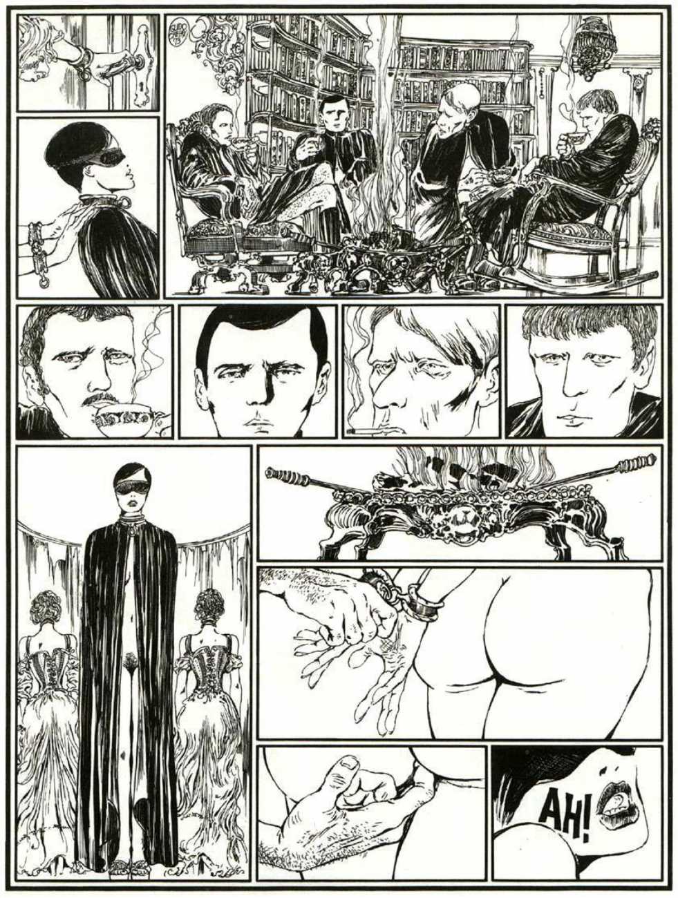As Stefan Prince writes, ‘It could be said that Valentina, described by Graziano Frediani as “the allegory of a need, a mirror in fragments, the mark left from a laceration”, has in Crepax’s Story of O become Madam O, the plaything of the valets and members of the Roissy mansion, of her lover René who takes her there, and of Sir Stephen who claims ownership by having O branded with his initials. The story unfolds like an adult fairy tale, familiar territory for Crepax. With consummate skill, he takes every opportunity presented by this sadomasochistic literary classic to busy his pages with all manner of menace, stylised violence, eroticism and sex. Whips, masks, erect penises, rounded breasts, and marked buttocks proliferate. Wilinsky, the French illustrator, said Crepax drew the best ass of any comic strip artist, and certainly that part of O’s anatomy comes in for its full share of cruel treatment in Story of O.’