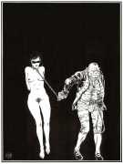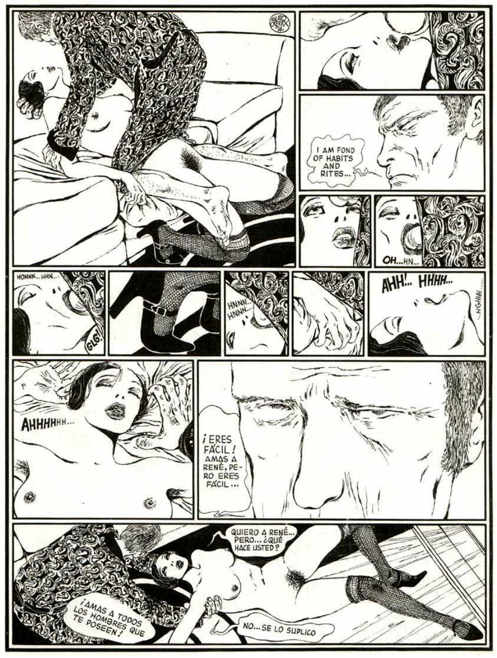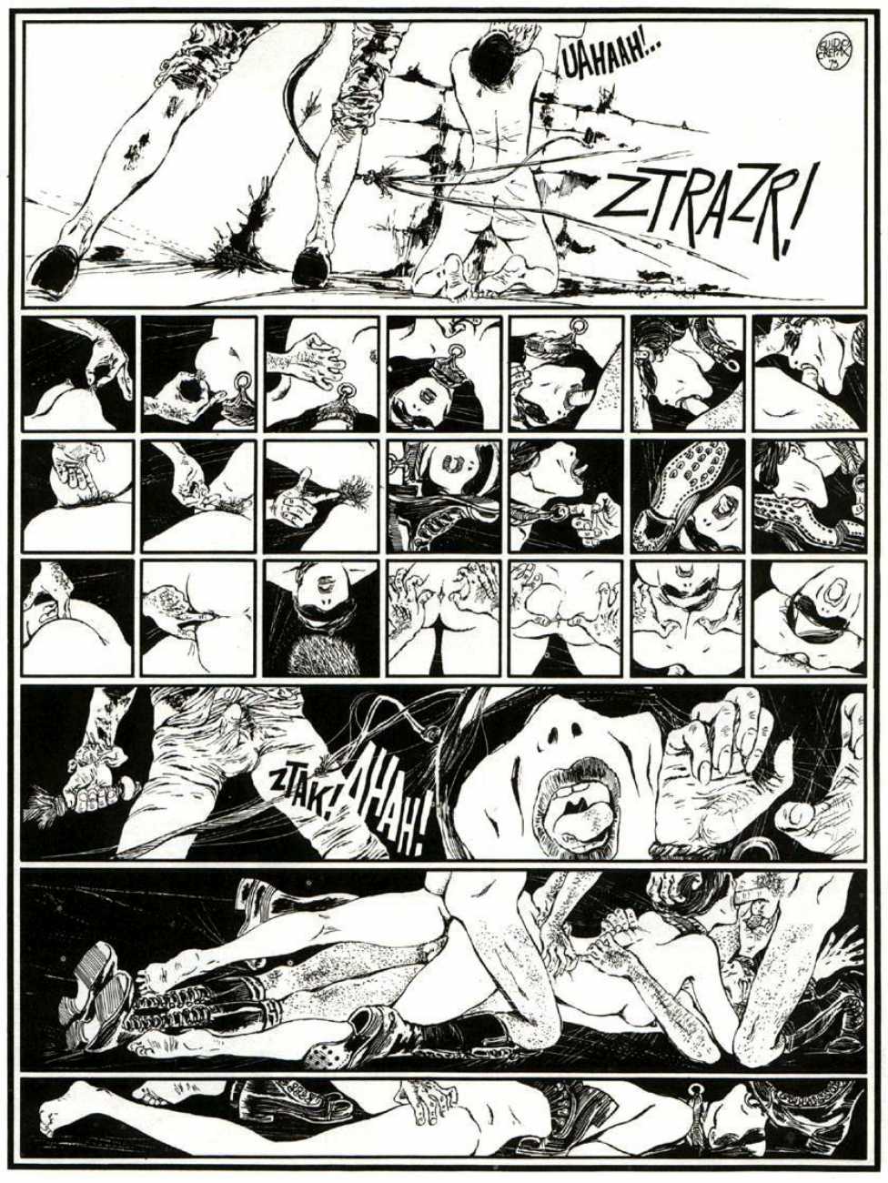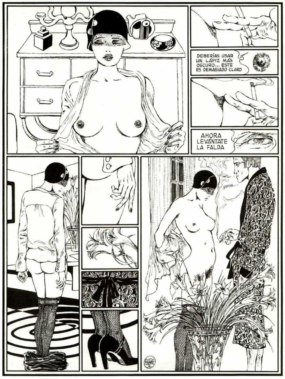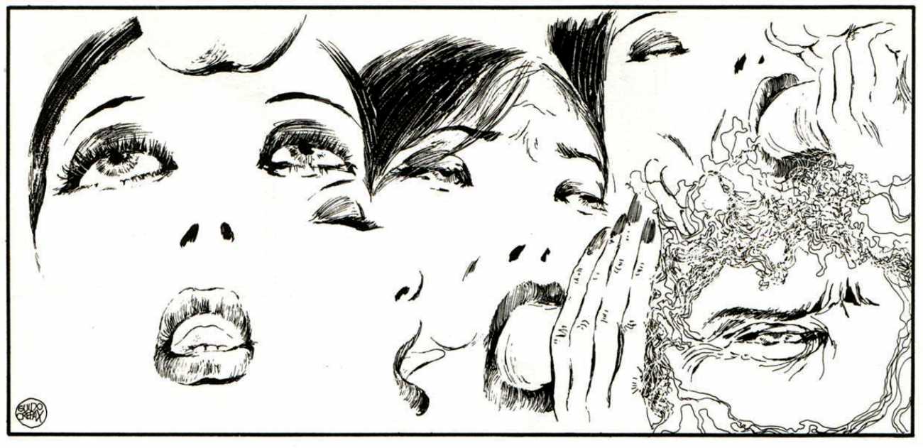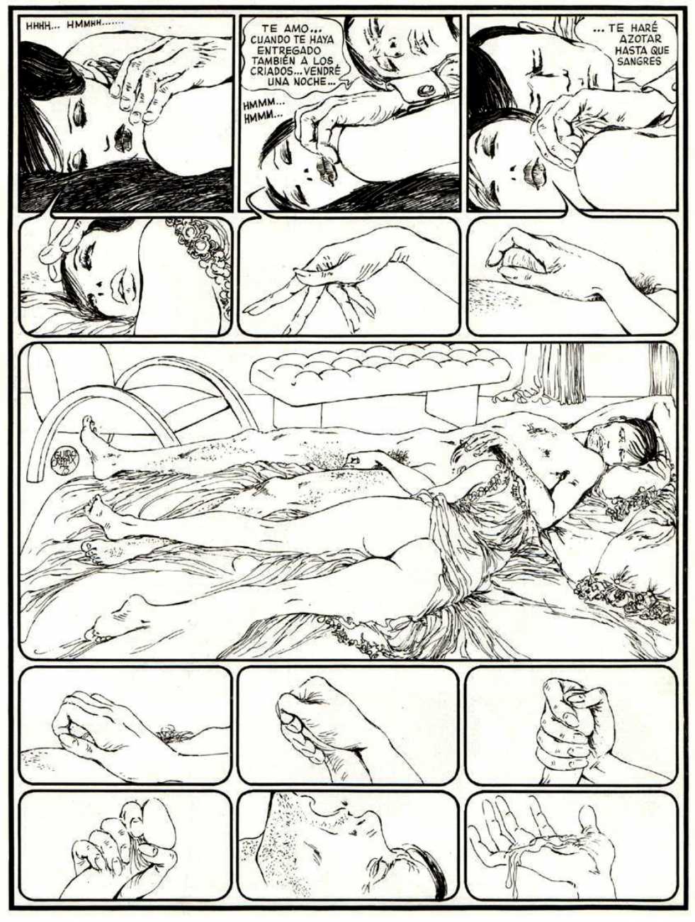 As Stefan Prince writes, ‘It could be said that Valentina, described by Graziano Frediani as “the allegory of a need, a mirror in fragments, the mark left from a laceration”, has in Crepax’s Story of O become Madam O, the plaything of the valets and members of the Roissy mansion, of her lover René who takes her there, and of Sir Stephen who claims ownership by having O branded with his initials. The story unfolds like an adult fairy tale, familiar territory for Crepax. With consummate skill, he takes every opportunity presented by this sadomasochistic literary classic to busy his pages with all manner of menace, stylised violence, eroticism and sex. Whips, masks, erect penises, rounded breasts, and marked buttocks proliferate. Wilinsky, the French illustrator, said Crepax drew the best ass of any comic strip artist, and certainly that part of O’s anatomy comes in for its full share of cruel treatment in Story of O.’