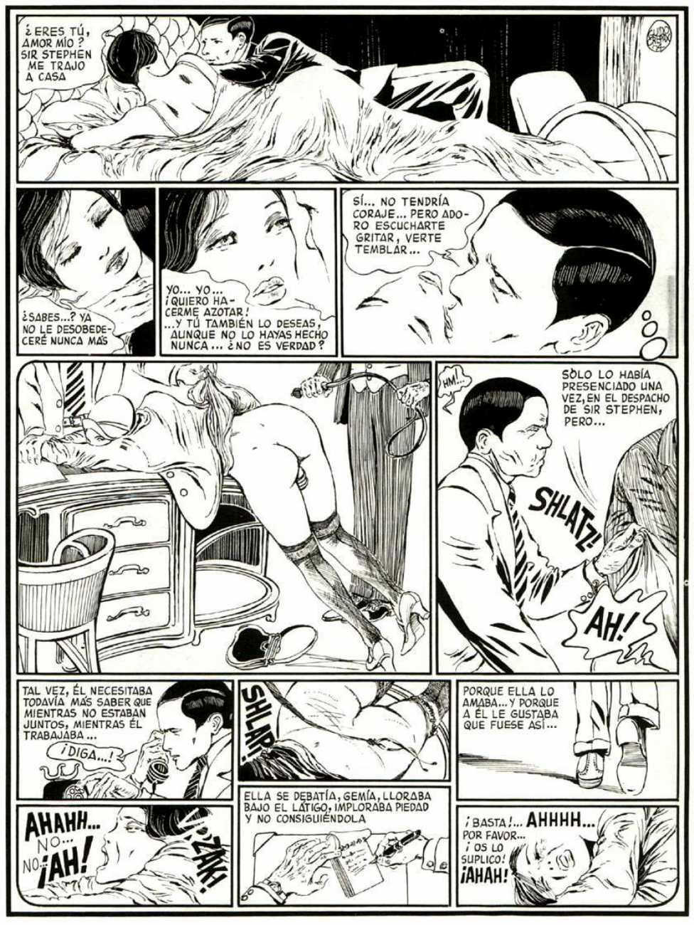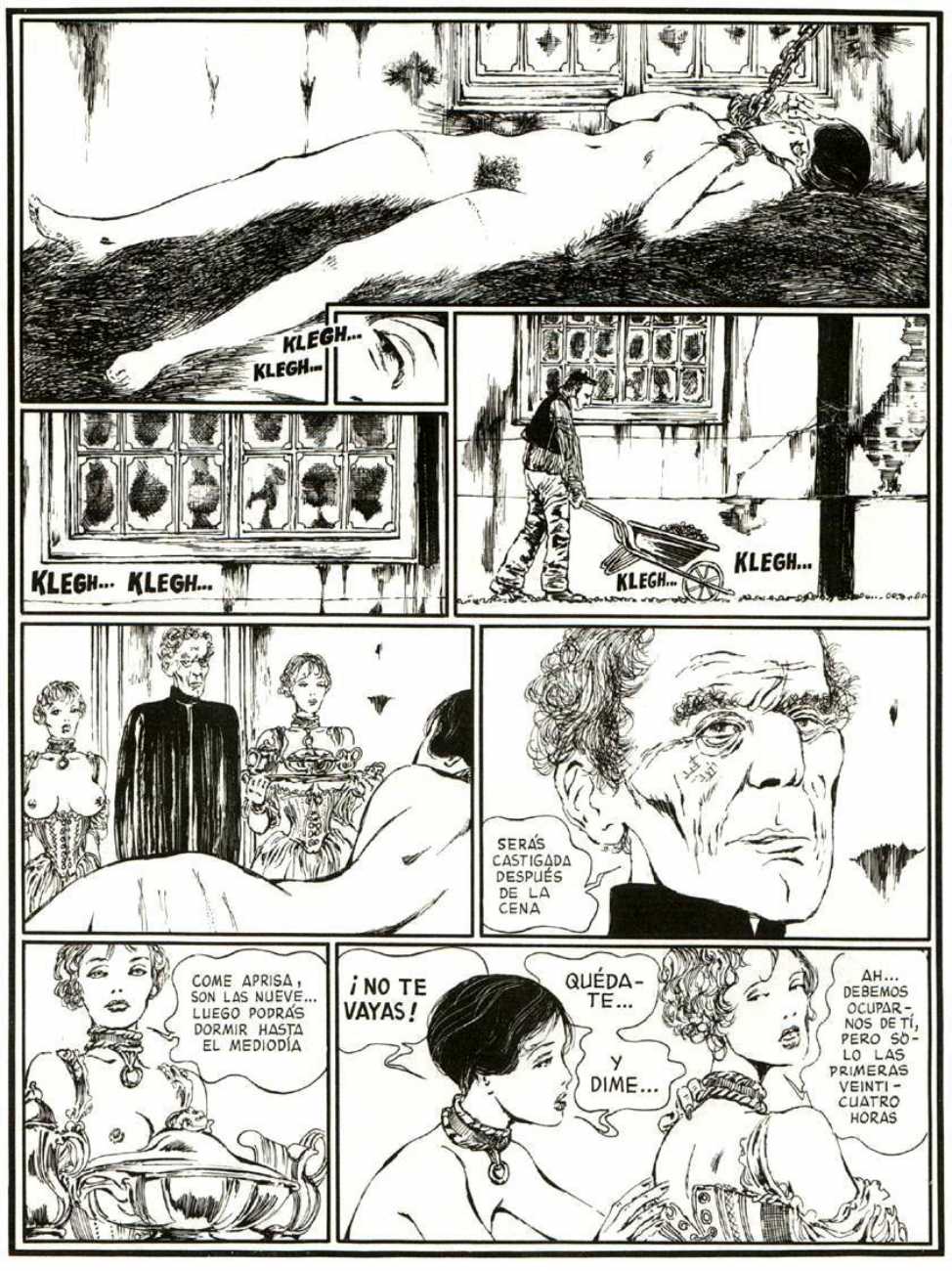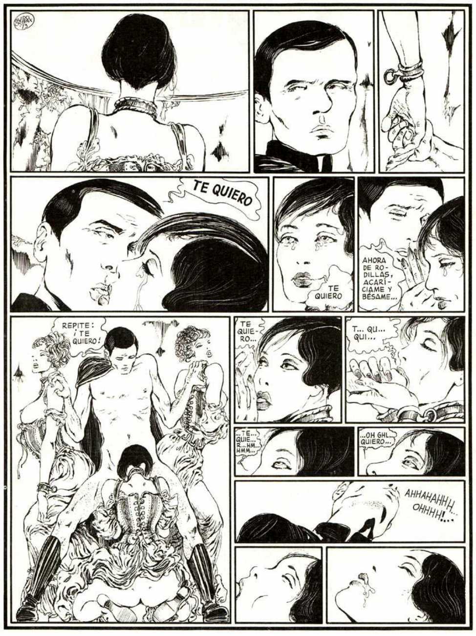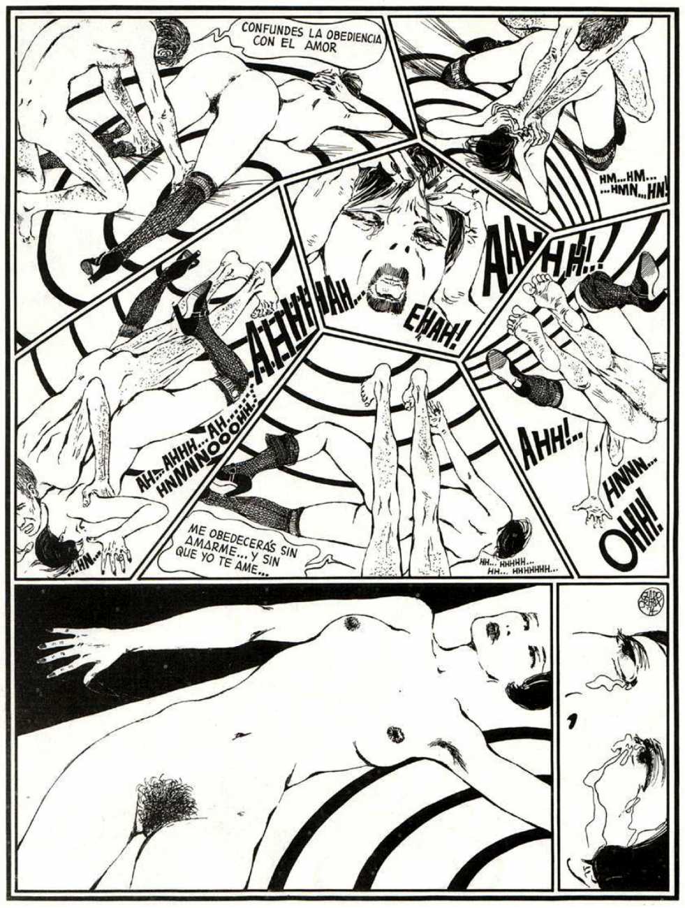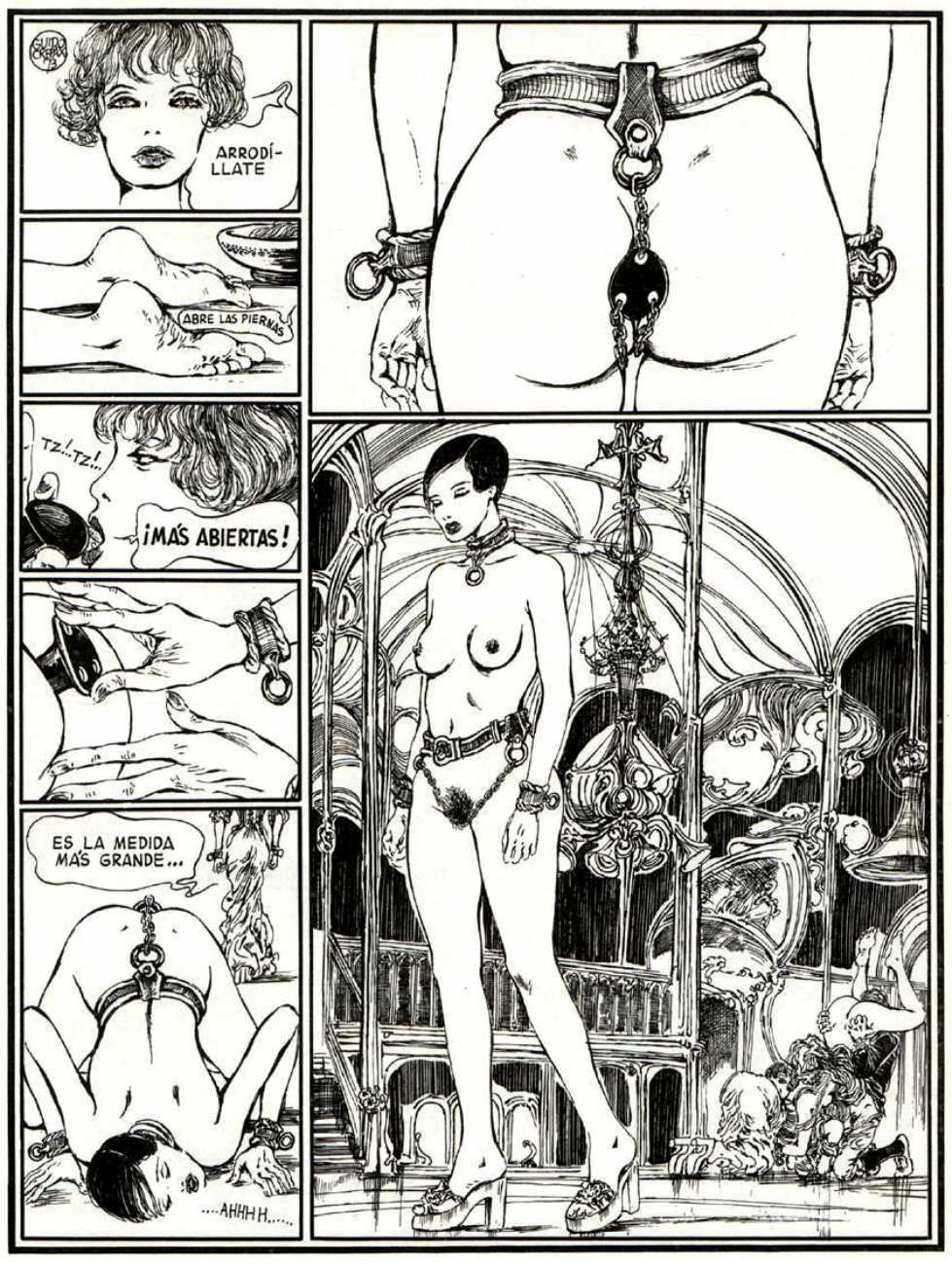As Stefan Prince writes, ‘It could be said that Valentina, described by Graziano Frediani as “the allegory of a need, a mirror in fragments, the mark left from a laceration”, has in Crepax’s Story of O become Madam O, the plaything of the valets and members of the Roissy mansion, of her lover René who takes her there, and of Sir Stephen who claims ownership by having O branded with his initials. The story unfolds like an adult fairy tale, familiar territory for Crepax. With consummate skill, he takes every opportunity presented by this sadomasochistic literary classic to busy his pages with all manner of menace, stylised violence, eroticism and sex. Whips, masks, erect penises, rounded breasts, and marked buttocks proliferate. Wilinsky, the French illustrator, said Crepax drew the best ass of any comic strip artist, and certainly that part of O’s anatomy comes in for its full share of cruel treatment in Story of O.’