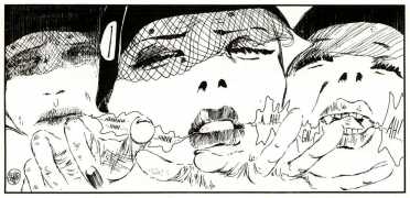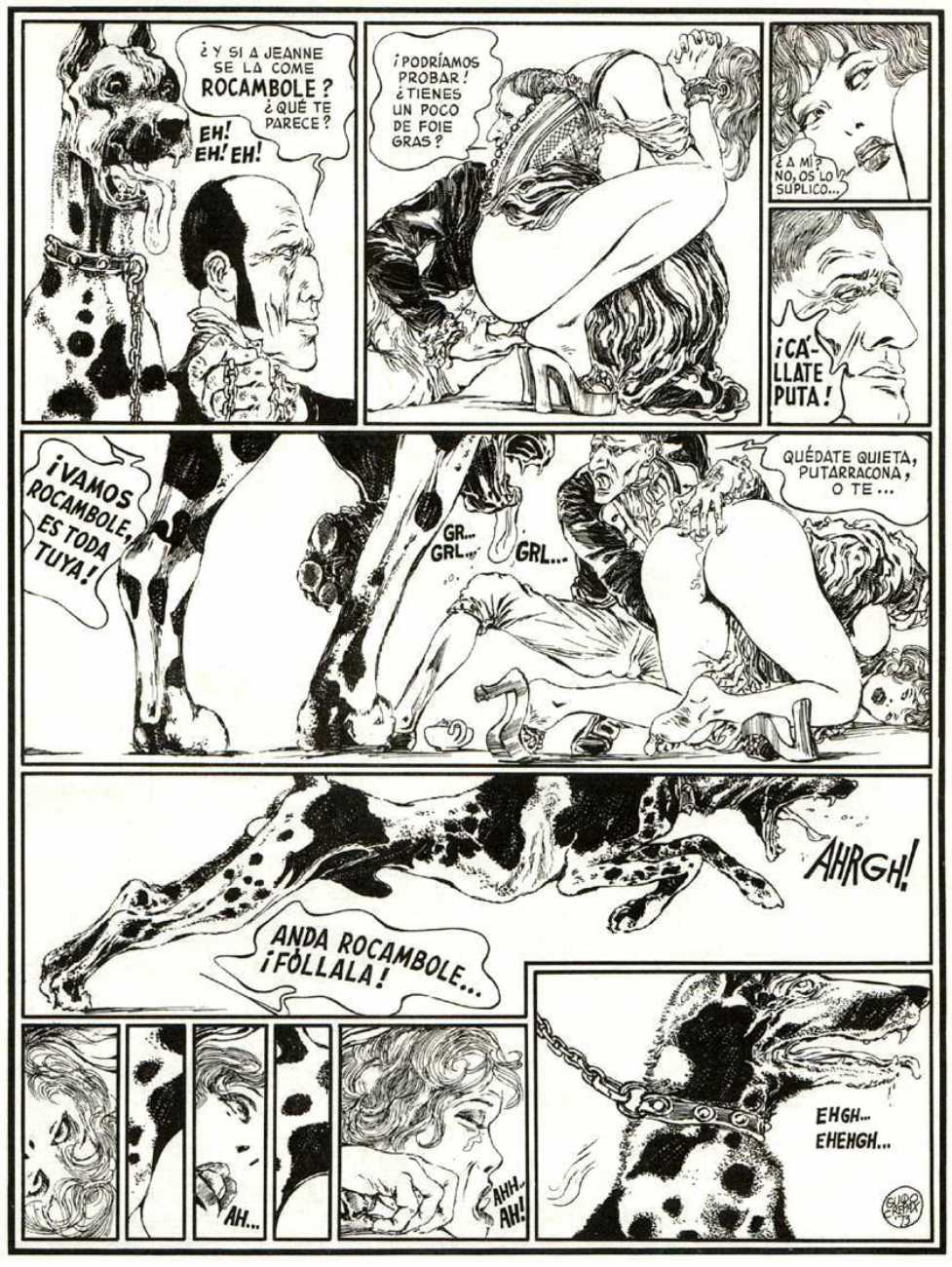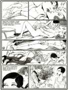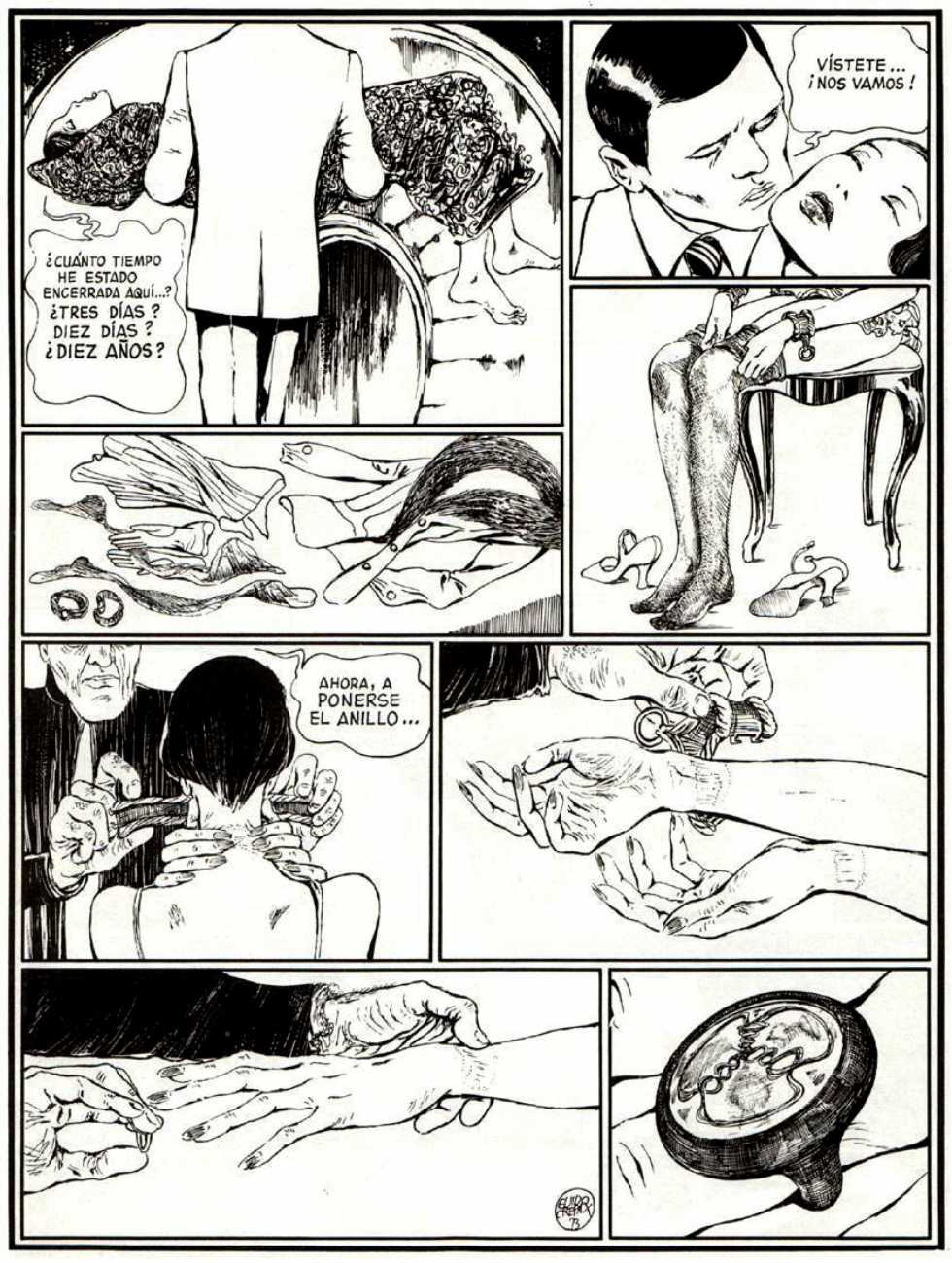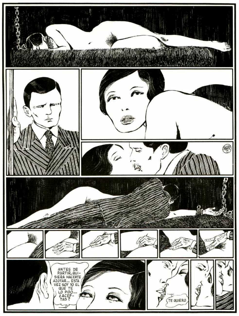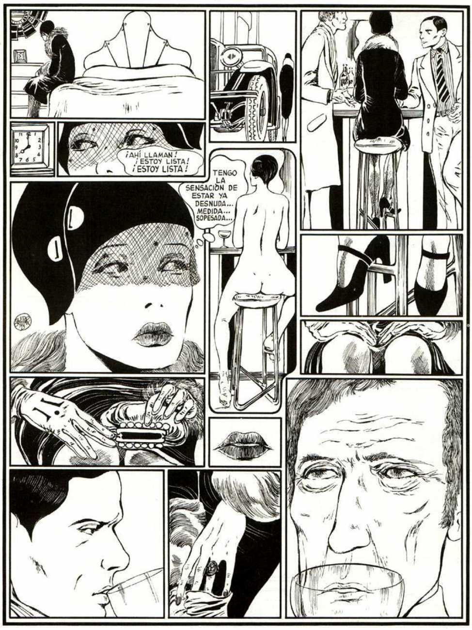 As Stefan Prince writes, ‘It could be said that Valentina, described by Graziano Frediani as “the allegory of a need, a mirror in fragments, the mark left from a laceration”, has in Crepax’s Story of O become Madam O, the plaything of the valets and members of the Roissy mansion, of her lover René who takes her there, and of Sir Stephen who claims ownership by having O branded with his initials. The story unfolds like an adult fairy tale, familiar territory for Crepax. With consummate skill, he takes every opportunity presented by this sadomasochistic literary classic to busy his pages with all manner of menace, stylised violence, eroticism and sex. Whips, masks, erect penises, rounded breasts, and marked buttocks proliferate. Wilinsky, the French illustrator, said Crepax drew the best ass of any comic strip artist, and certainly that part of O’s anatomy comes in for its full share of cruel treatment in Story of O.’