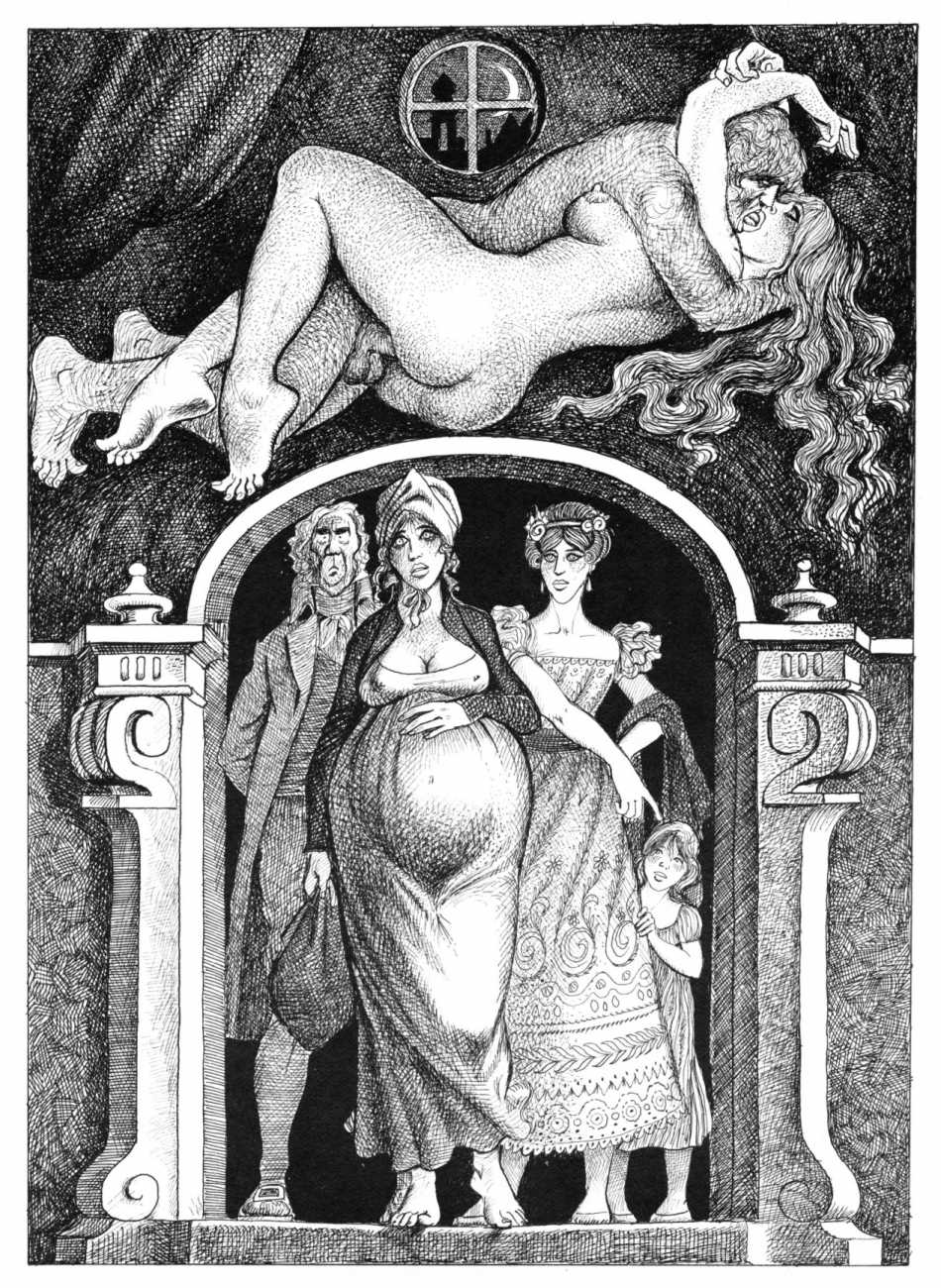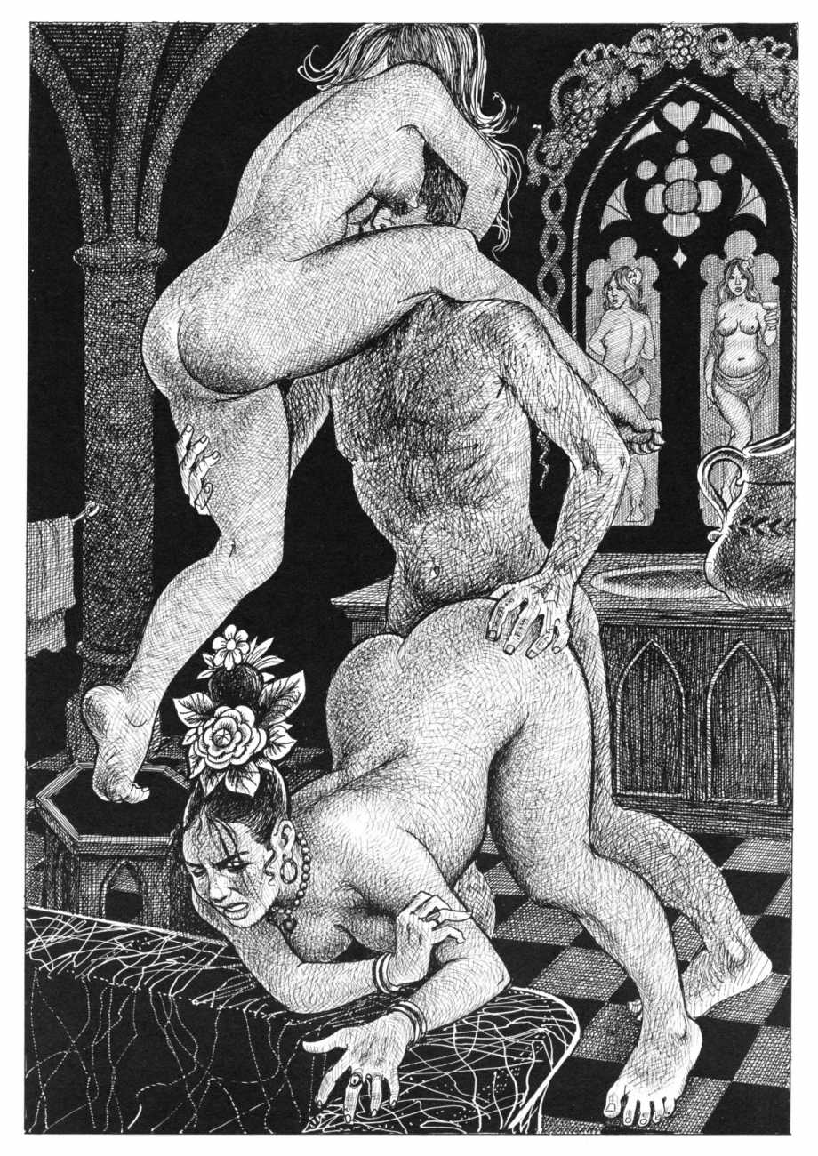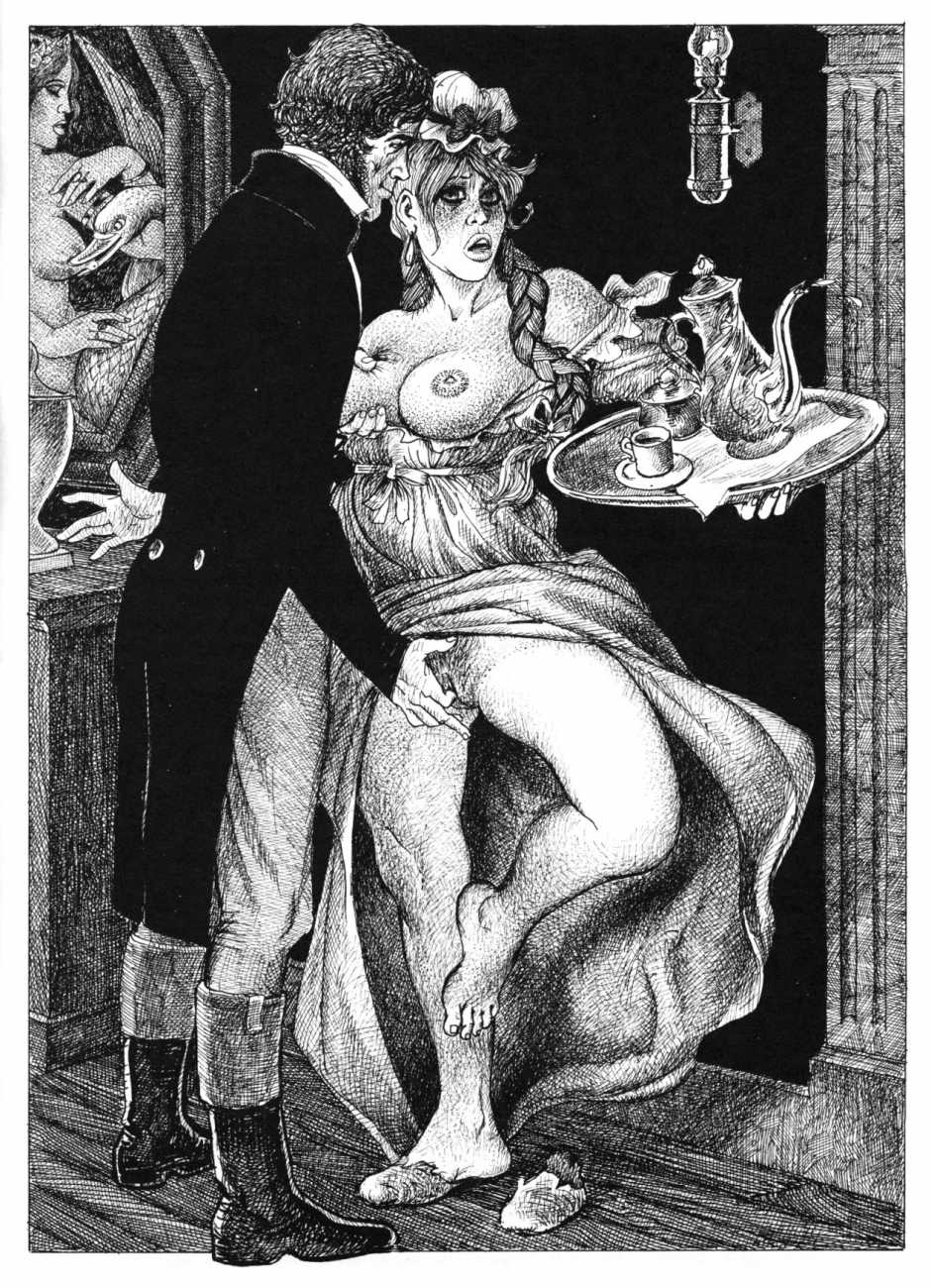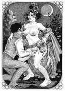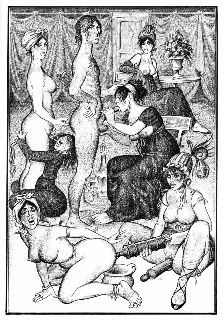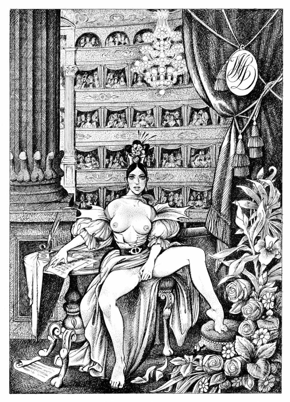 The Pichard-illustrated edition, like Trois filles de leur mère, takes the extremes of an extreme text to even greater extremes, concentrating on the wilder reaches of Volume Two. Unusually for Pichard, Mémoires d’une chanteuse allemande includes a large number of simple line drawings in addition to the detailed full-page illustrations; they show him to be a master of this format.