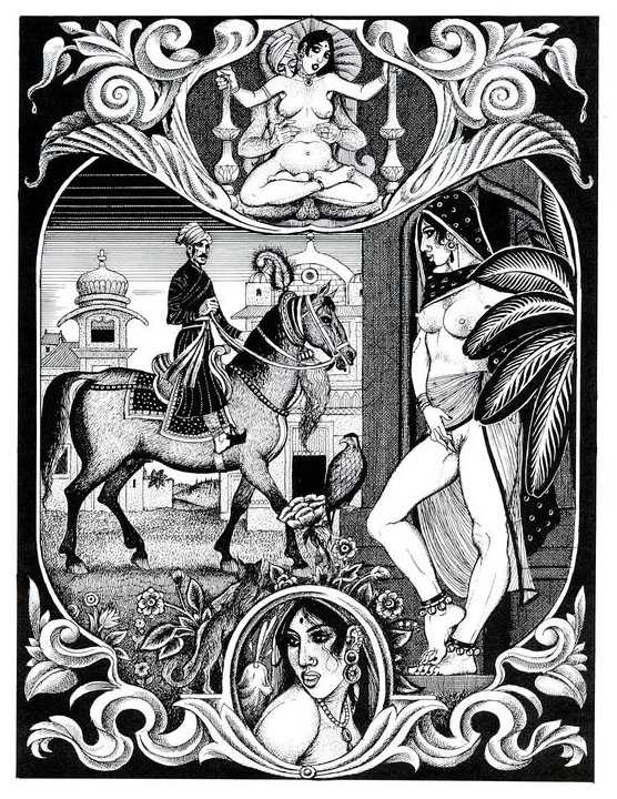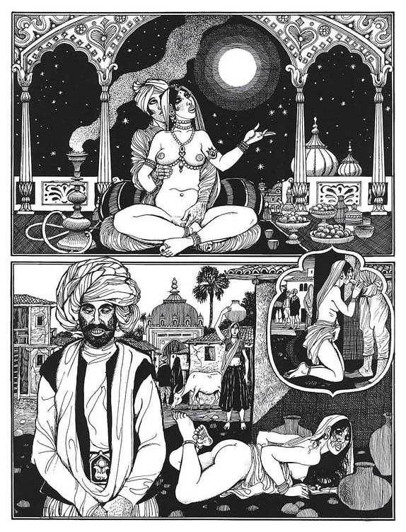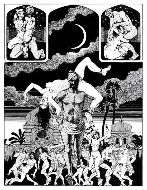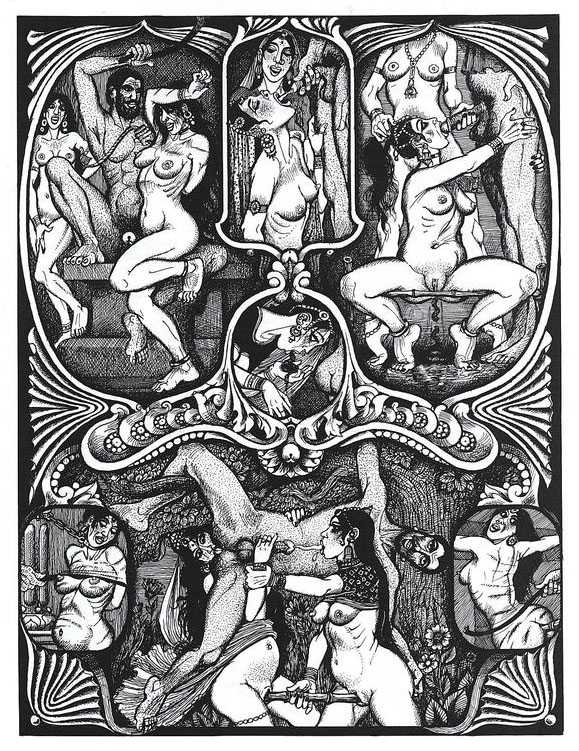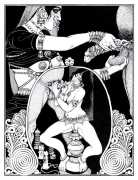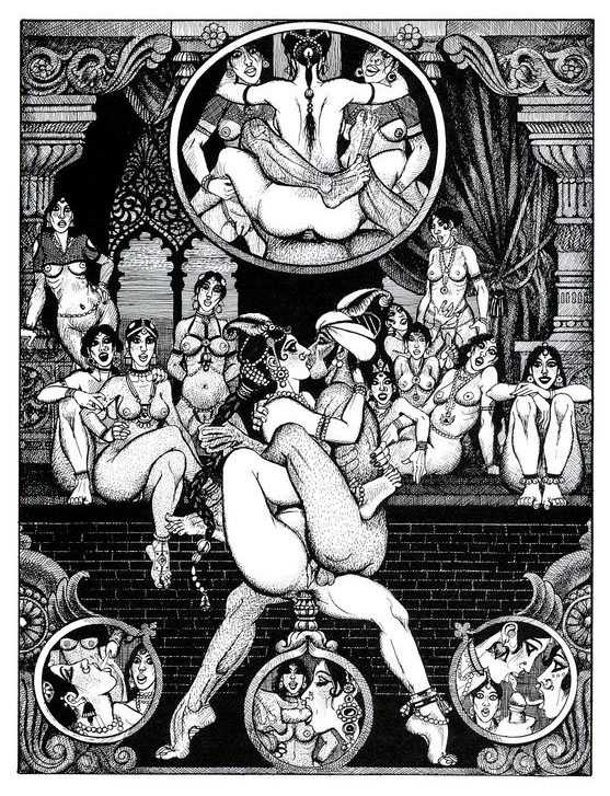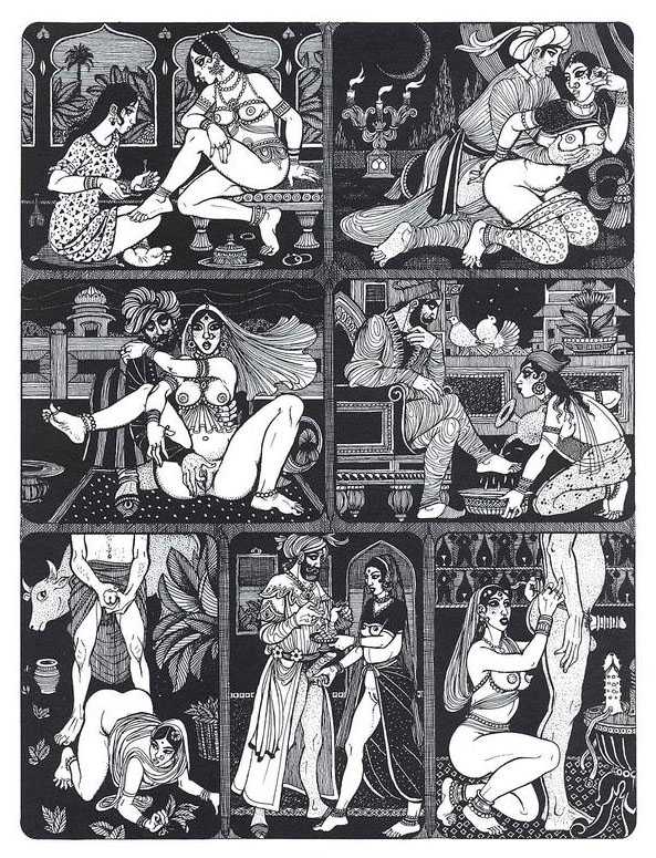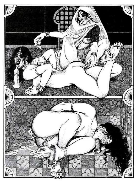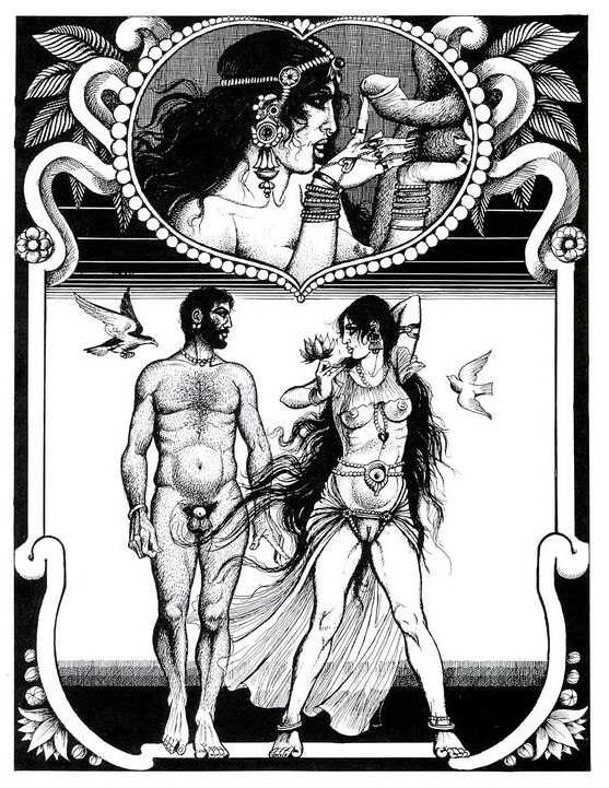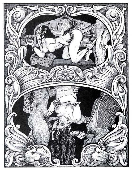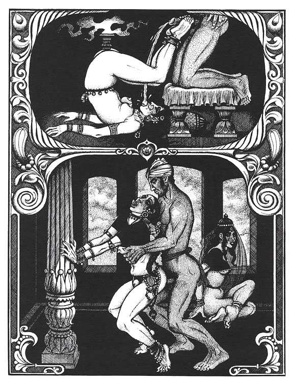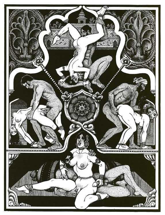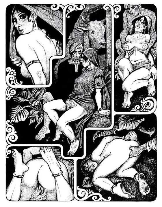 Following the success of La comtesse rouge, Dominique Leroy commissioned a set of illustrations from Pichard to accompany Vâtsyâyana’s classic Indian lovemaking manual Kama Sutra. After the violence and torture of Marie-Gabrielle and Erzsébet Báthory, Kama Sutra is blessedly violence-free, and demonstrates Pichard’s skill in designing single pages as works of art. It is also worth noting that compared with some of his earlier work, he has – of necessity in such a comprehensive work of sexual technique – learned how to draw more lifelike lingams.
