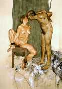 As Ana Bambic Kostov wrote in a Provoke! review of the Building Bridges exhibition, ‘Subject is instantly the first thing an observer notices when gazing upon Mannelli’s works – nude couples in pre- or post-coital embrace, naked women juxtaposed with fully-dressed men, overtly seductive dames, coy girls, and above all sadomasochistic scenes involving, quite bravely, members of high society and clergy. The first encounter with these paintings can be either keen interest or shame, perhaps even arousal, but other than their perfect superficial aspect, Mannelli’s erotic compositions are much more profound.’
