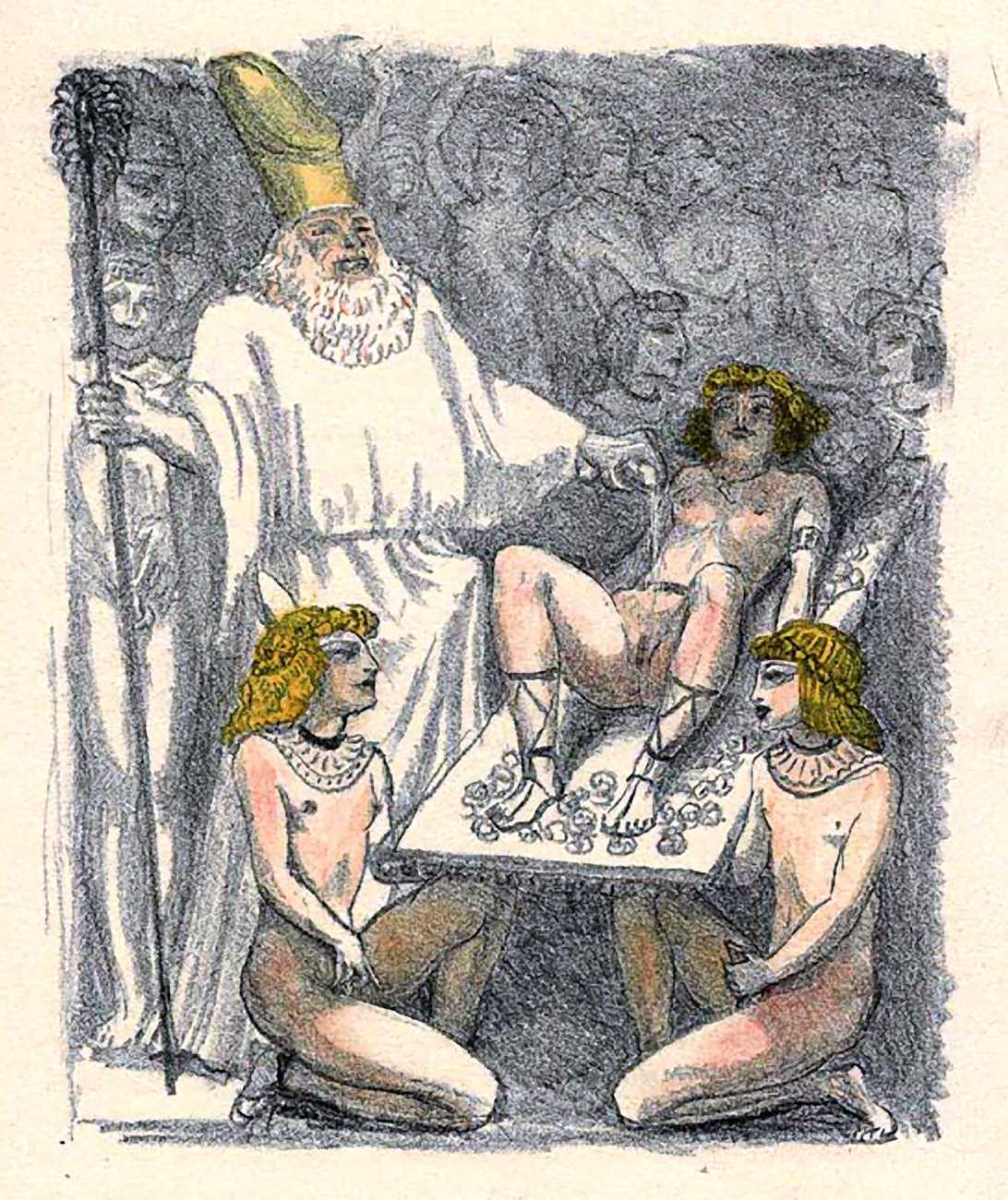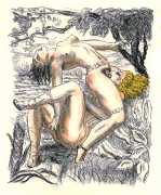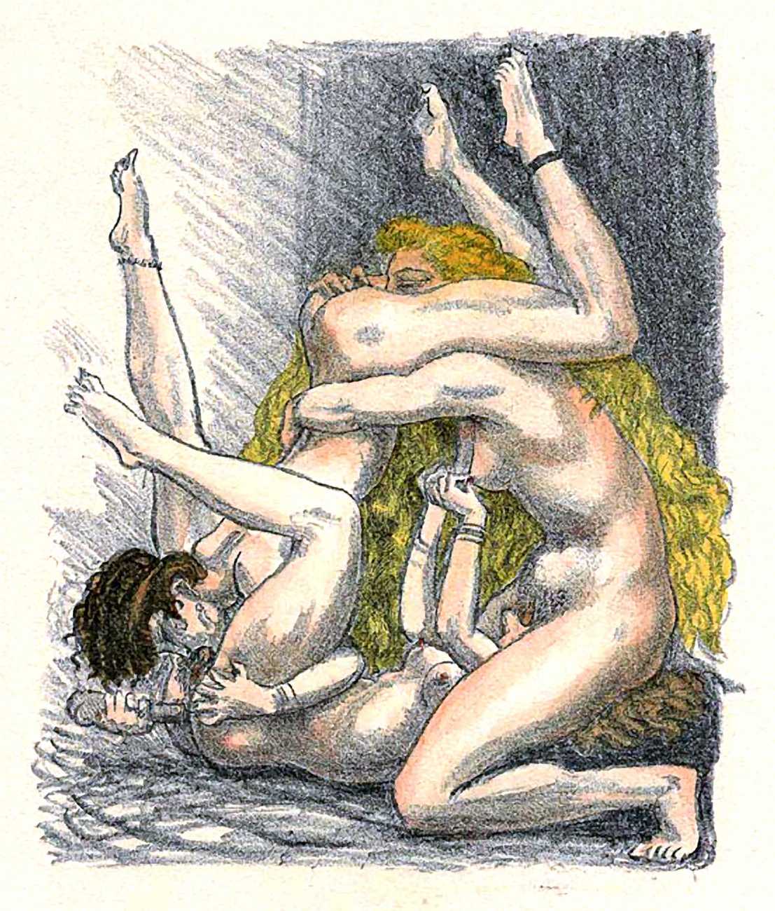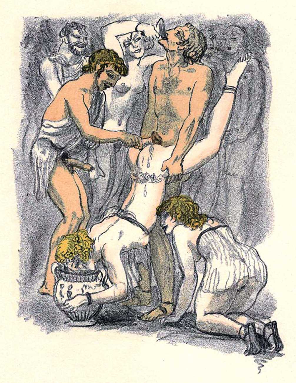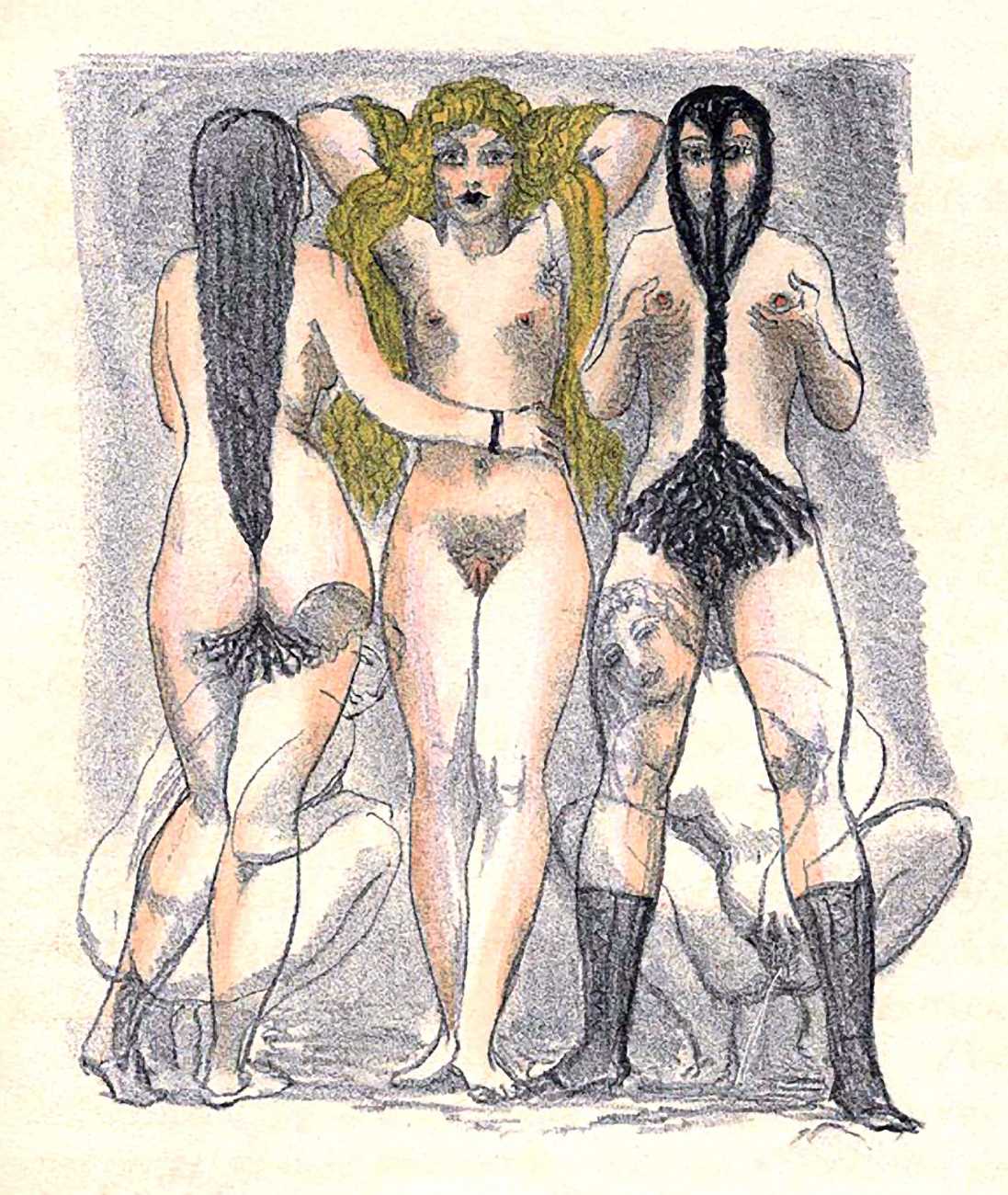As well as illustrating actual scenes from Louÿs’ bestseller, Villa added a number of his own imagining, making this edition, published ‘Aus depèns d’un amateur’ (at the expense of a presumably deep-pocketed collector), probably the most explicit ever produced. The skilful use of lithography together with a restrained colour palette creates a lively sense of imagined classical revelries.