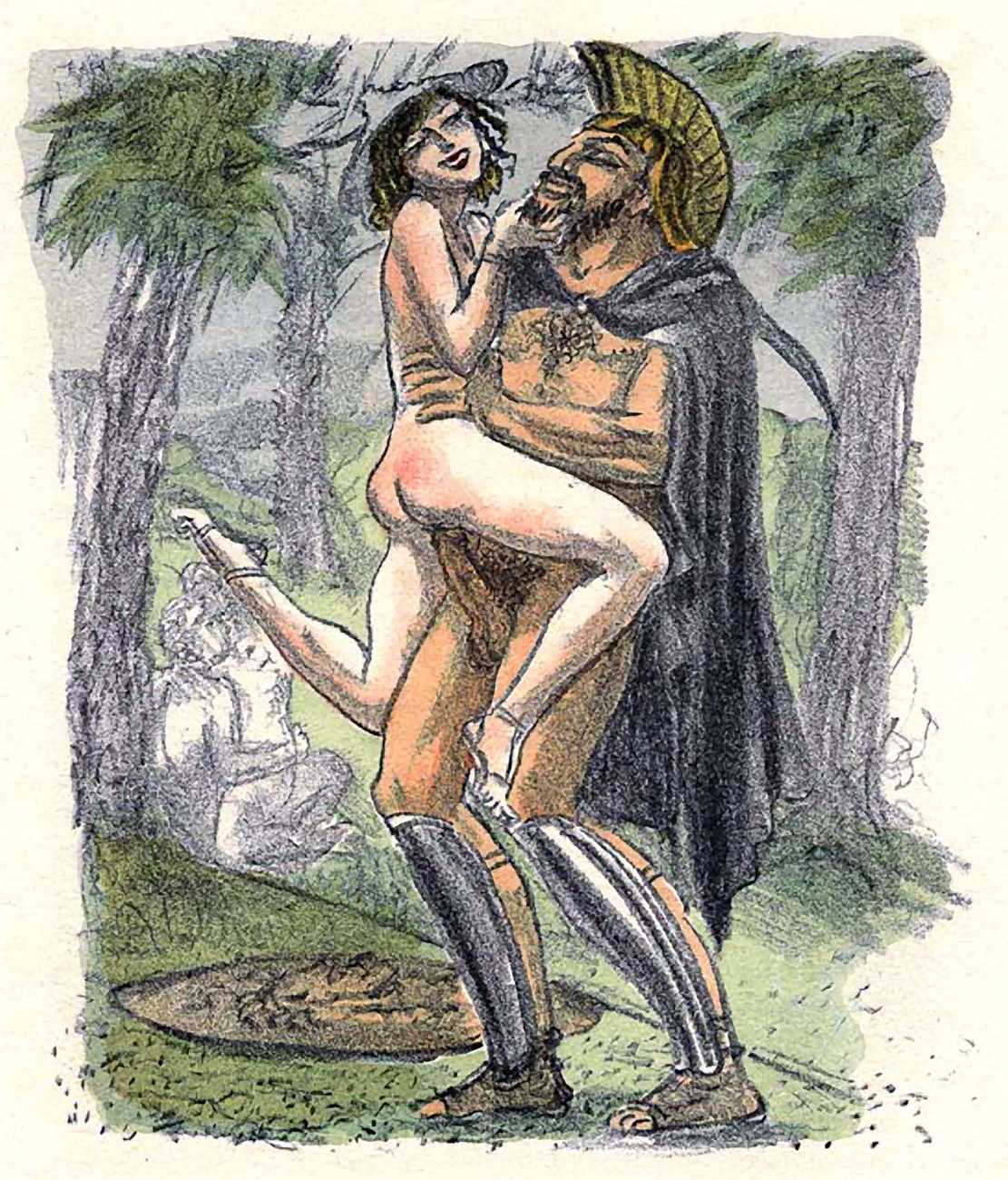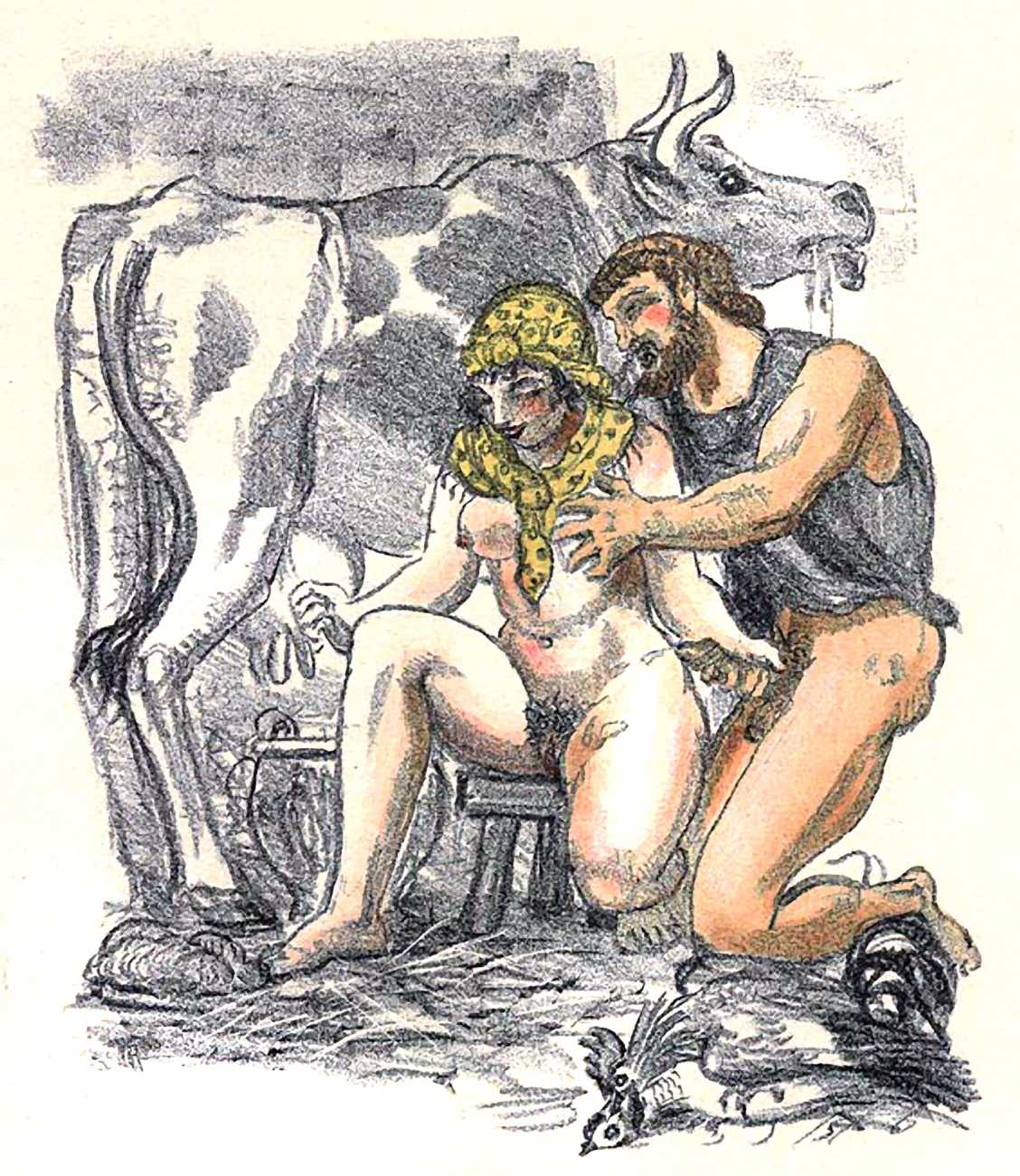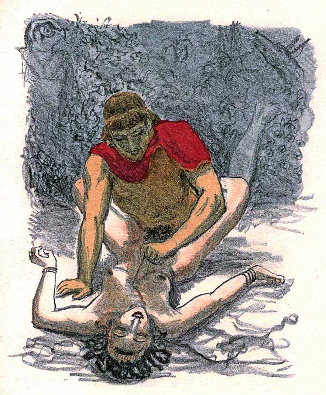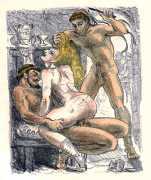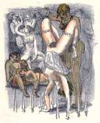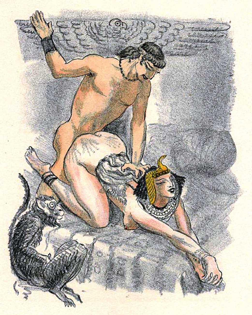 As well as illustrating actual scenes from Louÿs’ bestseller, Villa added a number of his own imagining, making this edition, published ‘Aus depèns d’un amateur’ (at the expense of a presumably deep-pocketed collector), probably the most explicit ever produced. The skilful use of lithography together with a restrained colour palette creates a lively sense of imagined classical revelries.