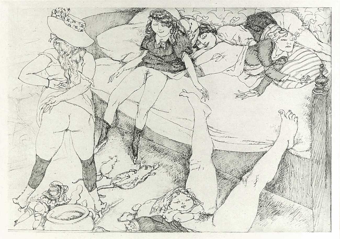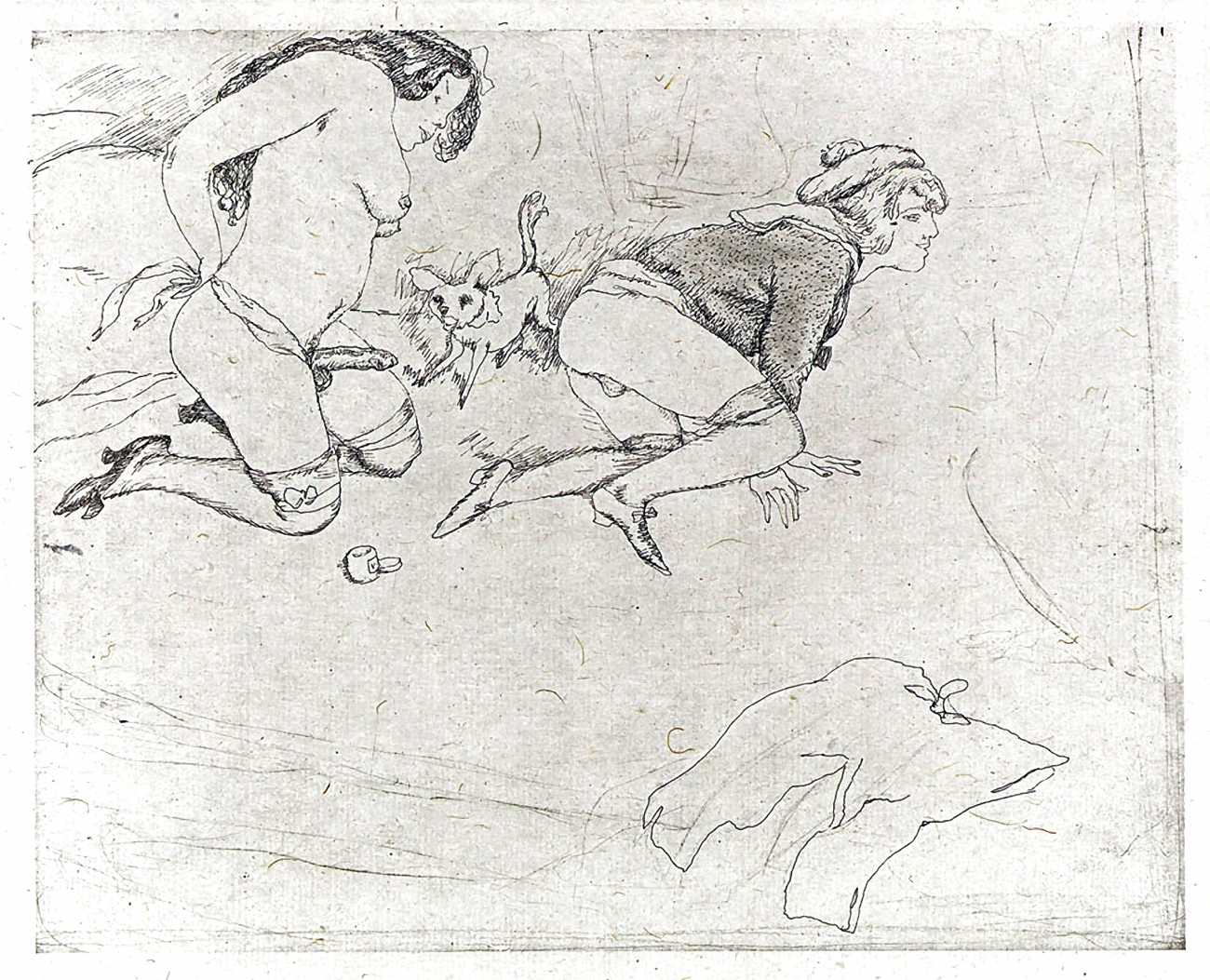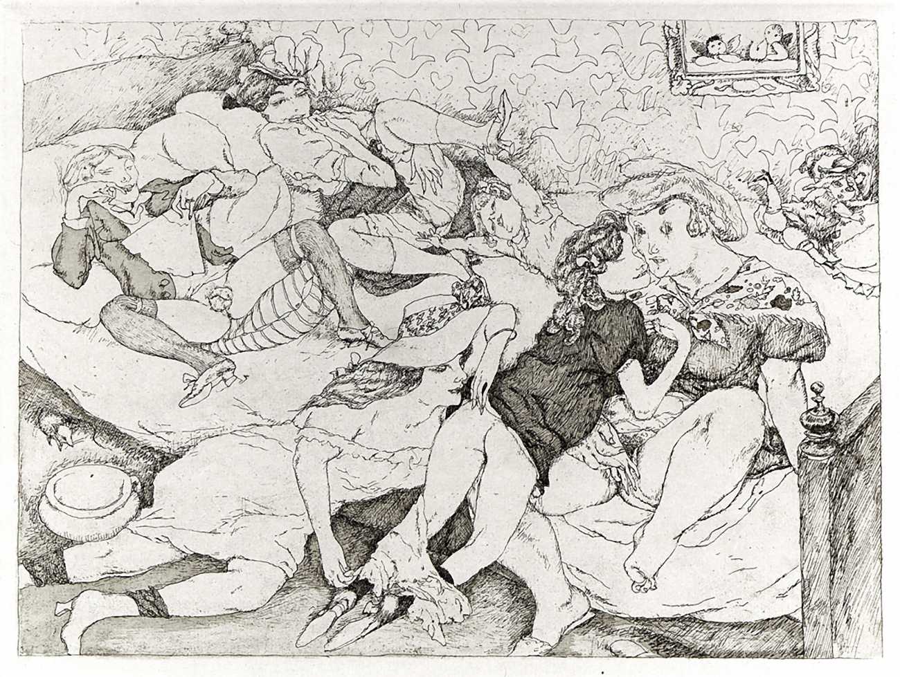 Each of the nine plates illustrates what at first might appear to be an innocent domestic scene with children, pets and toys scattered around bedrooms and parlours, but on closer inspection nearly everyone – even the toys and pets – is involved in some kind of sexual exploration, from exhibitionism and self-stimulation to voyeurism and oral sex. Erotikon is rare among erotic portfolios in that, like some of von Bayros’s prints, it depicts characters with whom the viewer can immediately identify, involved in what might be characterised as imaginable everyday eroticism.