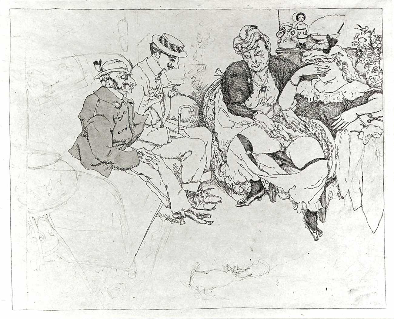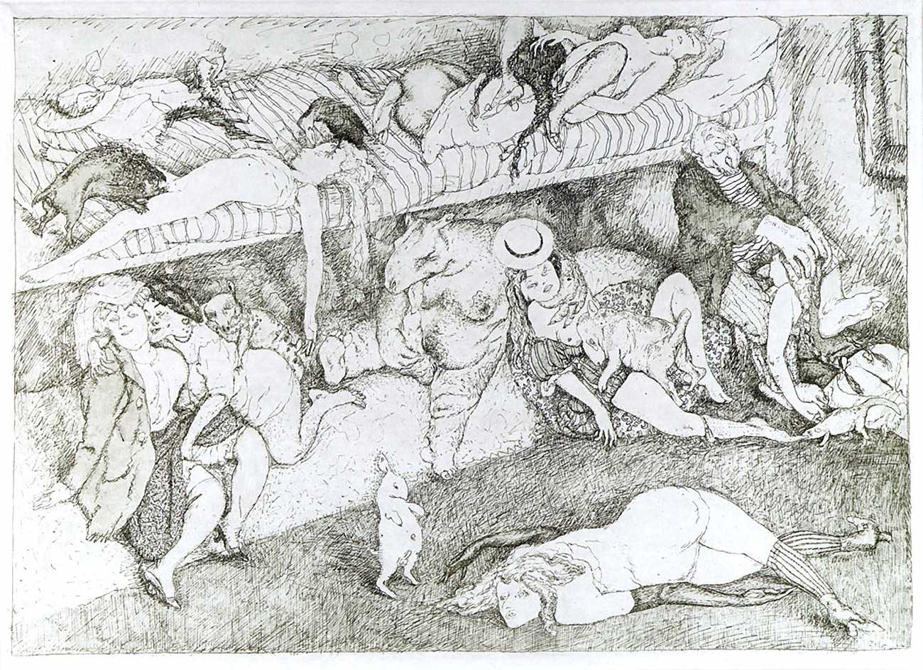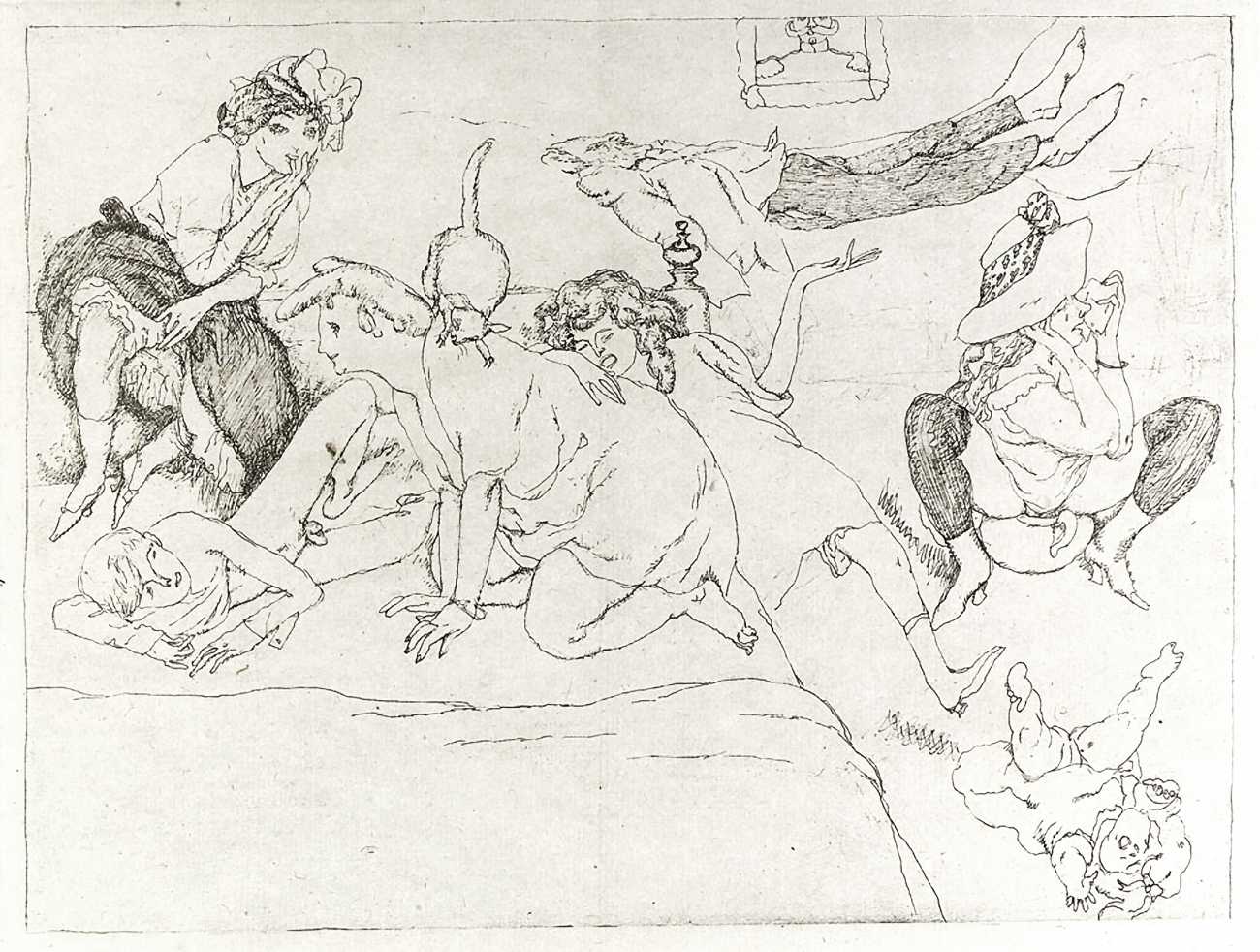 Each of the nine plates illustrates what at first might appear to be an innocent domestic scene with children, pets and toys scattered around bedrooms and parlours, but on closer inspection nearly everyone – even the toys and pets – is involved in some kind of sexual exploration, from exhibitionism and self-stimulation to voyeurism and oral sex. Erotikon is rare among erotic portfolios in that, like some of von Bayros’s prints, it depicts characters with whom the viewer can immediately identify, involved in what might be characterised as imaginable everyday eroticism.