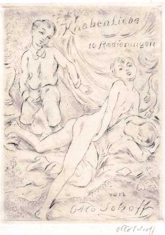 Otto Schoff’s 1925 portfolio Knabenliebe (Boys’ Love), another unattributed Gurlitt collaboration, is very much at the ‘innocent’ end of the homoerotic spectrum. The participants nearly all appear to be in their early teens, doing what boys in their early teens do, checking their own and each other’s appendages. The cutest is probably the image of the pierrot and the ballet dancer fondling each other’s diminutive penises.