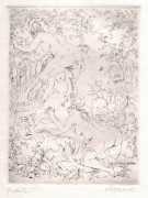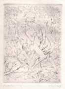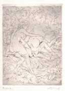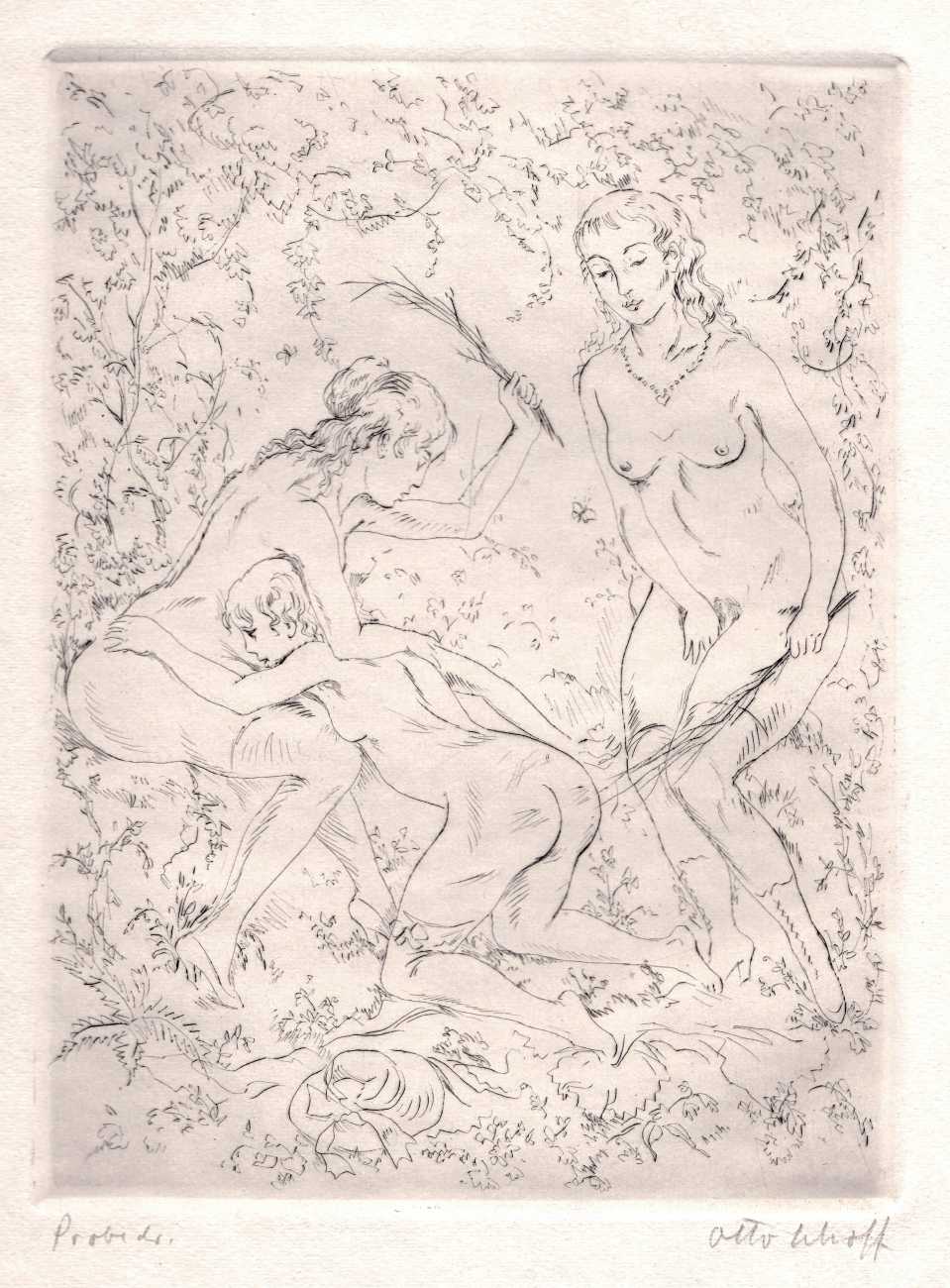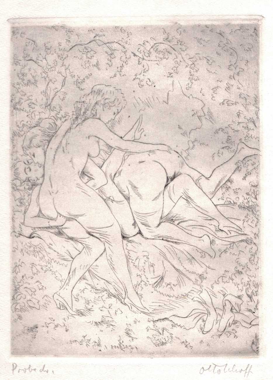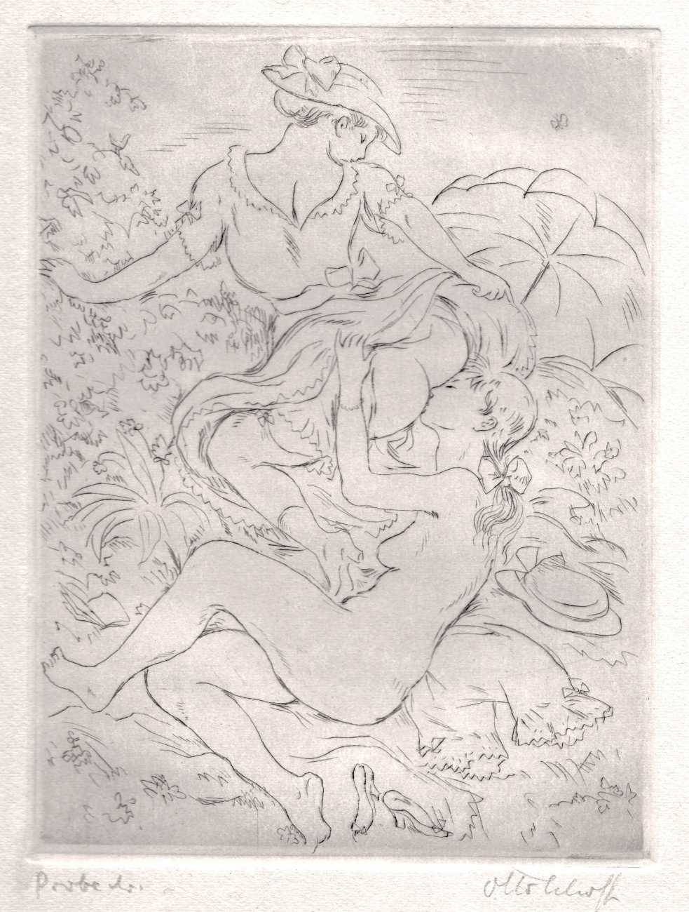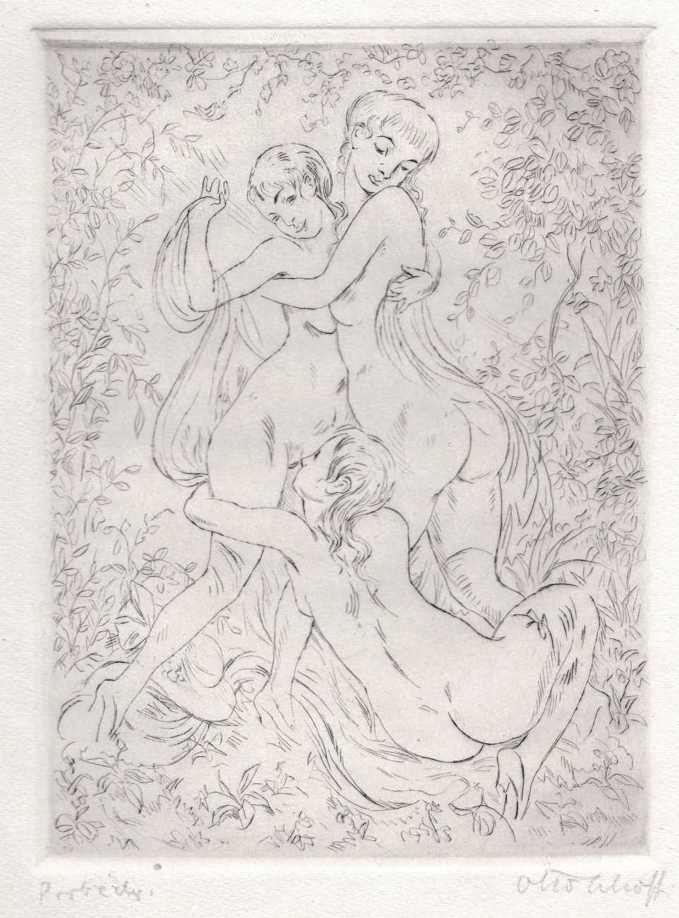 Otto Schoff’s first portfolio of erotic engravings, Aus dem Reiche Sapphos (From Sappho’s Realm), was published by Wolfgang Gurlitt. The imaginative and free-flowing images show two, sometimes three, young women disporting themselves in an outdoor setting, clearly enjoying each other’s sensuality. The smaller engraving is a tailpiece.