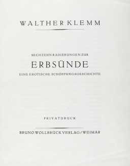 Klemm was fortunate that he knew Bruno Wollbrück, the enterprising son of the Berlin bookseller Auguste Wollbrück, who after the war set up a publishing company in Weimar specialising in art prints. Bruno Wollbrück Verlag had already commissioned the artists Max Thalmann and Heinrich Linzen, so when Klemm suggested that Bruno publish Erbsünde the young publisher readily agreed. The 360 elegantly-presented copies sold quickly, but the anticipated positive critical response never materialised. It had been expected that the newly-established Weimar Reichskunstwart (State Art Agency) under the liberal directorship of Edwin Redslob would be positively inclined towards progressive art, and the influential artist Max Liebermann stated publicly that Erbsünde was in no way obscene, but during a period in which many utopian dreams were dimmed by social and political forces, more conservative voices prevailed, and there were threats of legal action and the blacklisting of both Klemm and Wollbrück.