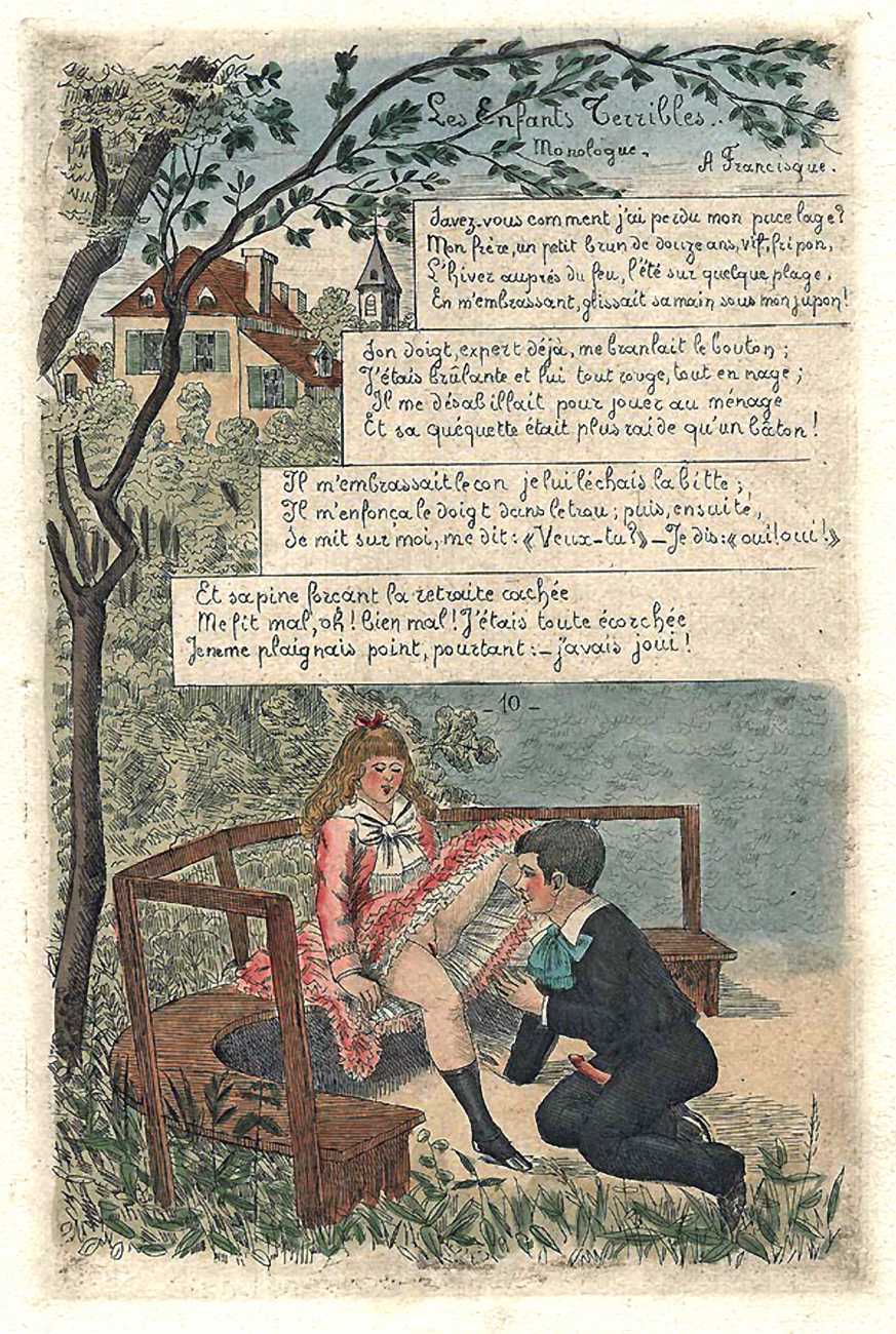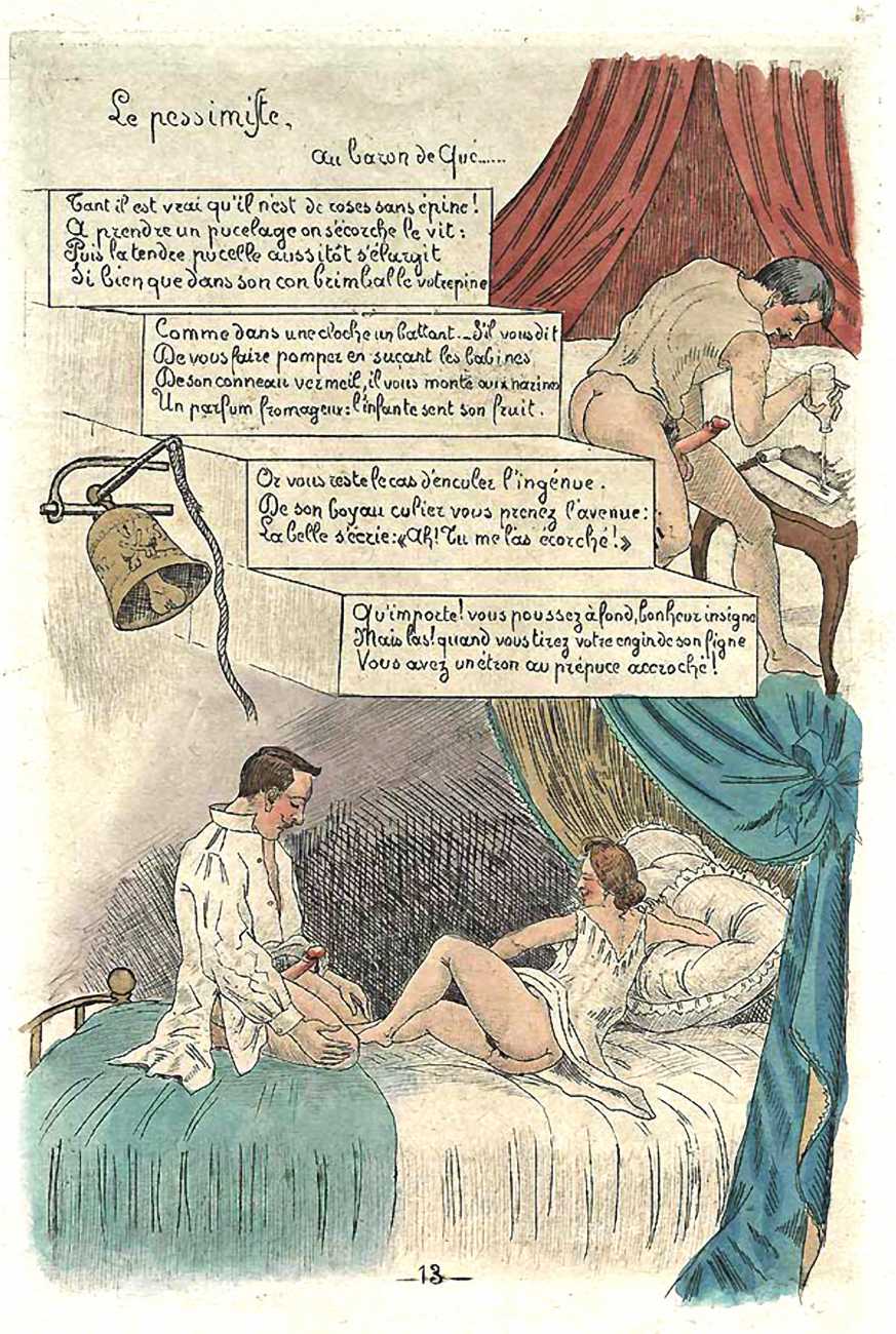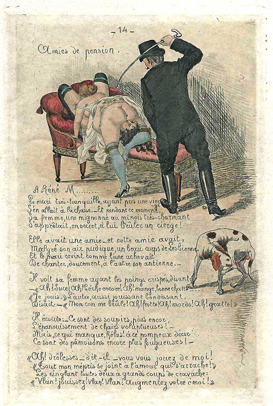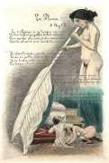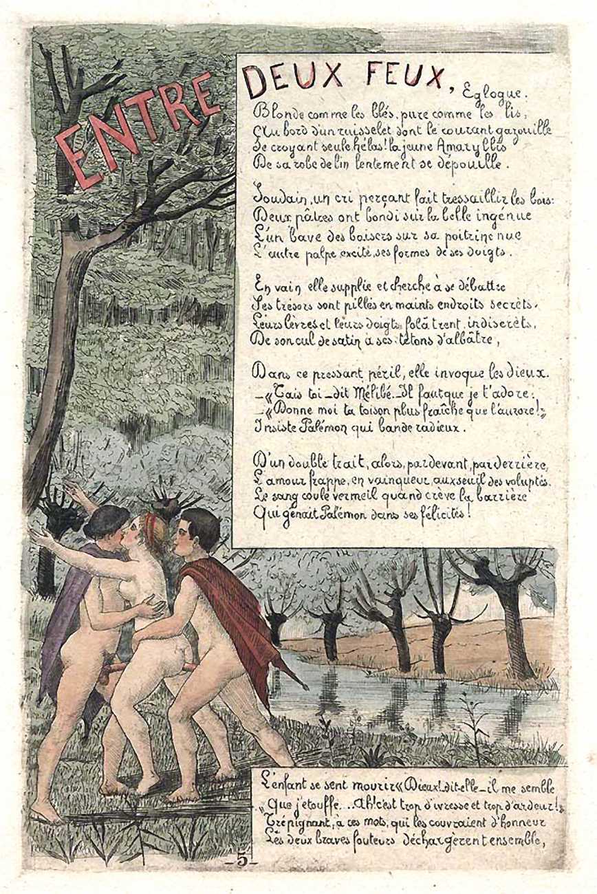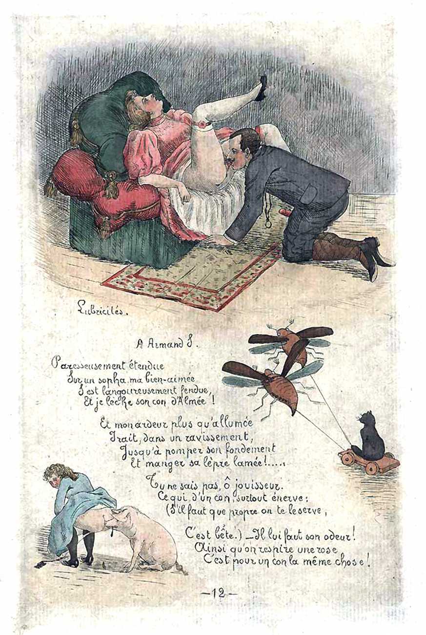 Each of the lithographs incorporates an original poem, some with abbreviated dedications, and a series of hand-coloured illustrations mirroring the subject of the poem. The poems are extremely sexually explicit, or as the French would say ‘très libre’, and they are rather good.