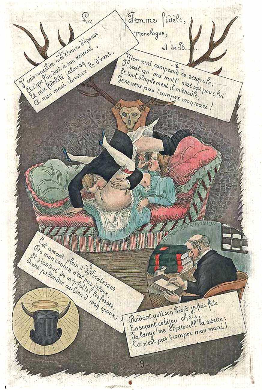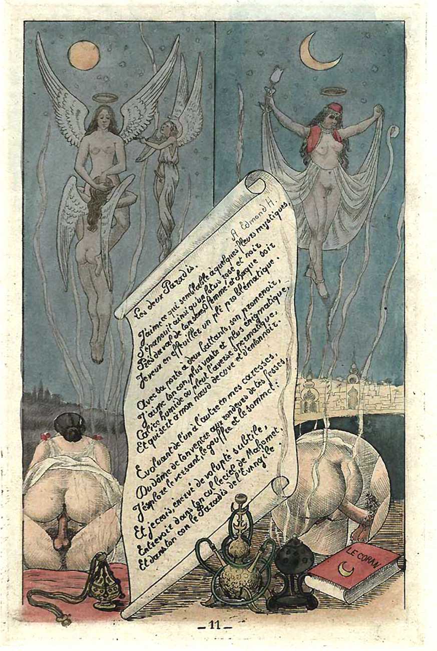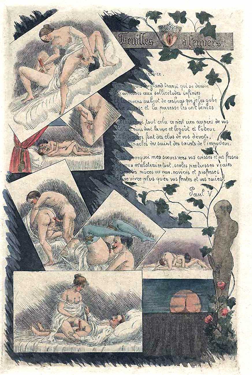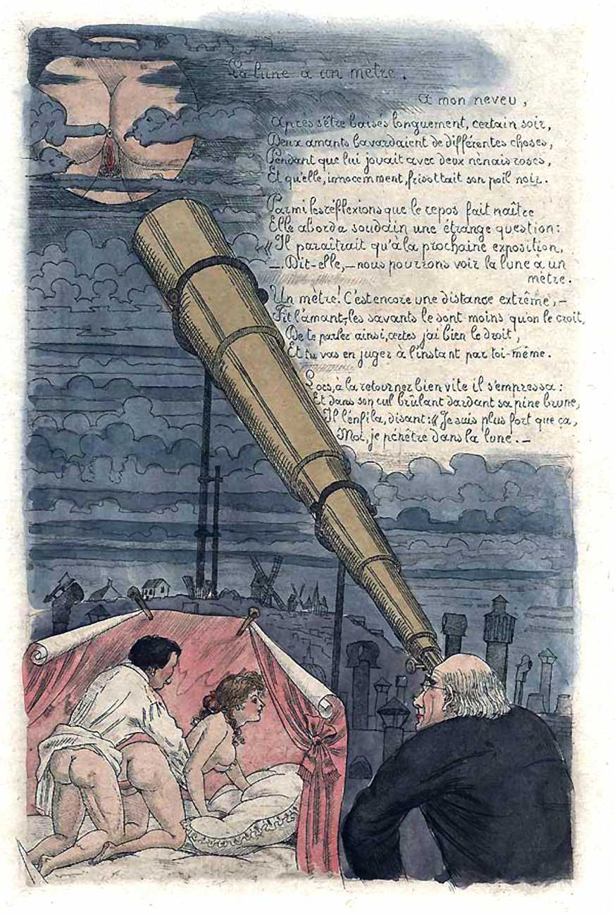 Each of the lithographs incorporates an original poem, some with abbreviated dedications, and a series of hand-coloured illustrations mirroring the subject of the poem. The poems are extremely sexually explicit, or as the French would say ‘très libre’, and they are rather good.