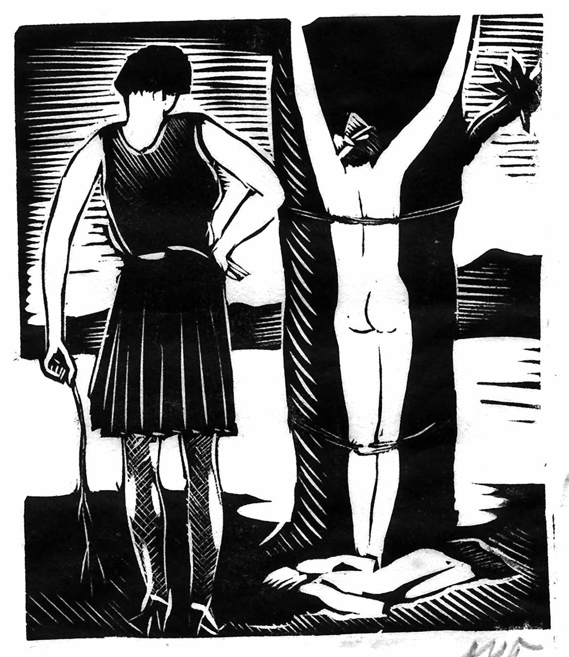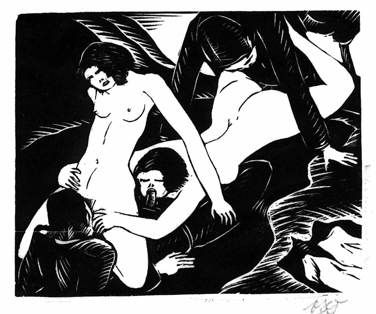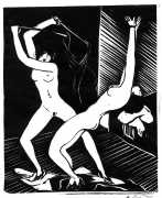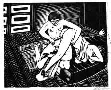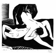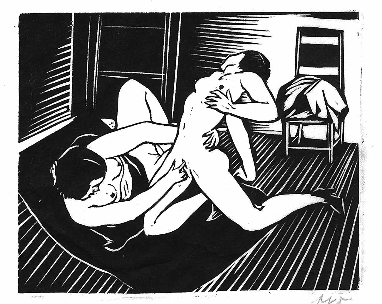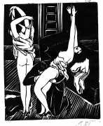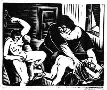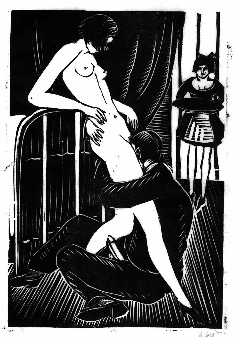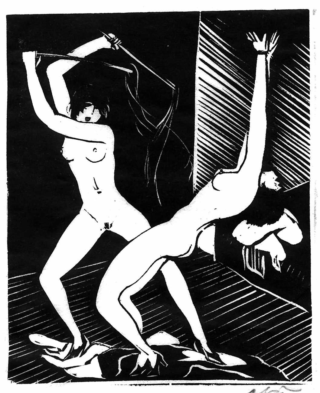 Much less well known are his erotic woodcuts, but it was inevitable that Schatz would regularly combine what was probably his favourite artistic medium with one of his most enduring subjects, sex in general and flagellation in particular. He was undoubtedly active in Vienna’s thriving alternative scene, and through these bold woodcuts was able to match the erotic edge of sexual exploration with the strokes of his experienced chisel. This series of woodcuts with an erotic theme was put together in around 1928.
