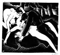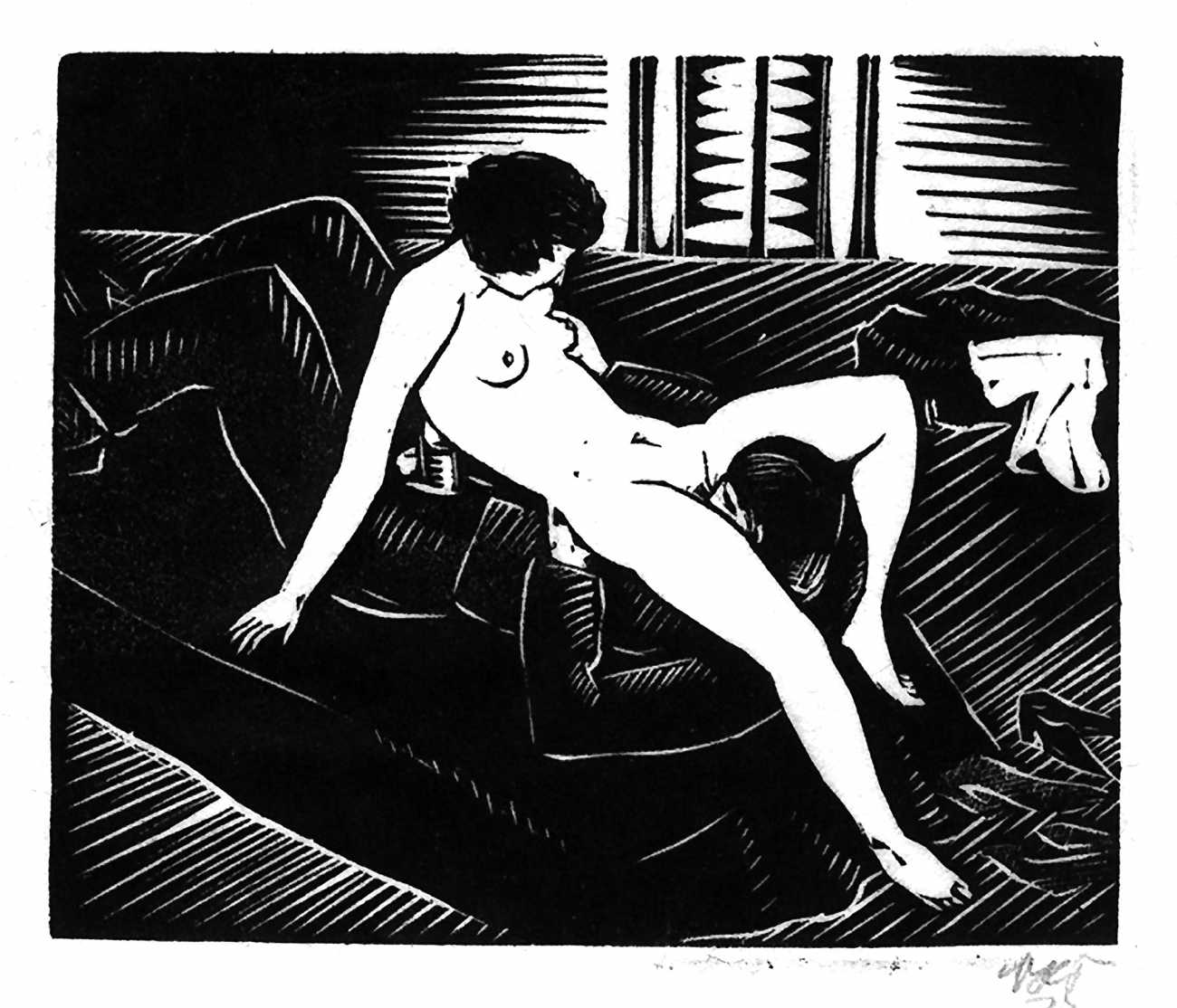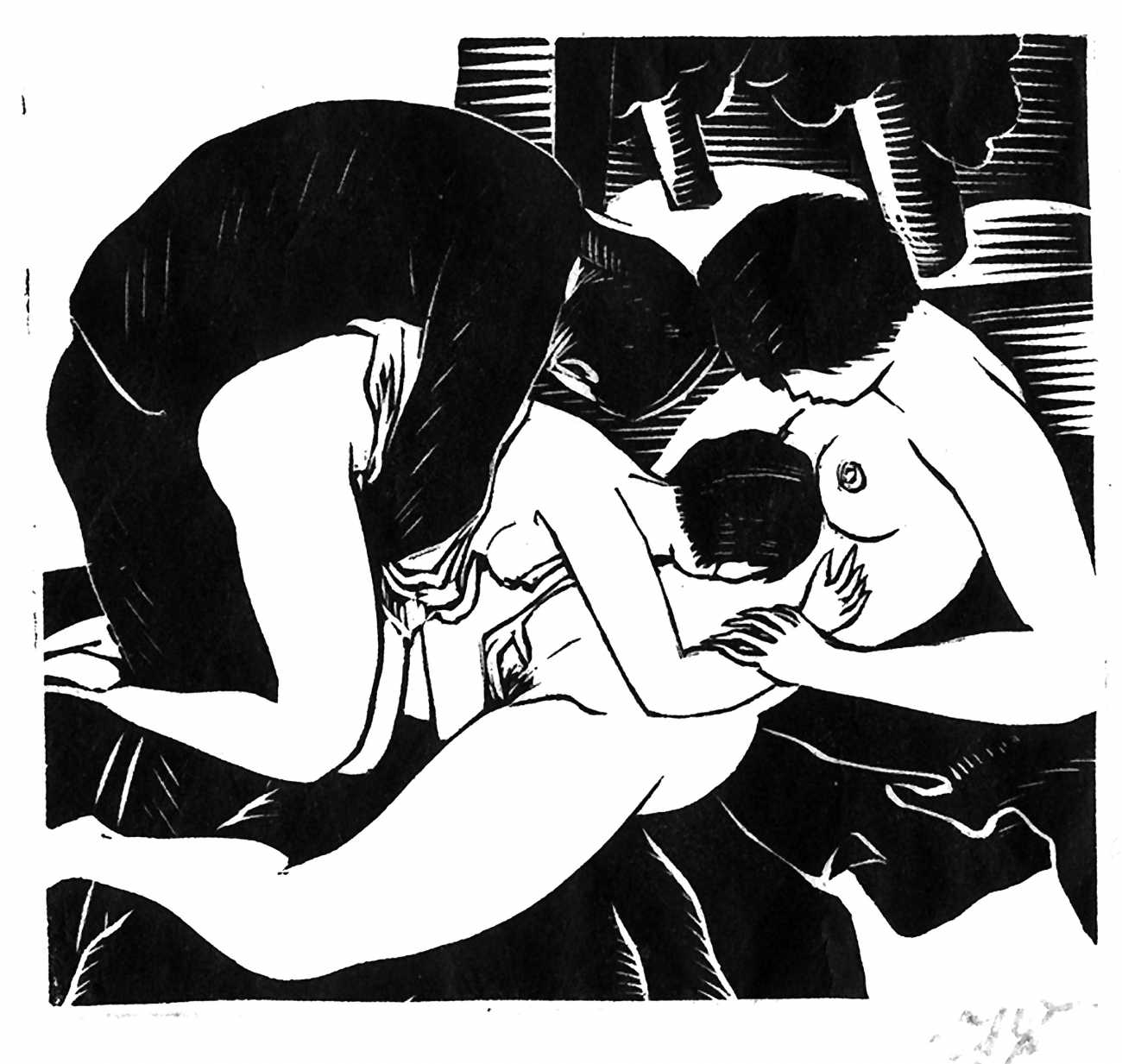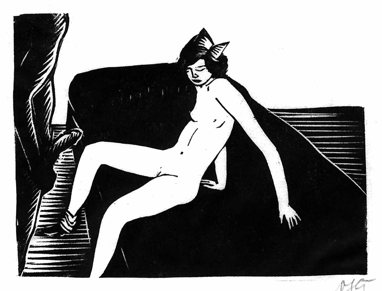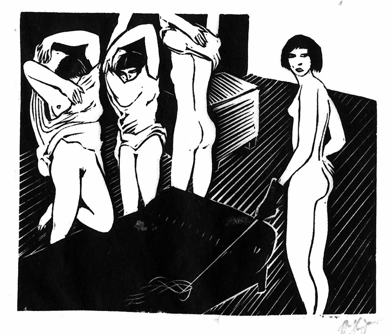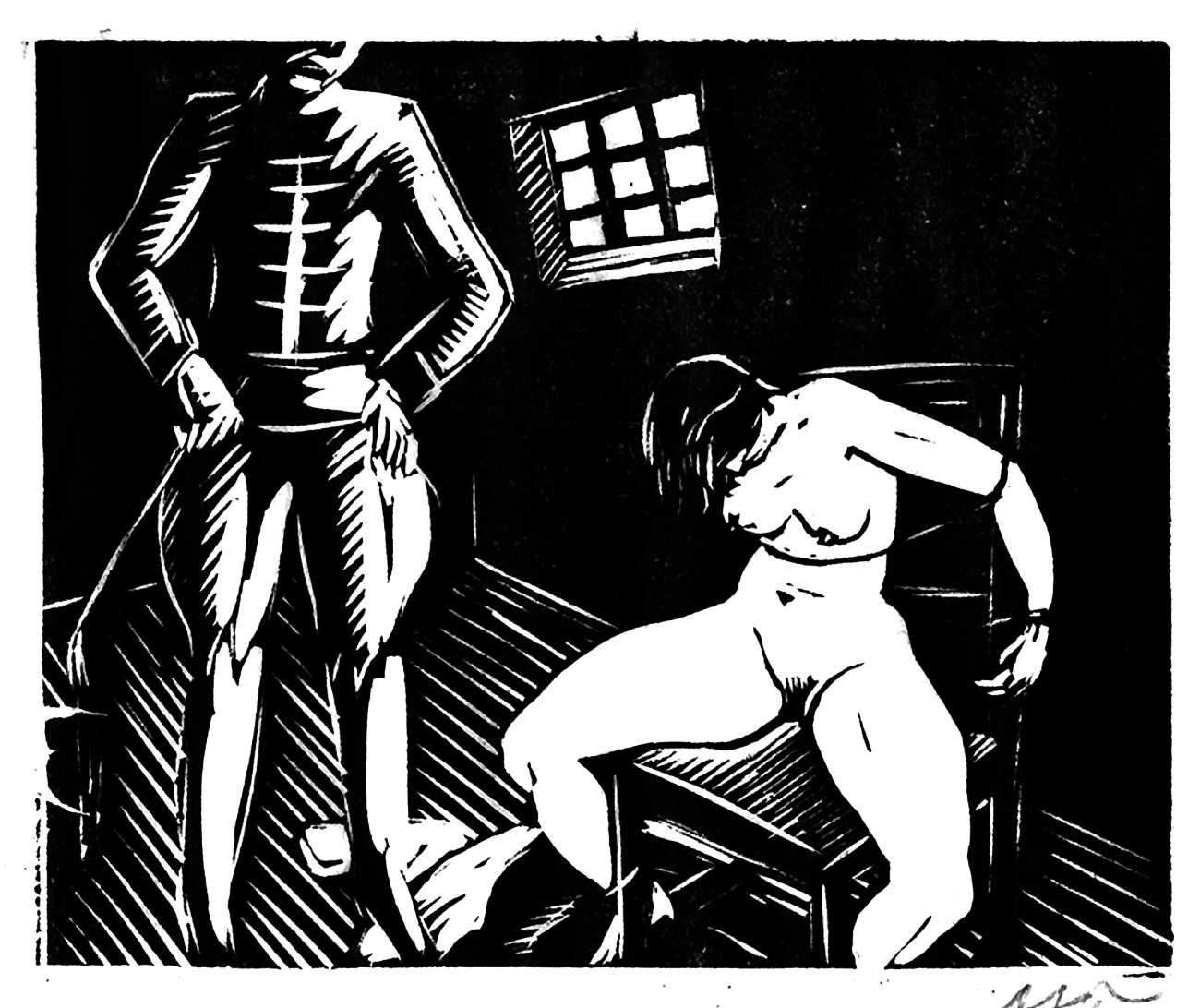 Much less well known are his erotic woodcuts, but it was inevitable that Schatz would regularly combine what was probably his favourite artistic medium with one of his most enduring subjects, sex in general and flagellation in particular. He was undoubtedly active in Vienna’s thriving alternative scene, and through these bold woodcuts was able to match the erotic edge of sexual exploration with the strokes of his experienced chisel. This series of woodcuts with an erotic theme was put together in around 1928.