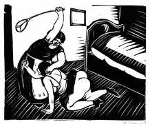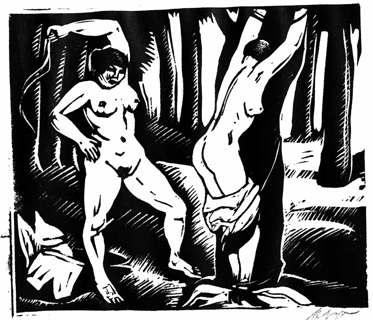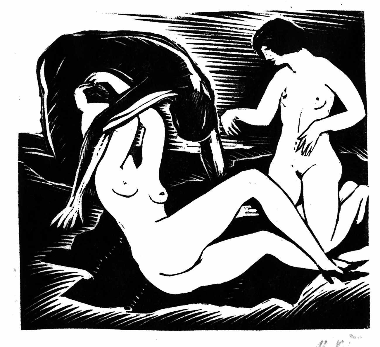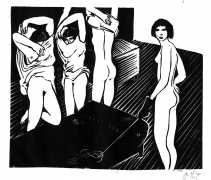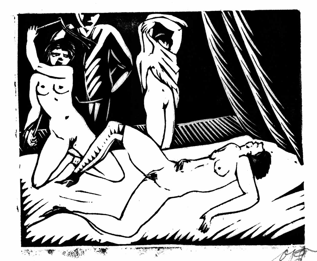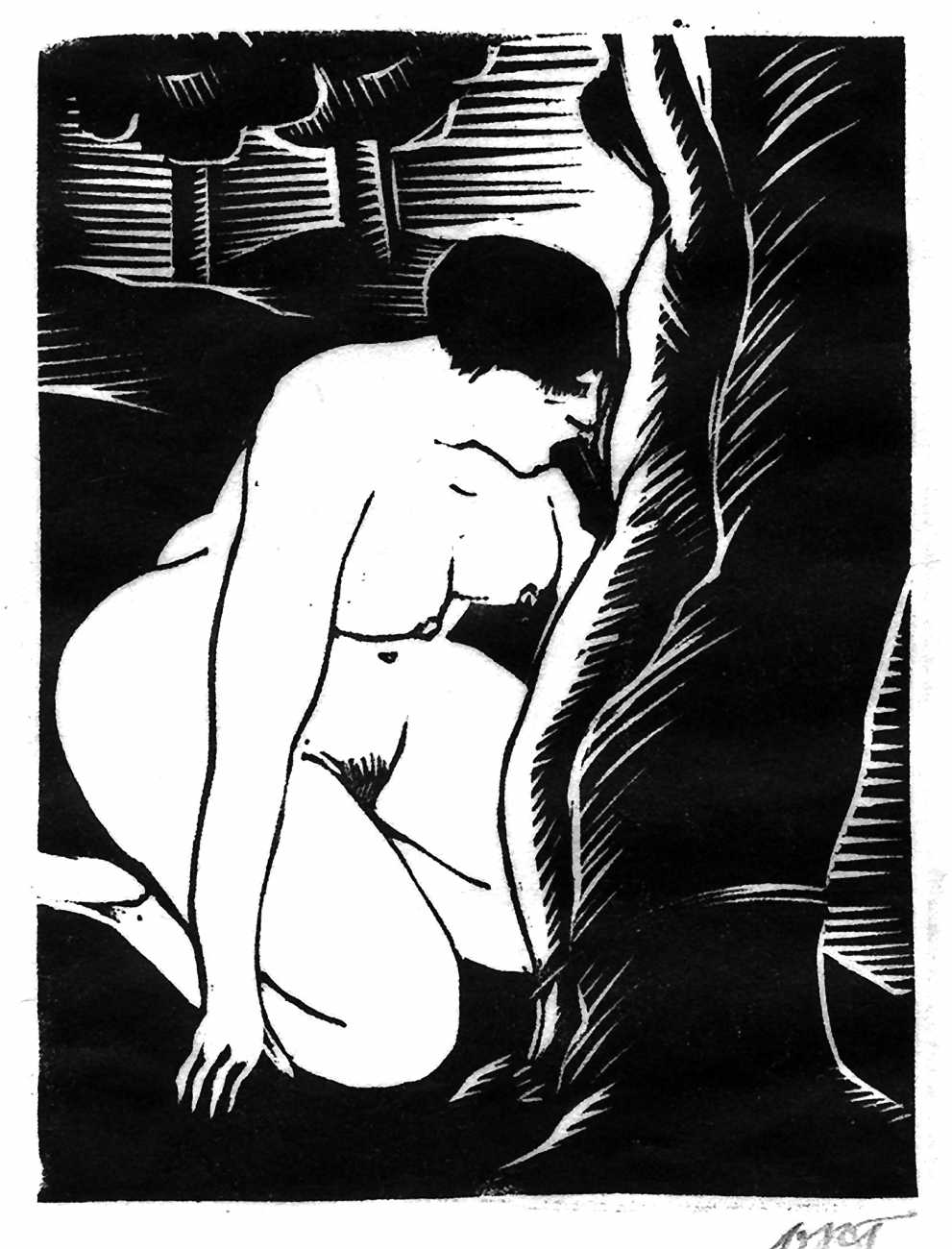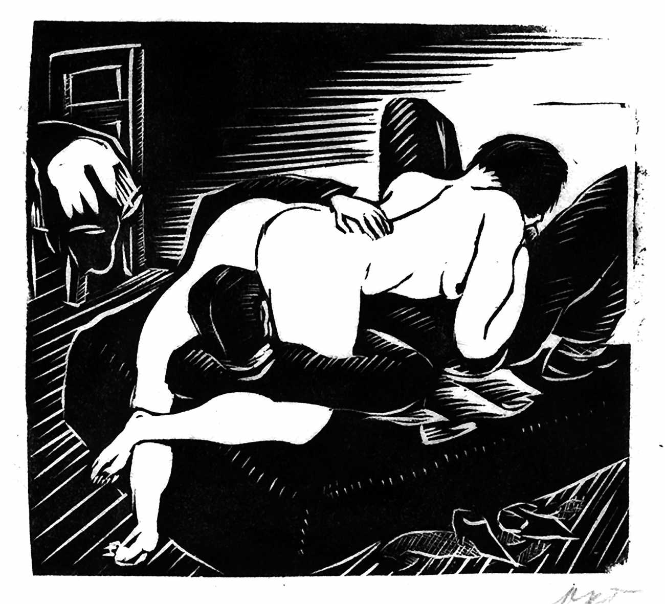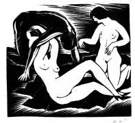 Much less well known are his erotic woodcuts, but it was inevitable that Schatz would regularly combine what was probably his favourite artistic medium with one of his most enduring subjects, sex in general and flagellation in particular. He was undoubtedly active in Vienna’s thriving alternative scene, and through these bold woodcuts was able to match the erotic edge of sexual exploration with the strokes of his experienced chisel. This series of woodcuts with an erotic theme was put together in around 1928.