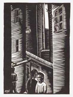 In 1923, Schatz made the acquaintance of the Viennese gallery owner Otto Kallir-Nirenstein, who was one of his most important patrons and continuously presented his woodcuts and paintings in his Neue Galerie. In the same year the Austrian collector Fritz Karpfen published an important study of Austrian art, which included the young Schatz. In the same year he created a portfolio of twelve woodcuts featuring Venice, with a foreword by the art historian Erica Tietze-Conrat, but the highlight of the decade was the 1927 volume Die Neue Stadt (The New City), created for the Berlin-based Gutenberg Book Guild. Die Neue Stadt is a poem by Josef Luitpold, celebrating ‘a city built for the people’; Schatz contributed eleven powerful woodcuts and also produced blocks for the title pages of the book.