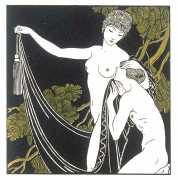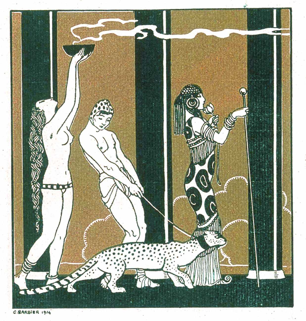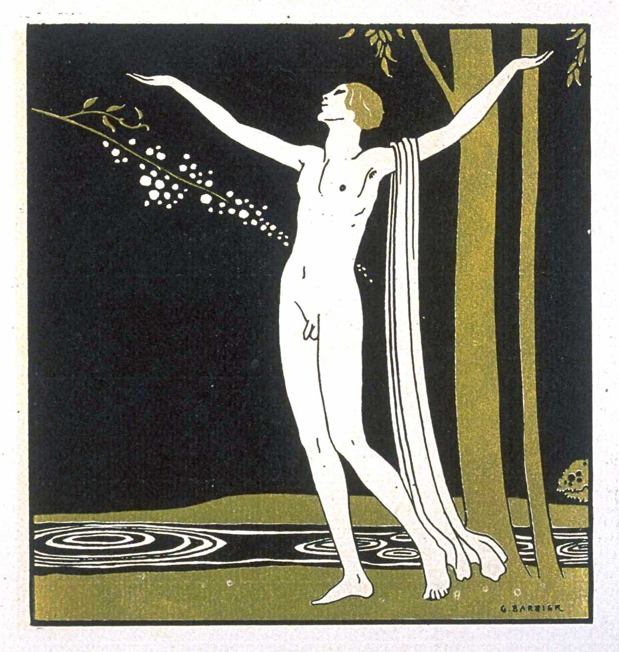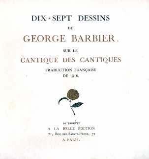 Barbier’s first two illustrated book projects were inspired by theatre and dance – Dessins sur les danses de Vaslav Nijinsky in 1913, and Album dédié à Tamar Karsavina in 1914, but his first illustrated book to include the nude figures which were to become an important element of his work was Dix-sept dessins de George Barbier sur le Cantique des cantiques (Seventeen Designs inspired by The Song of Songs), published by La Belle Édition in 1914 in a print run of 240 copies.