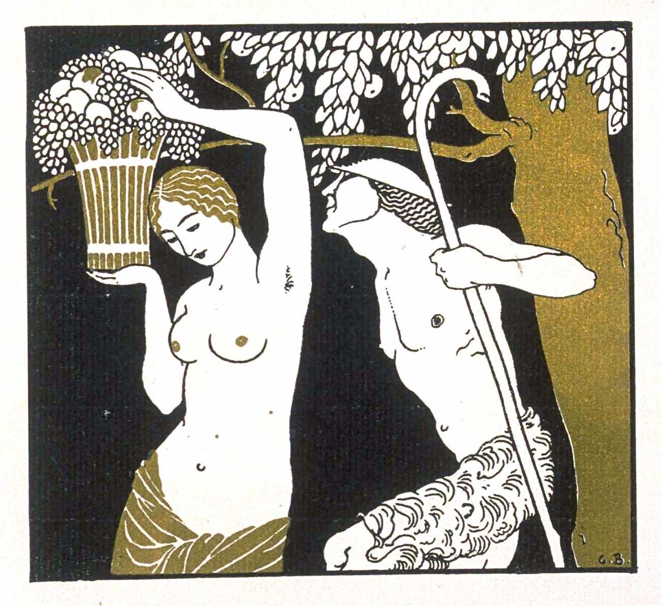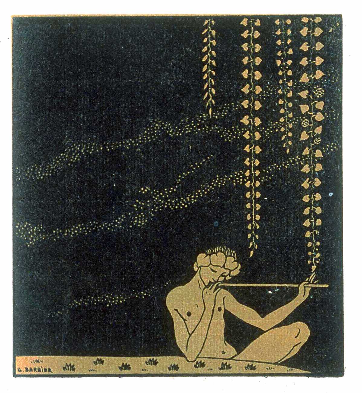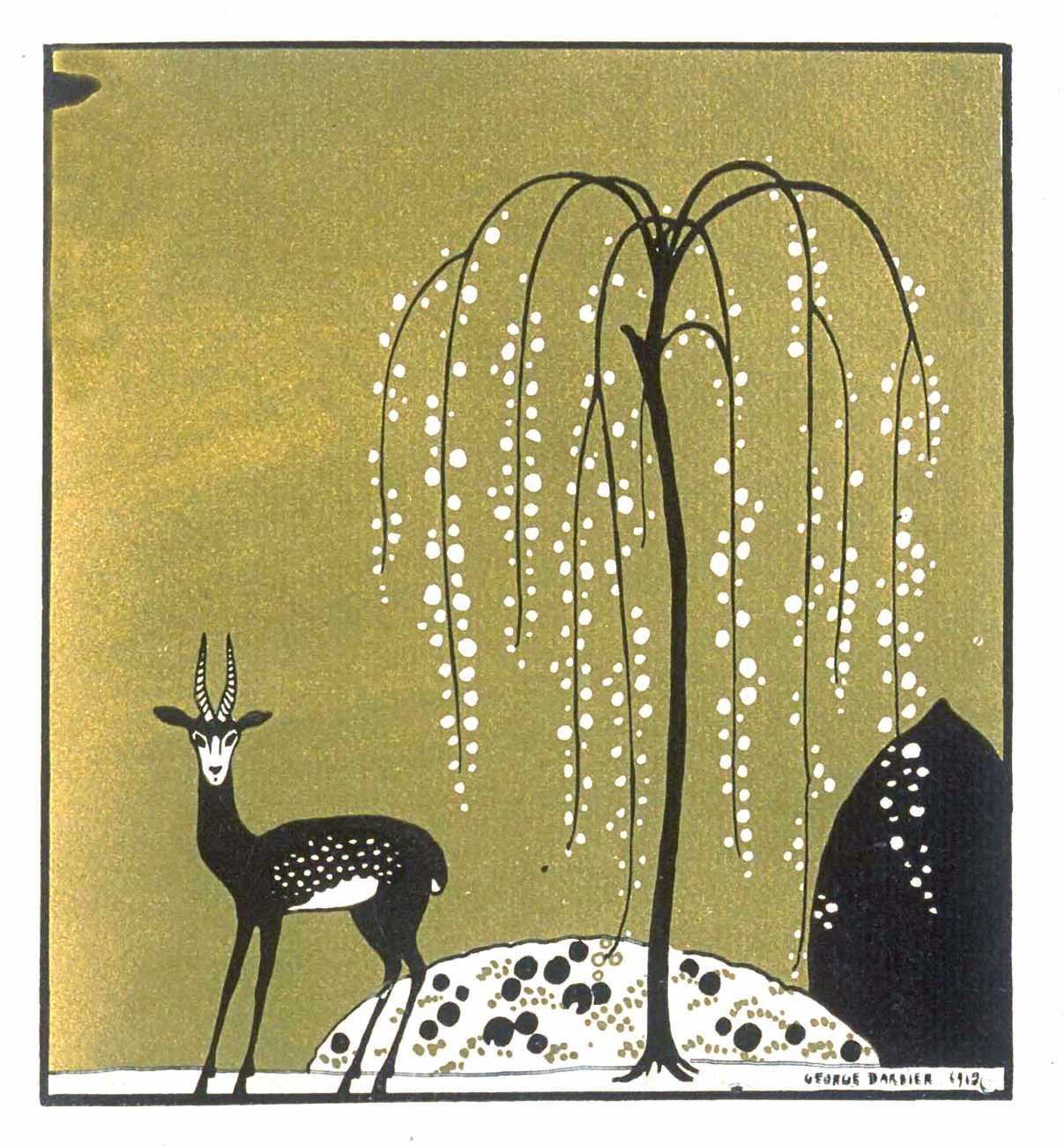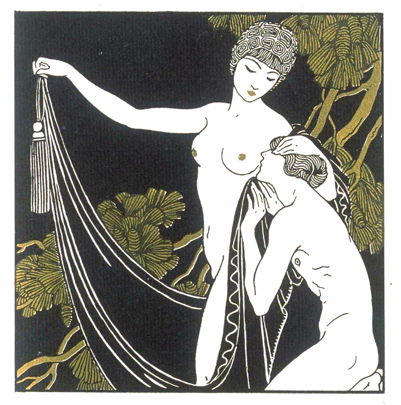 The gold and black illustrations, clearly inspired by Aubrey Beardsley, are printed from wood blocks on heavy paper, and display the elegant simplicity and confidence of line which weould become the hallmark of George Barbier’s output.