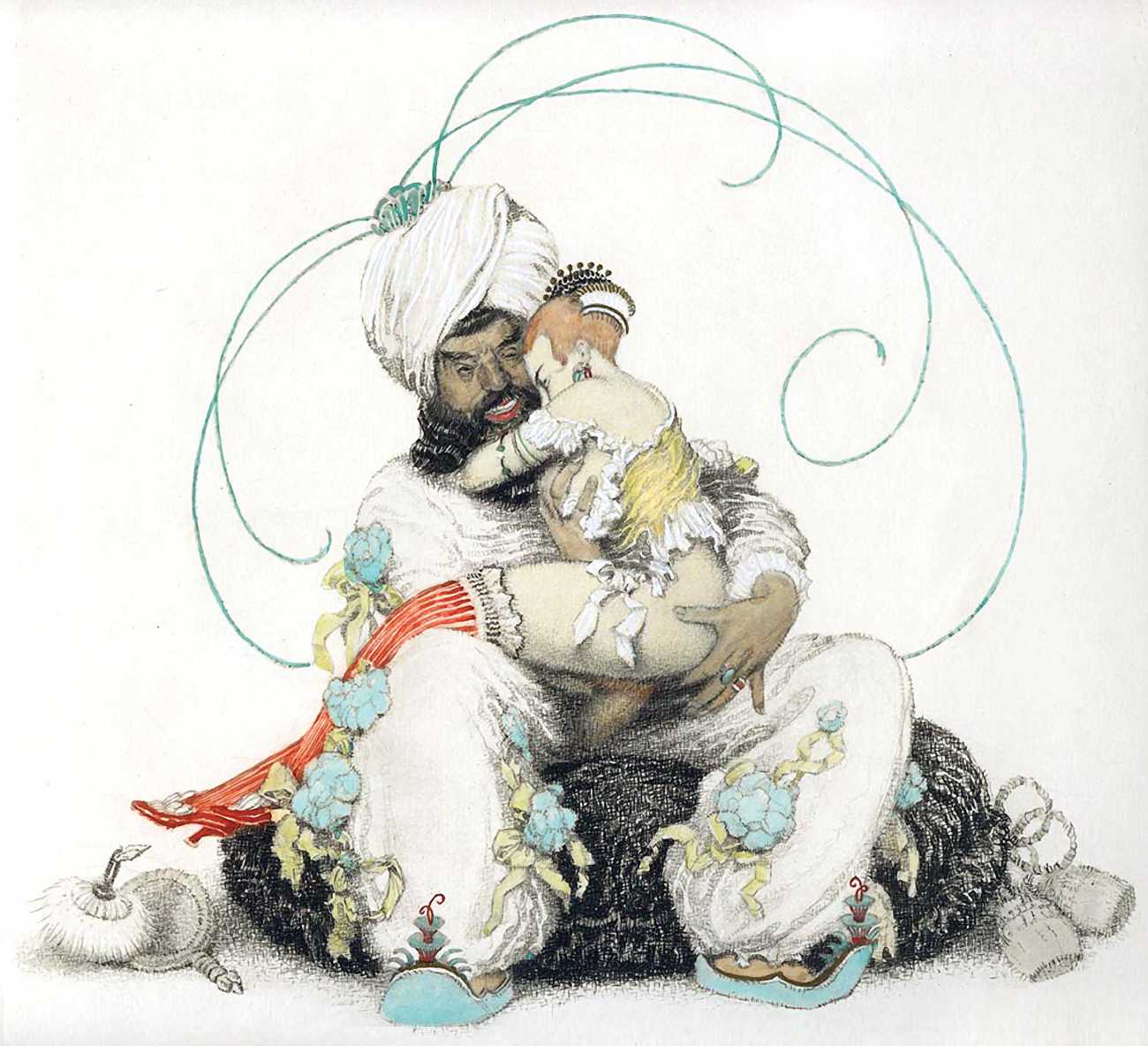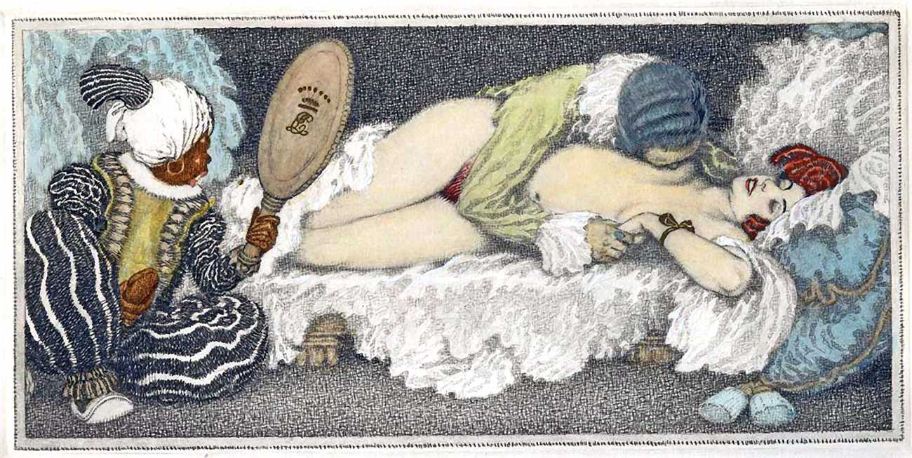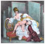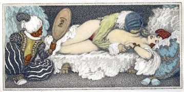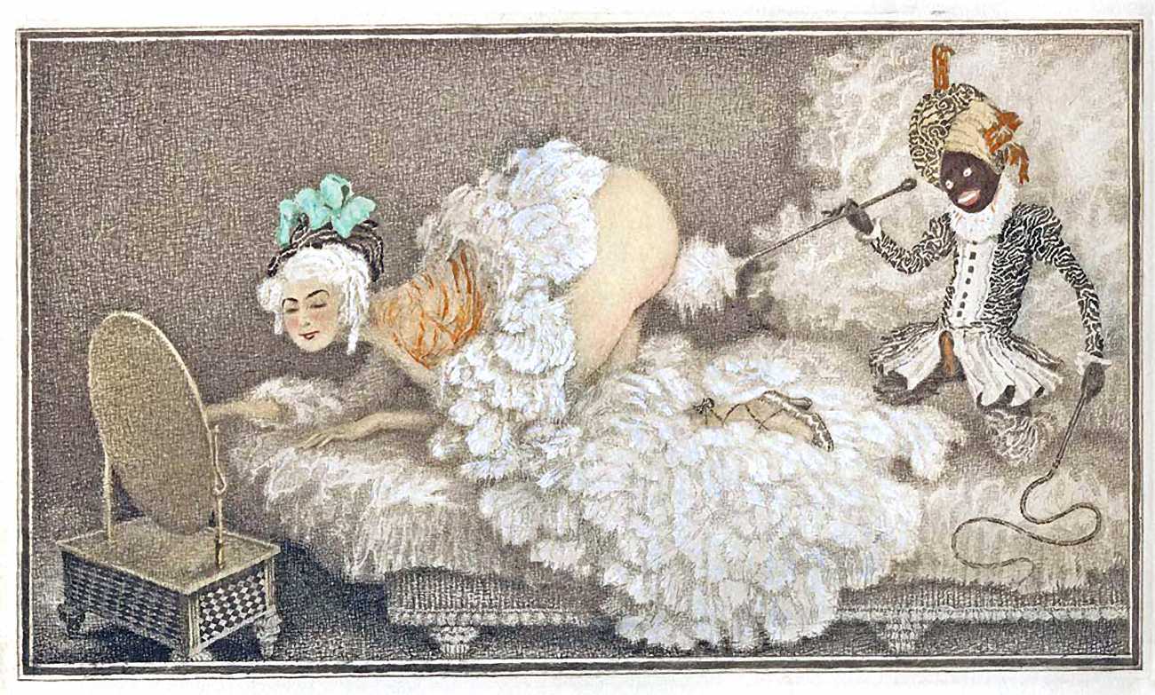 Symbolically in art, flamingos have often represented romantic love, partly because a pair of their intertwined curved necks can be interpreted as a heart, and partly because pink has traditionally been the colour of love. For the engravings included in Der verliebte Flamingo (The Beloved Flamingo) Pellar created a rococo beauty, presumably called Flamingo, who is pictured in colourful flagrante delicto with various suitors, including stylised oriental and black characters – and an actual flamingo. Most of the plates are known in different colour combinations; we have included here two versions of Plates 9 and 5.