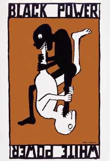 Ungerer’s anger found apt expression in the later part of the decade. When in 1967 a consortium of Columbia University teachers and students rejected a series of seven anti-Vietnam-War posters they had commissioned from him (‘too virulent’ was their verdict), he published them himself, and they found their way into countless dorm rooms nevertheless. Several of these involve images of the Statue of Liberty, a monument created by Frédéric Bartholdi, a Colmar native. In Eat, a diminutive Liberty is being rammed down the throat of a crudely rendered Asian figure; in Kiss for Peace, our Lady of the Harbor is having her ass licked frantically – by another Asian figure. A different poster in the series, of US aircraft dropping gift-wrapped ‘presents’ intermingled with ‘duds’, may remind some viewers of Nancy Spero’s thematically similar but far more ethereal antiwar imagery. Ungerer also published his own hard-hitting posters on the subject of race relations: Black Power/White Power, the best-known of these, shows two emblematic figures in a ‘69’ position, each devouring the other’s phallic leg.