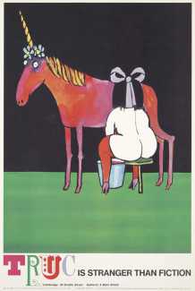 Soon after creating the cocktail party critiques, Ungerer produced some of his very best work, most of it geared to mass communication and commerce. There were ad campaigns for both the New York Times and the Village Voice. There is a clever and saucy poster for the legendary nightclub Electric Circus that has a delicate style denoting an irreverent nod to Saul Steinberg, another of Ungerer’s masters, albeit a contemporary one. There is a charming 1968 poster for Truc, a cult boutique in Cambridge, Mass., wherein a cherubic lady, naked but for a hair ribbon and stockings, is milking a unicorn, with the caption ‘Truc is stranger than fiction’. Ungerer's posters for a 1968 ad campaign promoting the Village Voice are period classics to rival Milton Glaser’s famous 1967 poster for Bob Dylan’s Greatest Hits, an Aubrey Beardsley-esque silhouetted profile of Dylan with multicoloured, hyper-stylised hair.
